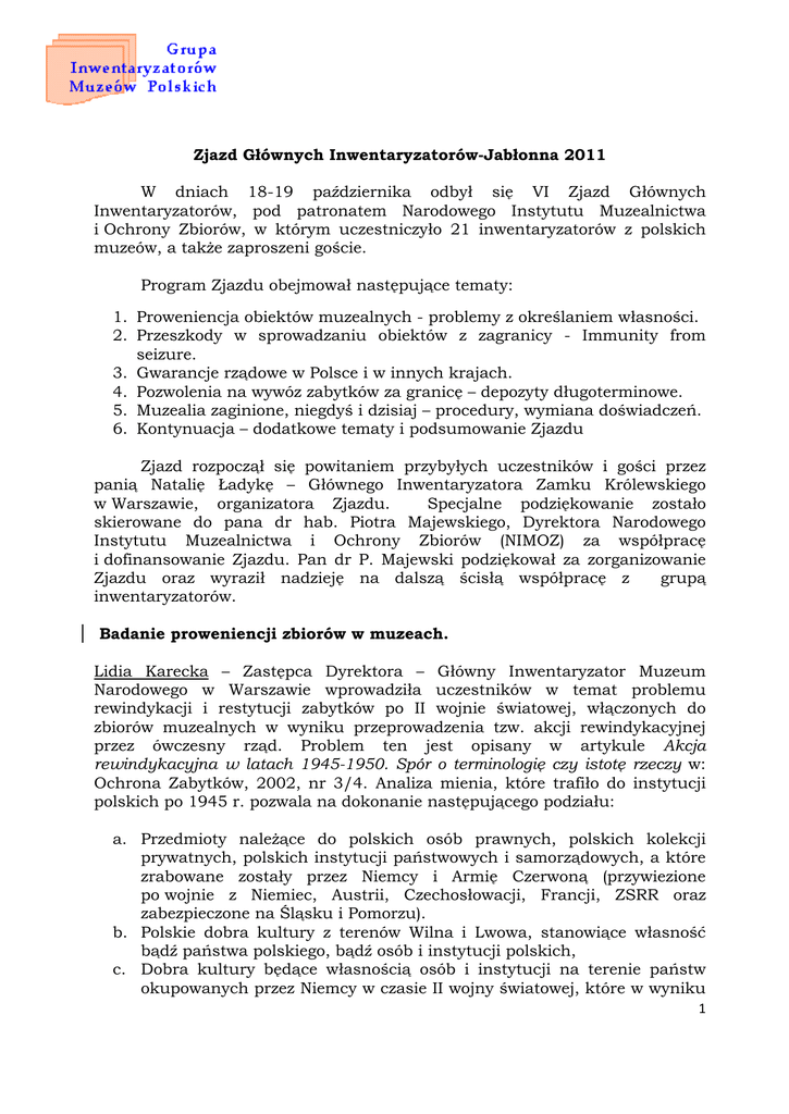 Zjazd Głównych Inwentaryzatorów-Jabłonna 2011 W dniach 18-19 października odbył się VI Zjazd Głównych Inwentaryzatorów, pod patronatem Narodowego Instytutu Muzealnictwa i Ochrony Zbiorów, w którym uczestniczyło 21 inwentaryzatorów z polskich muzeów, a także zaproszeni goście. Program Zjazdu obejmował następujące tematy: 1. Proweniencja obiektów muzealnych - problemy z określaniem własności. 2. Przeszkody w sprowadzaniu obiektów z zagranicy - Immunity from seizure. 3. Gwarancje rządowe w Polsce i w innych krajach. 4. Pozwolenia na wywóz zabytków za granicę – depozyty długoterminowe. 5. Muzealia zaginione, niegdyś i dzisiaj – procedury, wymiana doświadczeń. 6. Kontynuacja – dodatkowe tematy i podsumowanie Zjazdu Zjazd rozpoczął się powitaniem przybyłych uczestników i gości przez panią Natalię Ładykę – Głównego Inwentaryzatora Zamku Królewskiego w Warszawie, organizatora Zjazdu. Specjalne podziękowanie zostało skierowane do pana dr hab. Piotra Majewskiego, Dyrektora Narodowego Instytutu Muzealnictwa i Ochrony Zbiorów (NIMOZ) za współpracę i dofinansowanie Zjazdu. Pan dr P. Majewski podziękował za zorganizowanie Zjazdu oraz wyraził nadzieję na dalszą ścisłą współpracę z grupą inwentaryzatorów. Badanie proweniencji zbiorów w muzeach. Lidia Karecka – Zastępca Dyrektora – Główny Inwentaryzator Muzeum Narodowego w Warszawie wprowadziła uczestników w temat problemu rewindykacji i restytucji zabytków po II wojnie światowej, włączonych do zbiorów muzealnych w wyniku przeprowadzenia tzw. akcji rewindykacyjnej przez ówczesny rząd. Problem ten jest opisany w artykule Akcja rewindykacyjna w latach 1945-1950. Spór o terminologię czy istotę rzeczy w: Ochrona Zabytków, 2002, nr 3/4. Analiza mienia, które trafiło do instytucji polskich po 1945 r. pozwala na dokonanie następującego podziału: a. Przedmioty należące do polskich osób prawnych, polskich kolekcji prywatnych, polskich instytucji państwowych i samorządowych, a które zrabowane zostały przez Niemcy i Armię Czerwoną (przywiezione po wojnie z Niemiec, Austrii, Czechosłowacji, Francji, ZSRR oraz zabezpieczone na Śląsku i Pomorzu). b. Polskie dobra kultury z terenów Wilna i Lwowa, stanowiące własność bądź państwa polskiego, bądź osób i instytucji polskich, c. Dobra kultury będące własnością osób i instytucji na terenie państw okupowanych przez Niemcy w czasie II wojny światowej, które w wyniku 1 rekwizycji nazistowskich przywłaszczono na terenie państw okupowanych przez Niemcy w czasie II wojny światowej, następnie częściowo lokowane w muzeach niemieckich, po wojnie zaś przywiezione do kraju w ramach działań akcji rewindykacyjnej z innych państw europejskich oraz zabezpieczone na Ziemiach Zachodnich. d. Dobra kultury rekwirowane przez nazistów osobom pochodzenia żydowskiego (trafiły one do niemieckich zbiorów muzealnych lub prywatnych zbiorów nazistów), po wojnie przywiezione z Niemiec, Austrii, ZSRR oraz zabezpieczone na Ziemiach Zachodnich. e. Niemieckie dobra kultury instytucji państwowych i samorządowych oraz osób prywatnych, zabezpieczone w niemieckich składnicach na terenie Śląska i Pomorza; f. Dobra kultury osób prywatnych i instytucji niemieckich z miasta Gdańska, w tym mienie osób prawnych prawa publicznego, takich jak osoby prawne kościelne (głównie z kościołów protestanckich ale i własności niemieckich gmin żydowskich), g. Mienie właścicieli majątków ziemskich, przejęte przez władze administracyjne podczas przeprowadzania reformy rolnej, które w części trafiło do muzeów. Zdaniem p. Kareckiej działania resortu kultury prowadzone w zakresie digitalizacji zbiorów również muzealnych przyczyni się do wirtualnego łączenia rozproszonych w wyniku działań wojennych kolekcji, za pośrednictwem portali krajowych i europejskich. Obecnie dzieje się to już na portalu www.europeana.eu, gdzie można znaleźć zbiory znajdujące się w różnych instytucjach, wcześniej stanowiące kolekcje. Zofia Bandurska z Muzeum Narodowego we Wrocławiu przedstawiła proces poznawania historii zbiorów ok. 60 muzeów z terenów Śląska od 1815 do roku 1945 r., poprzez badania archiwaliów (art. Archiwalia Dawnych Muzeów Sztuki we Wrocławiu w Rocznikach Sztuki Śląskiej XIX w., Wrocław 2010, s.153-176.). Pani Z. Bandurska pokazała znaczenie właściwego odczytywania treści nalepek, czy innych napisów umieszczonych na muzealiach w odtwarzaniu historii danego dzieła. Dokonała tego na podstawie omówienia kilku przykładów przedwojennych instytucji, takich jak: Królewskie Muzeum Sztuki i Starożytności na wyspie Piaskowej we Wrocławiu – dawne księgi inwentarzowe, 4-tomowy katalog zbiorów; Dawne Muzeum Sztuki Miasta Wrocławia, Śląskie Muzeum Przemysłu Artystycznego i Starożytności, Śląskie Muzeum Sztuk Pięknych; Archiwum Państwowe i jego zbiory; Biblioteka Uniwersytecka – gabinet archiwaliów. Roman Olkowski, specjalista ds. badania proweniencji w Muzeum Narodowym w Warszawie, poprzez przygotowaną prezentację potwierdził, jak ważne jest systematyczne badanie dokumentacji archiwalnej dla uzyskania wiedzy o historii „wędrowania” dzieł sztuki. Temat ten został omówiony 2 na przykładzie procesu ustalenia proweniencji obrazów: M. Seidenbeutla „Martwa natura”, i „Portretu Fryderyka Moszyńskiego” Józefa Grassiego. Obraz „Martwa natura” M. Seidenbeutla pochodzi z Państwowych Zbiorów Sztuki, obecnie jest własnością Muzeum Narodowego w Warszawie, został omyłkowo zaewidencjonowany jako własność Muzeum Sztuki w Łodzi. Na przykładzie dociekania losów wspomnianego obrazu przedstawił warsztat badacza proweniencji, którego najważniejszymi elementami są: dokumentacja ewidencyjna: księgi inwentarzowe, karty ewidencyjne (naukowe, magazynowe), dokumenty dotyczące nabycia danego muzealiom, ( dary, zakupy, przekazy) dokumentacja podręczna