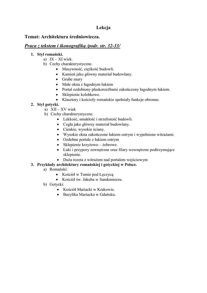 Lekcja Temat: Architektura średniowiecza. Praca z tekstem i ikonografiką /podr. str. 32-33/ 1. Styl romański. a) IX – XI wiek. b) Cechy charakterystyczne. Masywność, ciężkość budowli. Kamień jako główny materiał budowlany. Grube mury Małe okna z łagodnym łukiem Portal ozdobiony płaskorzeźbami zakończony łagodnym łukiem. Sklepienie kolebkowe. Klasztory i kościoły romańskie spełniały funkcje obronne. 2. Styl gotycki. a) XII – XV wiek b) Cechy charakterystyczne. Lekkość, smukłość i strzelistość budowli. Cegła jako główny materiał budowlany. Cienkie, wysokie ściany. Wysokie okna zakończone łukiem ostrym i wypełnione witrażami. Ozdobne portale z łukiem ostrym Sklepienie krzyżowo – żebrowe. Łuki i przypory zewnętrzne oraz filary wewnętrzne podtrzymujące sklepienie. Duża rozeta z witrażem nad portalem wejściowym 3. Przykłady architektury romańskiej i gotyckiej w Polsce. a) Romański: Kościół w Tumie pod Łęczycą. Kościół św. Jakuba w Sandomierzu. b) Gotycki: Kościół Mariacki w Krakowie. Bazylika Mariacka w Gdańsku.