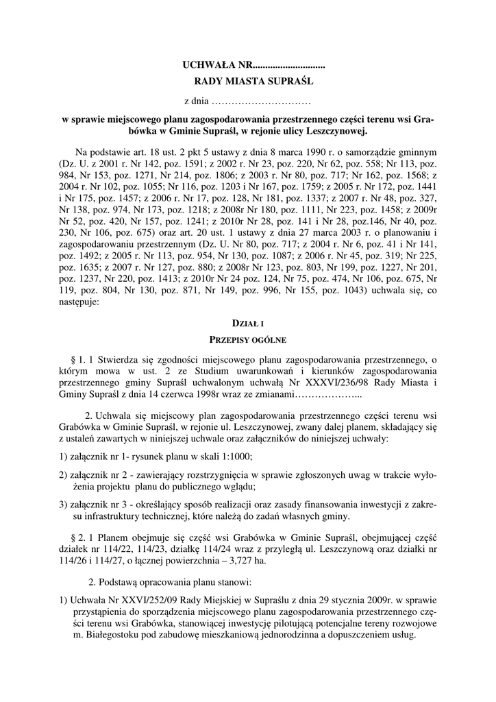 UCHWAŁA NR............................. RADY MIASTA SUPRAŚL z dnia ………………………… w sprawie miejscowego planu zagospodarowania przestrzennego części terenu wsi Grabówka w Gminie Supraśl, w rejonie ulicy Leszczynowej. Na podstawie art. 18 ust. 2 pkt 5 ustawy z dnia 8 marca 1990 r. o samorządzie gminnym (Dz. U. z 2001 r. Nr 142, poz. 1591; z 2002 r. Nr 23, poz. 220, Nr 62, poz. 558; Nr 113, poz. 984, Nr 153, poz. 1271, Nr 214, poz. 1806; z 2003 r. Nr 80, poz. 717; Nr 162, poz. 1568; z 2004 r. Nr 102, poz. 1055; Nr 116, poz. 1203 i Nr 167, poz. 1759; z 2005 r. Nr 172, poz. 1441 i Nr 175, poz. 1457; z 2006 r. Nr 17, poz. 128, Nr 181, poz. 1337; z 2007 r. Nr 48, poz. 327, Nr 138, poz. 974, Nr 173, poz. 1218; z 2008r Nr 180, poz. 1111, Nr 223, poz. 1458; z 2009r Nr 52, poz. 420, Nr 157, poz. 1241; z 2010r Nr 28, poz. 141 i Nr 28, poz.146, Nr 40, poz. 230, Nr 106, poz. 675) oraz art. 20 ust. 1 ustawy z dnia 27 marca 2003 r. o planowaniu i zagospodarowaniu przestrzennym (Dz. U. Nr 80, poz. 717; z 2004 r. Nr 6, poz. 41 i Nr 141, poz. 1492; z 2005 r. Nr 113, poz. 954, Nr 130, poz. 1087; z 2006 r. Nr 45, poz. 319; Nr 225, poz. 1635; z 2007 r. Nr 127, poz. 880; z 2008r Nr 123, poz. 803, Nr 199, poz. 1227, Nr 201, poz. 1237, Nr 220, poz. 1413; z 2010r Nr 24 poz. 124, Nr 75, poz. 474, Nr 106, poz. 675, Nr 119, poz. 804, Nr 130, poz. 871, Nr 149, poz. 996, Nr 155, poz. 1043) uchwala się, co następuje: DZIAŁ I PRZEPISY OGÓLNE § 1. 1 Stwierdza się zgodności miejscowego planu zagospodarowania przestrzennego, o którym mowa w ust. 2 ze Studium uwarunkowań i kierunków zagospodarowania przestrzennego gminy Supraśl uchwalonym uchwałą Nr XXXVI/236/98 Rady Miasta i Gminy Supraśl z dnia 14 czerwca 1998r wraz ze zmianami………………... 2. Uchwala się miejscowy plan zagospodarowania przestrzennego części terenu wsi Grabówka w Gminie Supraśl, w rejonie ul. Leszczynowej, zwany dalej planem, składający się z ustaleń zawartych w niniejszej uchwale oraz załączników do niniejszej uchwały: 1) załącznik nr 1- rysunek planu w skali 1:1000; 2) załącznik nr 2 - zawierający rozstrzygnięcia w sprawie zgłoszonych uwag w trakcie wyłożenia projektu planu do publicznego wglądu; 3) załącznik nr 3 - określający sposób realizacji oraz zasady finansowania inwestycji z zakresu infrastruktury technicznej, które należą do zadań własnych gminy. § 2. 1 Planem obejmuje się część wsi Grabówka w Gminie Supraśl, obejmującej część działek nr 114/22, 114/23, działkę 114/24 wraz z przyległą ul. Leszczynową oraz działki nr 114/26 i 114/27, o łącznej powierzchnia – 3,727 ha. 2. Podstawą opracowania planu stanowi: 1) Uchwała Nr XXVI/252/09 Rady Miejskiej w Supraślu z dnia 29 stycznia 2009r. w sprawie przystąpienia do sporządzenia miejscowego planu zagospodarowania przestrzennego części terenu wsi Grabówka, stanowiącej inwestycję pilotującą potencjalne tereny rozwojowe m. Białegostoku pod zabudowę mieszkaniową jednorodzinna a dopuszczeniem usług. 2 2) Studium uwarunkowań i kierunków zagospodarowania przestrzennego gminy Supraśl przyjęte uchwałą Nr XXXVI/236/98 Rady Miasta i Gminy Supraśl wraz ze zmianami………………….. § 3. Przedmiotem planu są ustalenia, zawarte w art. 15 ust. 2 ustawy z dnia 27 marca 2003r o planowaniu i zagospodarowaniu przestrzennym (Dz. U. Nr 80, poz. 717 z póż. zm.): 1) przeznaczenie terenów, parametry i wskaźniki kształtowania zabudowy oraz zagospodarowania terenu, w tym linie zabudowy, gabaryty obiektów i wskaźniki intensywności zabudowy – Rozdział 1; 2) zasady ochrony i kształtowania ładu przestrzennego - Rozdział – 2; 3) zasady ochrony środowiska, przyrody i krajobrazu kulturowego – Rozdział 3; 4) zasady ochrony dziedzictwa kulturowego i zabytków oraz dóbr kultury współczesnej – Rozdział 4; 5) wymagania wynikające z potrzeb kształtowania przestrzeni publicznych – Rozdział 5; 6) granice i sposoby zagospodarowania terenów lub obiektów podlegających ochronie, ustalonych na podstawie odrębnych przepisów – Rozdział 6; 7) szczegółowe zasady i warunki scalania i podziału nieruchomości objętych planem miejscowym – Rozdział 7; 8) szczegółowe warunki zagospodarowania terenów oraz ograniczenia w ich użytkowaniu, w tym zakaz zabudowy – Rozdział 8; 9) zasady modernizacji, rozbudowy i budowy systemów komunikacji i infrastruktury technicznej – Rozdział 9; 10) sposoby i terminy tymczasowego zagospodarowania i urządzania i użytkowania terenów – Rozdział 10; 11) naliczanie jednorazowej opłaty z tytułu wzrostu wartości nieruchomości w związku z uchwaleniem planu - Rozdział 11. § 4. Przeznaczenie gruntów leśnych na cele nieleśne - w granicach planu - na podstawie zgody uzyskanej do Marszałka Województwa – DMG.III.7230-44/10 z dnia 10.11.2010r. § 5. 1. Ilekroć w przepisach niniejszej uchwały jest mowa bez bliższego określenia o: 1) planie – należy przez to rozumieć plan, o którym mowa w § 1 ust. 2 uchwały, jeśli z treści przepisów nie wynika inaczej; 2) uchwale – należy przez to rozumieć niniejszą uchwałę; 3) przepisów szczególnych i odrębnych – należy przez to rozumieć przepisy ustaw wraz z aktami wykonawczymi; 4) rysunku planu – należy przez to rozumieć rysunek planu stanowiący załącznik nr 1 do niniejszej uchwały, sporządzony na mapie w skali 1:1000; 5) linii rozgraniczającej - należy przez to rozumieć linię oddzielającą tereny o różnych funkcjach lub różnych zasadach zagospodarowania; 2010-11-24 11:43:00 3 6) nieprzekraczalnej linii zabudowy - należy przez to rozumieć linię, której nie możne przekroczyć ściana /lico/ budynku w kierunku ulicy, sąsiedniego terenu lub sąsiedniej działki z zastrzeżeniem ust. 3 pkt. 5; 7) terenie - należy przez to rozumieć obszar o określonym przeznaczeniu, wyznaczony na rysunku planu liniami rozgraniczającymi; 8) dachach dwu i wielospadowych 