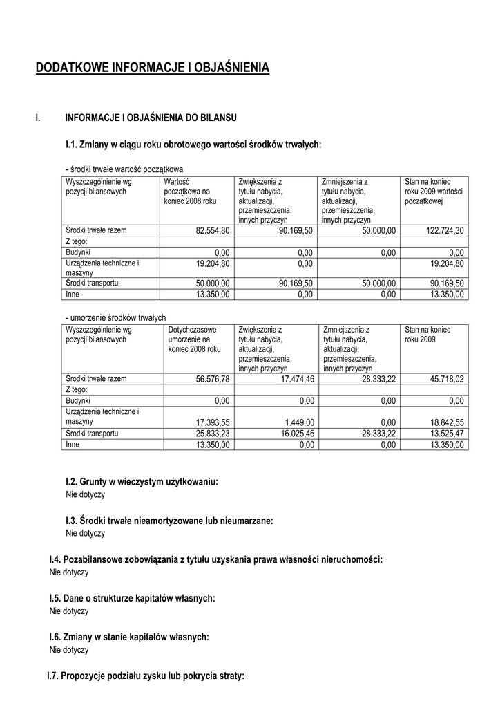 DODATKOWE INFORMACJE I OBJAŚNIENIA I. INFORMACJE I OBJAŚNIENIA DO BILANSU I.1. Zmiany w ciągu roku obrotowego wartości środków trwałych: - środki trwałe wartość początkowa Wyszczególnienie wg pozycji bilansowych Wartość początkowa na koniec 2008 roku Środki trwałe razem Z tego: Budynki Urządzenia techniczne i maszyny Środki transportu Inne Zwiększenia z tytułu nabycia, aktualizacji, przemieszczenia, innych przyczyn Zmniejszenia z tytułu nabycia, aktualizacji, przemieszczenia, innych przyczyn Stan na koniec roku 2009 wartości początkowej 82.554,80 90.169,50 50.000,00 122.724,30 0,00 19.204,80 0,00 0,00 0,00 0,00 19.204,80 50.000,00 13.350,00 90.169,50 0,00 50.000,00 0,00 90.169,50 13.350,00 - umorzenie środków trwałych Wyszczególnienie wg pozycji bilansowych Środki trwałe razem Z tego: Budynki Urządzenia techniczne i maszyny Środki transportu Inne Dotychczasowe umorzenie na koniec 2008 roku Zwiększenia z tytułu nabycia, aktualizacji, przemieszczenia, innych przyczyn Zmniejszenia z tytułu nabycia, aktualizacji, przemieszczenia, innych przyczyn Stan na koniec roku 2009 56.576,78 17.474,46 28.333,22 45.718,02 0,00 0,00 0,00 0,00 17.393,55 25.833,23 13.350,00 1.449,00 16.025,46 0,00 0,00 28.333,22 0,00 18.842,55 13.525,47 13.350,00 I.2. Grunty w wieczystym użytkowaniu: Nie dotyczy I.3. Środki trwałe nieamortyzowane lub nieumarzane: Nie dotyczy I.4. Pozabilansowe zobowiązania z tytułu uzyskania prawa własności nieruchomości: Nie dotyczy I.5. Dane o strukturze kapitałów własnych: Nie dotyczy I.6. Zmiany w stanie kapitałów własnych: Nie dotyczy I.7. Propozycje podziału zysku lub pokrycia straty: Dodatkowe informacje i objaśnienia – 2009 rok Proponuje się przeznaczyć zysk w kwocie 160.435,83 zł na działalność statutową. I.8. Dane o stanie rezerw: Nie dotyczy I.9. Zmiany w stanie odpisów aktualizujących należności krótkoterminowe: a) Należności krótkoterminowe Lp. Tytuł 1. Należności od pozostałych jednostek, z tego: Z tytułu dostaw i usług, w tym w okresie spłaty a) Stan na 31.12.2008 Odpisy Wartość aktualizujące netto Wartość brutto Wartość brutto Stan na 31.12.2009 Odpisy Wartość aktualizujące netto 2.310,00 0,00 2.310,00 0,00 0,00 0,00 2.310,00 0,00 2.310,00 0,00 0,00 0,00 2.310,00 0,00 2.310,00 0,00 0,00 0,00 0,00 0,00 0,00 0,00 0,00 0,00 0,00 0,00 0,00 0,00 0,00 0,00 0,00 0,00 0,00 0,00 0,00 0,00 0,00 2.310,00 0,00 0,00 0,00 2.310,00 0,00 0,00 0,00 0,00 0,00 0,00 - do 12 miesięcy - powyżej 12 miesięcy b) Z tytułu podatków, dotacji, ceł, ubezpieczeń społecznych oraz innych świadczeń c) d) Inne Dochodzone na drodze sądowej RAZEM b) Należności krótkoterminowe według wieku na 31.12.2009 Lp. I. 1. 2. 3. 4. 5. 6. 7. 8. 9. Wiek w dniach Od pozostałych jednostek Z tytułu dostaw i usług (brutto) Z tytułu dostaw i usług (odpisy) Z tytułu dostaw i usług (netto) Inne (brutto) Inne (odpisy) Inne (netto) Dochodzone na drodze sądowej (brutto) Dochodzone na drodze sądowej (odpisy) Dochodzone na drodze sądowej (netto) 0-90 90-180 180-360 Powyżej 360 Razem 0,00 0,00 0,00 0,00 0,00 0,00 0,00 0,00 0,00 0,00 0,00 0,00 0,00 0,00 0,00 c) Zmiany w stanie odpisów aktualizujących należności krótkoterminowe (wg tytułów należności) Nie dotyczy 2 Dodatkowe informacje i objaśnienia – 2009 rok I.10. Podział zobowiązań długoterminowych według pozycji bilansu o pozostałym od dnia bilansowego, przewidywanym umową, okresie spłaty: Okres wymagalności do 1 roku Zobowiązania wobec od 1 do 3 lat Razem od 3 do 5 lat powyżej 5 lat Pocz. roku Koniec roku Pocz. roku Koniec roku Pocz. roku Koniec roku Pocz. roku Koniec roku Pocz. roku Koniec roku 0,00 0,00 0,00 0,00 0,00 0,00 0,00 0,00 0,00 0,00 1. Jednostek powiązanych 2. Pozostałych jednostek: a) kredyty i pożyczki b) …… i) inne Razem: I.11. Rozliczenia międzyokresowe: Wyszczególnienie 1. Czynne rozliczenia międzyokresowe kosztów - polisy ubezpieczeniowe 2. Rozliczenia międzyokresowe przychodów Wartość na koniec 2008 roku Wartość na koniec 2009 roku 1.084,44 1.084,44 0,00 1.216,75 1.216,75 0,00 I.12. Zobowiązania zabezpieczone na majątku: Nie dotyczy I.13. Zobowiązania warunkowe: Nie dotyczy II. INFORMACJE I OBJAŚNIENIA DO RACHUNKU ZYSKÓW I STRAT II.1. Struktura zrealizowanych przychodów. w zł i gr Wyszczególnienie Przychody razem z tego: 1. Przychody działalności statutowej pożytku publicznego: - odpłatnej - nieodpłatnej Przychody za rok: poprzedni % struktury kwota 397.310,58 100,00 obrotowy % struktury kwota 497.635,43 100,00 397.310,58 100,00 467.631,35 93,97 0,00 0,00 0,00 0,00 397.310,58 100,00 467.631,35 93,97 2. Pozostałe przychody 0,00 0,00 30.004,08 6,03 3. Przychody finansowe 0,00 0,00 0,00 0,00 4. Zyski nadzwyczajne 0,00 0,00 0,00 0,00 3 Dodatkowe informacje i objaśnienia – 2009 rok II.2. Struktura kosztów działalności: w zł i gr Wyszczególnienie Koszty razem z tego: 1. Koszty realizacji działalności statutowej pożytku publicznego: Koszty za rok: poprzedni % struktury kwota 282.822,33 100,00 243.310,63 86,03 274.365,74 81,37 0,00 0,00 0,00 0,00 243.310,63 86,03 274.365,74 81,37 39.400,97 13,93 40.733,38 12,08 - odpłatnej - nieodpłatnej obrotowy % struktury kwota 337.199,60 100,00 2. Koszty ogólnoadministracyjne 3. Pozostałe koszty 2,50 0,00 22.100,48 6,55 4. Koszty finansowe 108,23 0,04 0,00 0,00 5. Straty nadzwyczajne 0,00 0,00 0,00 0,00 Przychody Stowarzyszenie obejmują środki pieniężne ze źródeł określonych przepisami prawa i statutem, w tym otrzymane składki, przychody finansowe, dotacje i subwencje. Stowarzyszenie prowadzi ewidencję kosztów w układzie rodzajowym oraz sporządza rachunek zysków i strat w układzie porównawczym. II.3. Odpisy aktualizujące środki trwałe: Nie dotyczy II.4. Odpisy aktualizujące wartość zapasów: Nie dotyczy II.5. Informacje o przychodach, kosztach i wynikach działalności zaniechanej w ciągu roku obrotowego lub przewidzianej do zaniechani