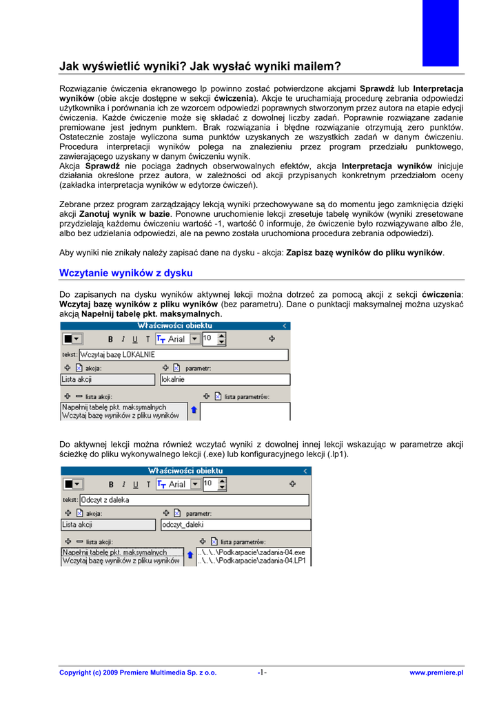 Jak wyświetlić wyniki? Jak wysłać wyniki mailem? Rozwiązanie ćwiczenia ekranowego lp powinno zostać potwierdzone akcjami Sprawdź lub Interpretacja wyników (obie akcje dostępne w sekcji ćwiczenia). Akcje te uruchamiają procedurę zebrania odpowiedzi użytkownika i porównania ich ze wzorcem odpowiedzi poprawnych stworzonym przez autora na etapie edycji ćwiczenia. Każde ćwiczenie może się składać z dowolnej liczby zadań. Poprawnie rozwiązane zadanie premiowane jest jednym punktem. Brak rozwiązania i błędne rozwiązanie otrzymują zero punktów. Ostatecznie zostaje wyliczona suma punktów uzyskanych ze wszystkich zadań w danym ćwiczeniu. Procedura interpretacji wyników polega na znalezieniu przez program przedziału punktowego, zawierającego uzyskany w danym ćwiczeniu wynik. Akcja Sprawdź nie pociąga żadnych obserwowalnych efektów, akcja Interpretacja wyników inicjuje działania określone przez autora, w zależności od akcji przypisanych konkretnym przedziałom oceny (zakładka interpretacja wyników w edytorze ćwiczeń). Zebrane przez program zarządzający lekcją wyniki przechowywane są do momentu jego zamknięcia dzięki akcji Zanotuj wynik w bazie. Ponowne uruchomienie lekcji zresetuje tabelę wyników (wyniki zresetowane przydzielają każdemu ćwiczeniu wartość -1, wartość 0 informuje, że ćwiczenie było rozwiązywane albo źle, albo bez udzielania odpowiedzi, ale na pewno została uruchomiona procedura zebrania odpowiedzi). Aby wyniki nie znikały należy zapisać dane na dysku - akcja: Zapisz bazę wyników do pliku wyników. Wczytanie wyników z dysku Do zapisanych na dysku wyników aktywnej lekcji można dotrzeć za pomocą akcji z sekcji ćwiczenia: Wczytaj bazę wyników z pliku wyników (bez parametru). Dane o punktacji maksymalnej można uzyskać akcją Napełnij tabelę pkt. maksymalnych. Do aktywnej lekcji można również wczytać wyniki z dowolnej innej lekcji wskazując w parametrze akcji ścieżkę do pliku wykonywalnego lekcji (.exe) lub konfiguracyjnego lekcji (.lp1). Copyright (c) 2009 Premiere Multimedia Sp. z o.o. -1- www.premiere.pl Wyświetlenie wyników lekcji w obiektach tekstowych Najprostsza metoda wczytania wyników do obiektu tekstowego wykorzystuje akcje zgrupowane w sekcji Obiekty/Przyporządkuj Tekst do ... efekt na ekranie lekcji: Wyniki są zapisywane po ciągu znaków lp_sco#8# separator: średnik zapis umieszczony między kratkami informuje o długości ciągu wyników (liczba znaków obejmująca numery zadań, znaki równości, liczby punktów, separatory) UWAGA: Wyniki niejawne umieszczane są w formie zakodowanej, do ich odczytania niezbędny jest program lpKonwerter. Znajdujące się w sekcji ćwiczenia akcje Załaduj do ... są akcjami specjalnymi. W odróżnieniu od akcji Przyporządkuj Tekst do ..., umożliwiają wczytanie wyników ze wszystkich ćwiczeń lekcji zgodnie z formatem określonym przez autora. UWAGA: Podczas wypisywania ignorowane są wyniki z zadań nierozwiązywanych przez użytkownika Parametr akcji Załaduj do ...: efekt na ekranie lekcji: Copyright (c) 2009 Premiere Multimedia Sp. z o.o. -2- www.premiere.pl Wysyłanie wyników w treści wiadomości e-mail Z poziomu lekcji można otworzyć domyślny program pocztowy. Za pomocą akcji dostępnych w sekcji połączenia/Domyślny program pocztowy można przyporządkować do wiadomości temat, treść i adresata. Parametr akcji e-mail: treść może zawierać pole: wyniki jawne, wyniki niejawne lub odwołanie do zawartości okna tekstowego (tekst_RTF, tekst_HTML, pole_edycyjne). Efekt zastosowania powyższej listy akcji w oknie programu pocztowego: Wyniki są zapisywane po ciągu znaków lp_sco#8# separator: średnik zapis umieszczony między kratkami informuje o długości ciągu wyników (liczba znaków obejmująca numery zadań, znaki równości, liczby punktów, separatory) Copyright (c) 2009 Premiere Multimedia Sp. z o.o. -3- www.premiere.pl Wczytanie wyników do obiektu Tekst RTF Redagowanie treści parametru akcji: Przyporządkowanie treści wiadomości mailowej zawartości okna RTF: Copyright (c) 2009 Premiere Multimedia Sp. z o.o. -4- www.premiere.pl Efekt powyższych działań: W nawiasie wyświetlona maksymalna liczba punktów dla zadania. Uwaga W treści parametru akcji nie można umieszczać nawiasów kwadratowych! Copyright (c) 2009 Premiere Multimedia Sp. z o.o. -5- www.premiere.pl