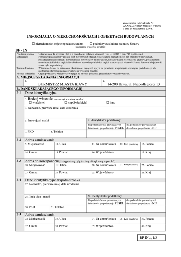Załącznik Nr 1 do Uchwały Nr XXXI/272/16 Rady Miejskiej w Iławie z dnia 24 października 2016 r. INFORMACJA O NIERUCHOMOŚCIACH I OBIEKTACH BUDOWLANYCH nieruchomości objęte opodatkowaniem podmioty zwolnione na mocy Ustawy (zaznaczyć właściwy kwadrat) BF - IN Podstawa prawna: Składający: Termin składania: Miejsce składania: Ustawa z dnia 12 stycznia 1991 r. o podatkach i opłatach lokalnych (Dz. U. z 2016 r. poz. 716 z późn. zm.) Formularz przeznaczony jest dla osób fizycznych będących właścicielami nieruchomości lub obiektów budowlanych, posiadaczami samoistnych nieruchomości lub obiektów budowlanych, użytkownikami wieczystymi gruntów, posiadaczami nieruchomości lub ich części albo obiektów budowlanych lub ich części, stanowiących własność Skarbu Państwa lub jednostki samorządu terytorialnego W terminie 14 dni od zaistnienia okoliczności mających wpływ na powstanie, wygaśnięcie obowiązku podatkowego lub zaistnienia zdarzenia mającego wpływ na wysokość podatku. Organ podatkowy właściwy ze względu na miejsce położenia przedmiotów opodatkowanych. A. MIEJSCE SKŁADANIA INFORMACJI 1. 2. BURMISTRZ MIASTA IŁAWY 14-200 Iława, ul. Niepodległości 13 B. DANE SKŁADAJĄCEGO INFORMACJĘ B.1 Dane identyfikacyjne 3. Rodzaj własności (zaznaczyć właściwy kwadrat) właściciel współwłaściciel 4. Nazwisko, pierwsze imię, data urodzenia 5. Imię ojca i matki inny 6. Identyfikator podatkowy dla podatników nie prowadzących działalności gospodarczej - PESEL 7. PKD B.2 Miejscowość 14. B.4 8. Telefon Adres zamieszkania 9. B.3 Gmina 10. Ulica 11. Nr domu/ lokalu 15. Powiat 16. Województwo 12. Kod pocztowy 13. Poczta 17. Kraj 22. Poczta 26. Kraj Adres do korespondencji (wypełniamy, gdy jest inny niż wykazany w poz. B.2) 18. Miejscowość 19. Ulica 23. Gmina 24. Powiat 20. Nr domu/ lokalu 25. Województwo 21. Kod pocztowy Dane identyfikacyjne współmałżonka 27. Nazwisko, pierwsze imię, data urodzenia 28. Imię ojca i matki 29. Identyfikator podatkowy dla podatników nie prowadzących działalności gospodarczej - PESEL 30. PKD B.5 dla podatników prowadzących działalność gospodarczą - NIP dla podatników prowadzących działalność gospodarczą - NIP 31. Telefon Adres zamieszkania 32. Miejscowość 33. Ulica 34. Nr domu/ lokalu 37. Gmina 38. Powiat 39. Województwo 35. Kod pocztowy 36. Poczta 40. Kraj BF-IN (3) 1/3 C. OKOLICZNOŚCI POWODUJĄCE KONIECZNOŚĆ ZŁOŻENIA INFORMACJI 41. Okoliczności (zaznaczyć właściwy kwadrat) nabycie – informacja składana po raz pierwszy inne zdarzenia data zdarzenia: ............................................................................................................................................................. rodzaj zdarzenia:........................................................................................................................................................... D. DANE DOTYCZĄCE PRZEDMIOTÓW OPODATKOWANIA (z wyłączeniem zwolnionych) W zakresie danych identyfikacyjnych przedmiotów opodatkowania, należy wypełnić załącznik nr 1, 2, 3 D.1. BUDYNKI LUB ICH CZĘŚCI (do powierzchni użytkowej budynku lub jego części należy zaliczyć powierzchnię mierzoną po wewnętrznej długości ścian na wszystkich kondygnacjach, z wyjątkiem powierzchni klatek schodowych oraz szybów dźwigowych. Za kondygnację uważa się również garaże podziemne, piwnice, sutereny i poddasza użytkowe.) przedmiot opodatkowania podstawa opodatkowania 42. 1. mieszkalne m2 43. związane z prowadzeniem działalności gospodarczej oraz budynki 2. mieszkalne lub ich części zajęte na prowadzenie działalności gospodarczej domki campingowe, obiekty sanitarne znajdujące się na polach namiotowych 3. oraz budynki letniskowe 4. budynki znajdujące się na terenie wysypisk odpadów komunalnych zajęte na prowadzenie działalności gospodarczej w zakresie obrotu kwalifikowanym materiałem siewnym związane z udzielaniem świadczeń zdrowotnych w rozumieniu przepisów o 6. działalności leczniczej, zajęte przez podmioty udzielające tych świadczeń pozostałe, w tym zajęte na prowadzenie odpłatnej statutowej działalności 7. pożytku publicznego przez organizacje pożytku publicznego 5. m2 44. m2 45. m2 46. m2 47. m2 48. m2 D.2. BUDOWLE LUB ICH CZĘŚĆI ZWIĄZANE Z PROWADZENIEM DZIAŁALNOŚCI GOSPODARCZEJ (podstawa opodatkowania w zaokrągleniu do pełnych złotych) 1. znajdujące się na terenie wysypisk odpadów komunalnych 49. 2. pozostałe 50. zł zł D.3. GRUNTY związane z prowadzeniem działalności gospodarczej, bez względu na sposób 1. zakwalifikowania w ewidencji gruntów i budynków przeznaczone na pole namiotowe i prowadzenie wysypisk odpadów 2. komunalnych pod wodami powierzchniowymi stojącymi lub wodami powierzchniowymi 3. płynącymi jezior i zbiorników sztucznych pozostałe, w tym zajęte na prowadzenie odpłatnej statutowej działalności 4. pożytku publicznego przez organizacje pożytku publicznego 51. m2 52. m2 53. ha 54. m2 55. niezabudowane objęte obszarem rewitalizacji, o którym mowa w ustawie z dnia 9 października 2015 r. o rewitalizacji (Dz. U. poz. 1777 z późn. zm.), i położone na terenach, dla których miejscowy plan zagospodarowania przestrzennego przewiduje 5. przeznaczenie pod zabudowę mieszkaniową, usługową albo zabudowę o przeznaczeniu mieszanym obejmującym wyłącznie te rodzaje zabudowy, jeżeli od dnia wejścia w życie tego planu w odniesieniu do tych gruntów upłynął okres 4 lat, a w tym czasie nie zakończono budowy zgodnie z przepisami prawa budowlanego m2 E. DANE DOTYCZĄCE PRZEDMIOTÓW ZWOLNIONYCH W zakresie danych identyfikacyjnych przedmiotów opodatkowania, należy wypełnić załącznik nr 1,2,3 E.1. BUDYNKI LUB ICH CZĘŚCI (do powierzchni użytkowej budynku lub jego części należy zaliczyć powierzchnię mierzoną po wewnętrznej długości ścian na wszystkich kondygnacjach, z wyjątkiem powierzchni klatek s
