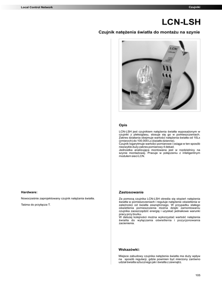 Czujniki Local Control Network LCN-LSH Czujnik natężenia światła do montażu na szynie Opis LCN-LSH jest czujnikiem natężenia światła wyposażonym w czujniki z pleksiglasu, stosuje się go w pomieszczeniach. Zakres działania obejmuje wartości natężenia światła od 10Lx (zmierzch) do 100.000 Lx (światło dzienne). Czujnik logarytmuje wartości pomiarowe i osiąga w ten sposób niezwykle duży zakres pomiarowy 4 dekad. Jednostka analizująca montowana jest w rozdzielnicy na szynie montażowej. Pracuje w połączeniu z inteligentnym modułem sieci LCN. Hardware: Zastosowanie Nowocześnie zaprojektowany czujnik natężania światła. Za pomocą czujnika LCN-LSH określa się stopień natężenia światła w pomieszczeniach i reguluje natężenie oświetlenia w zależności od światła zewnętrznego. W przypadku stałego oświetlenia pomieszczenia można dzięki zamontowaniu czujnika zaoszczędzić energię i uzyskać jednakowe warunki pracy przy biurku. W dalszej kolejności można wykorzystać wartość natężenia światła do wyłączania oświetlenia i pozycjonowania zacienienia. Taśma do przyłącza T. Wskazówki: Miejsce zabudowy czujnika natężenia światła ma duży wpływ na sposób regulacji, gdzie powinien być mierzony zarówno udział światła sztucznego jak i światła z zewnątrz. 105 LCN-LSH Czujnik natężenia światła do montażu na szynie Wymiary: Dane techniczne: Czujnik: Zakres roboczy Rozdzielczość Charakterystyka 17,5 mm x 113 mm x 66 mm 50 mm x 56 mm 1000 mm Moduł ( szer. x dł. x wys.): Czujnik światła (Ø x wys.): Dł. przyłącza do cz. światła 17,5 mm (1 TE) 113 mm 66 mm 61 mm Przyłącze czujnika Zaciski Typ przewodu Długość przewodu przyłączającego do czujnika Ogólne dane: Temperatura pracy Wilgotność powietrza 37 mm 56 mm 50 mm Warunki otoczenia Stopień ochrony 50 mm Ilość pól 10Lx do 100.000Lx 10Bit logarytmiczna bezśrubowe drut lub linka max. (0,5mm2) lub z końcówką kablową (max.0,5mm2) max. 100 m w przypadku przewodu izolowanego (fabrycznie ustalony na 50m) -20oC do +40oC max. 80% wzgl. wilgotności, nie ulega obroszeniu do stosowania w stałej instalacji zgodnie z VDE 632, VDE 637 IP 20 1TE Montaż Moduł Czujnik światła REG na szynie 35 mm (DIN 50022) mocowanie na śrubach Schemat połączeń L N D PE L N D PE LCN-LS LCN-Busmoduł LCN LCN-LSH Licht Light sensor 0-100000 Lux T 106 I P