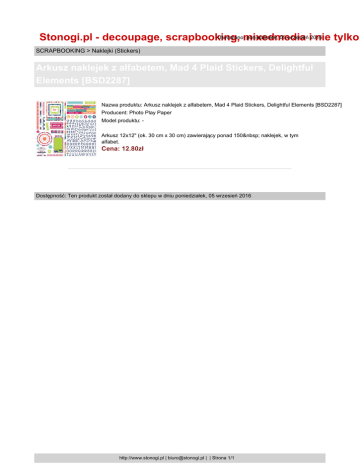 Utworzono:mixedmedia poniedziałek, 05 wrzesień i2016 Stonogi.pl - decoupage, scrapbooking, nie tylko. SCRAPBOOKING > Naklejki (Stickers) Arkusz naklejek z alfabetem, Mad 4 Plaid Stickers, Delightful Elements [BSD2287] Nazwa produktu: Arkusz naklejek z alfabetem, Mad 4 Plaid Stickers, Delightful Elements [BSD2287] Producent: Photo Play Paper Model produktu: Arkusz 12x12" (ok. 30 cm x 30 cm) zawierający ponad 150 naklejek, w tym alfabet. Cena: 12.80zł Dostępność: Ten produkt został dodany do sklepu w dniu poniedziałek, 05 wrzesień 2016 http://www.stonogi.pl | [email protected] | | Strona 1/1