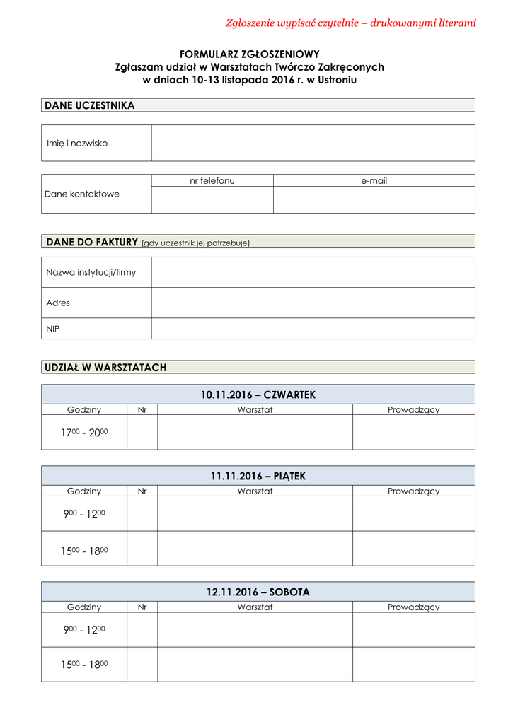 Zgłoszenie wypisać czytelnie – drukowanymi literami FORMULARZ ZGŁOSZENIOWY Zgłaszam udział w Warsztatach Twórczo Zakręconych w dniach 10-13 listopada 2016 r. w Ustroniu DANE UCZESTNIKA Imię i nazwisko nr telefonu e-mail Dane kontaktowe DANE DO FAKTURY (gdy uczestnik jej potrzebuje) Nazwa instytucji/firmy Adres NIP UDZIAŁ W WARSZTATACH 10.11.2016 – CZWARTEK Godziny Nr Warsztat Prowadzący 1700 - 2000 11.11.2016 – PIĄTEK Godziny Nr Warsztat Prowadzący 900 - 1200 1500 - 1800 12.11.2016 – SOBOTA Godziny 900 - 1200 1500 - 1800 Nr Warsztat Prowadzący Zgłoszenie wypisać czytelnie – drukowanymi literami 13.11.2016 – NIEDZIELA Godziny Nr Warsztat Prowadzący 900 - 1200 POSTANOWIENIA KOŃCOWE – OŚWIADCZENIA Oświadczam, że zapoznałem się z Regulaminem Warsztatów Twórczo Zakręconych znajdujący się na stronie www.tworczozakreceni.org i akceptuję w całości jego postanowienia. W związku z Ustawą z dnia 29 sierpnia 1997 r. o ochronie danych osobowych (Dz.U. 2014.1182 ze zm.) wyrażam zgodę na przetwarzanie moich danych osobowych przez organizatora wyłącznie w celach organizacyjnych i finansowych, niezbędnych do realizacji Warsztatów Twórczo Zakręconych Miejscowość Data zgłoszenie internetowego Data Czytelny podpis Data wpływu formularza Data uiszczenia opłaty Wypełniony, podpisany i zeskanowany formularz należy przesłać na adres e-mail: [email protected] najpóźniej do 3 dni od zgłoszenia internetowego. W terminie do 5 dni od zgłoszenia internetowego, jednak nie później niż do 9.11.2016 r. należy uiścić opłatę za warsztaty (1 warsztat = 37 zł) oraz jednorazową opłatę organizacyjną w wysokości 20 zł za osobę. Proszę zwrócić uwagę, że [email protected], www.tworczozakreceni.org !!! adres e-mail jest natomiast adres w formie strony żeńskiej – internetowej