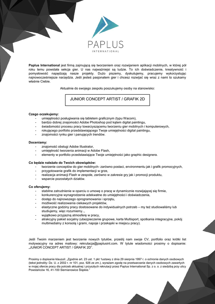 Paplus International jest firmą zajmującą się tworzeniem oraz rozwijaniem aplikacji mobilnych, w której pół roku temu powstała sekcja gier. U nas najważniejsi są ludzie. To ich doświadczenie, kreatywność i pomysłowość napędzają nasze projekty. Dużo piszemy, dyskutujemy, pracujemy wykorzystując najnowocześniejsze narzędzia. Jeśli jesteś pasjonatem gier i chcesz rozwijać się wraz z nami to szukamy właśnie Ciebie. Aktualnie do swojego zespołu poszukujemy osoby na stanowisko: JUNIOR CONCEPT ARTIST / GRAFIK 2D Czego oczekujemy: umiejętności posługiwania się tabletem graficznym (typu Wacom), bardzo dobrej znajomości Adobe Photoshop pod kątem digital paintingu, świadomości procesu pracy towarzyszącemu tworzeniu gier mobilnych i komputerowych, rokującego portfolio przedstawiającego Twoje umiejętności digital paintingu, znajomości rynku gier i panujących trendów. Doceniamy: znajomość obsługi Adobe Illustrator, umiejętność tworzenia animacji w Adobe Flash, elementy w portfolio przedstawiające Twoje umiejętności jako graphic designera. Co będzie należało do Twoich obowiązków: tworzenie conceptów do gier mobilnych- zarówno postaci, environmentu jak i grafik promocyjnych, przygotowanie grafik do implementacji w grze, realizacja animacji Flash w zespole, zarówno w zakresie gry jak i promocji produktu, wsparcie pozostałych działów. Co oferujemy: stabilne zatrudnienie w oparciu o umowę o pracę w dynamicznie rozwijającej się firmie, konkurencyjne wynagrodzenie adekwatne do umiejętności i doświadczenia, dostęp do najnowszego oprogramowania i sprzętu, możliwość realizowania ciekawych projektów, elastyczne godziny pracy dostosowane do indywidualnych potrzeb – my też studiowaliśmy lub studiujemy, więc rozumiemy.., wyjątkowo przyjazną atmosferę w pracy, atrakcyjny pakiet socjalny (ubezpieczenie grupowe, karta Multisport, spotkania integracyjne, pokój multimedialny z konsolą i grami, napoje i przekąski w miejscu pracy). Jeśli Twoim marzeniem jest tworzenie nowych tytułów, prześlij nam swoje CV, portfolio oraz krótki list motywacyjny na adres mailowy: [email protected]. W tytule wiadomości prosimy o dopisanie: „JUNIOR CONCEPT ARTIST / GRAFIK 2D”. Prosimy o dopisanie klauzuli: „Zgodnie art. 23 ust. 1 pkt 1ustawy z dnia 29 sierpnia 1997 r. o ochronie danych osobowych (tekst jednolity: Dz. U. z 2002 r. nr 101, poz. 926 ze zm.), wyrażam zgodę na przetwarzanie danych osobowych zawartych w mojej ofercie pracy dla potrzeb aktualnej i przyszłych rekrutacji przez Paplus International Sp. z o. o. z siedzibą przy ulicy Powstańców 16, 41-100 Siemianowice Śląskie.”