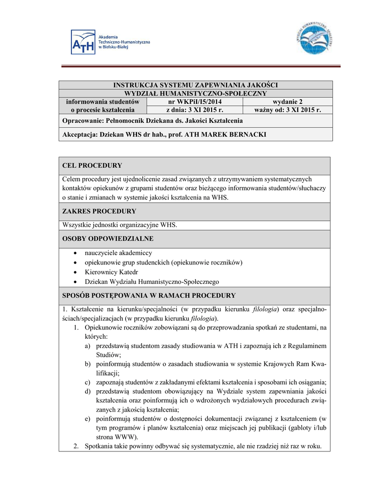 INSTRUKCJA SYSTEMU ZAPEWNIANIA JAKOŚCI WYDZIAŁ HUMANISTYCZNO-SPOŁECZNY nr WKPiI/I5/2014 wydanie 2 informowania studentów o procesie kształcenia z dnia: 3 XI 2015 r. ważny od: 3 XI 2015 r. Opracowanie: Pełnomocnik Dziekana ds. Jakości Kształcenia Akceptacja: Dziekan WHS dr hab., prof. ATH MAREK BERNACKI CEL PROCEDURY Celem procedury jest ujednolicenie zasad związanych z utrzymywaniem systematycznych kontaktów opiekunów z grupami studentów oraz bieżącego informowania studentów/słuchaczy o stanie i zmianach w systemie jakości kształcenia na WHS. ZAKRES PROCEDURY Wszystkie jednostki organizacyjne WHS. OSOBY ODPOWIEDZIALNE nauczyciele akademiccy opiekunowie grup studenckich (opiekunowie roczników) Kierownicy Katedr Dziekan Wydziału Humanistyczno-Społecznego SPOSÓB POSTĘPOWANIA W RAMACH PROCEDURY 1. Kształcenie na kierunku/specjalności (w przypadku kierunku filologia) oraz specjalnościach/specjalizacjach (w przypadku kierunku filologia). 1. Opiekunowie roczników zobowiązani są do przeprowadzania spotkań ze studentami, na których: a) przedstawią studentom zasady studiowania w ATH i zapoznają ich z Regulaminem Studiów; b) poinformują studentów o zasadach studiowania w systemie Krajowych Ram Kwalifikacji; c) zapoznają studentów z zakładanymi efektami kształcenia i sposobami ich osiągania; d) przedstawią studentom obowiązujący na Wydziale system zapewniania jakości kształcenia oraz poinformują ich o wdrożonych wydziałowych procedurach związanych z jakością kształcenia; e) poinformują studentów o dostępności dokumentacji związanej z kształceniem (w tym programów i planów kształcenia) oraz miejscach jej publikacji (gabloty i/lub strona WWW). 2. Spotkania takie powinny odbywać się systematycznie, ale nie rzadziej niż raz w roku. 3. Odbycie takich spotkań potwierdzane jest stosownym oświadczeniem studentów. 4. Dokument archiwizowany jest w sekretariatach Katedr przez trzy lata od ukończenia studiów przez studentów z danego naboru. 5. Informacje o spotkaniach ze studentami należy na bieżąco zgłaszać Pełnomocnikowi Dziekana ds. Jakości Kształcenia. 2. Kształcenie w ramach przedmiotu. 1. Osoba prowadząca przedmiot zobowiązana jest przedstawić studentom/słuchaczom: a) zasady i sposób prowadzenia zajęć dydaktycznych, w tym literaturę przedmiotu, b) warunki usprawiedliwiania i odrabiania nieobecności na zajęciach, c) zakres wymagań, formy i zasady oraz harmonogram zaliczenia zajęć, d) godziny konsultacji. 2. Następuje to na pierwszych zajęciach. 3. Studenci potwierdzają ten fakt, składając swoje podpisy pod stosownym oświadczeniem (stanowi je stosowny załącznik do Procedury oceniania studentów). 6. Dokument archiwizowany jest w sekretariatach Katedr przez trzy lata od ukończenia studiów przez studentów z danego naboru. DOKUMENT ZWIĄZANE Z PROCEDURĄ Procedura dotycząca warunków i sposobu oceniania studentów i słuchaczy WHS. Uchwała Senatu ATH nr 1070/04/V/2015 z 21 IV 2015 r. w sprawie zmian w Regulaminie studiów wyższych ATH w Bielsku-Białej (zwłaszcza § 18 pkt 4). ZAŁĄCZNIKI -----------------