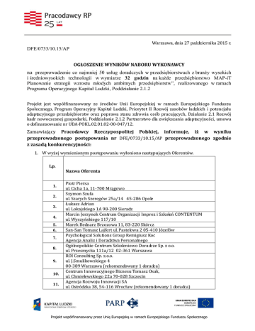 Warszawa, dnia 27 października 2015 r. DFE/0733/10.15/AP OGŁOSZENIE WYNIKÓW NABORU WYKONAWCY na przeprowadzenie co najmniej 50 usług doradczych w przedsiębiorstwach z branży wysokich i średniowysokich technologii w wymiarze 32 godzin na każde przedsiębiorstwo MAP-iT Planowanie strategii wzrostu młodych ambitnych przedsiębiorstw”, realizowanego w ramach Programu Operacyjnego Kapitał Ludzki, Poddziałanie 2.1.2 Projekt jest współfinansowany ze środków Unii Europejskiej w ramach Europejskiego Funduszu Społecznego, Program Operacyjny Kapitał Ludzki, Priorytet II Rozwój zasobów ludzkich i potencjału adaptacyjnego przedsiębiorstw oraz poprawa stanu zdrowia osób pracujących, Działanie 2.1 Rozwój kadr nowoczesnej gospodarki, Poddziałanie 2.1.2 Partnerstwo dla zwiększania adaptacyjności, umowa o dofinansowanie nr UDA-POKL.02.01.02-00-047/12. Zamawiający Pracodawcy Rzeczypospolitej Polskiej, informuje, iż w wyniku przeprowadzonego postępowania nr DFE/0733/10.15/AP przeprowadzonego zgodnie z zasadą konkurencyjności: 1. W wyżej wymienionym postępowaniu wyłoniono następujących Oferentów. Lp. 1. 2. 3. 4. 5. 6. 7. 8. 9. 10. 11. Nazwa Oferenta Piotr Piersa ul. Cicha 1a, 11-700 Mrągowo Szymon Szufa ul. Szarych Szeregów 25a/14 45-286 Opole Łukasz Adrian ul. Lokajskiego 1A 98-200 Sieradz Marcin Jerzynek Centrum Organizacji Imprez i Szkoleń CONTENTUM ul. Wyszyńskiego 117/10 Marek Bednarz Brzozowa 11, 83-220 Skórcz San-San Tomasz Lajfert ul. Pastelowa 2 05-410 Józefów Psychological Solutions Group Remigiusz Koc Agencja Analiz i Doradztwa Personalnego Ogólnopolskie Centrum Szkoleniowo Doradcze Sp. z o.o. ul. Przesmycka 111a/12 02-361 Warszawa ROI Consulting Sp. z.o.o. ul. J.Smulikowskiego 4 00-389 Warszawa (rekomendowany 1 doradca) Centrum Innowacyjnego Biznesu Tomasz Osak, ul. Chmielewskiego 22a 70-028 Szczecin Agencja Rozwoju Innowacji SA ul. Ostródzka 38, 54-116 Wrocław (rekomendowany 1 doradca) Projekt współfinansowany przez Unię Europejską w ramach Europejskiego Funduszu Społecznego 12. 13. Centrum Skutecznego Działania Wielicka 25/312 30-552 Kraków (rekomendowany 1 doradca) Firma Doradczo-Szkoleniowa Consulting Julita Orłowska-Szczepańska ul. Ceynowy 13b/13 89-604 Chojnice (rekomendowany 1 doradca) 14. W wyżej wymienionym postępowaniu następujące oferty nie spełniły kryteriów określonych w zapytaniu ofertowym. Lp. Nazwa Oferenta 1. UNIFUND Sp. z o.o. Al. Niepodległości 72, 35-303 Rzeszów AKADEMIA ASAP Sp. z o.o., w konsorcjum z ASAP24 2. ul. Złota 61/100; 00-819 Warszawa Ekoinnmar Sp. z o.o. 3. ul. M. Wedmanowej 7 93-228 Łódź 4. AGEMA Ewa Zaborowska ul. Kujawska 3/44, 00-793 Warszawa 5. IMPLEMENTACJA Jerzy Krzywicki ul.Matejki 1, 72-400 Kamień Pomorski BIo- Tech Consulting Sp. z o.o. 6. ul. Sterlinga 27/29 508, 90-212 Łódź 7. Przedsiębiorstwo Wielobranżowe ERAJ Eugeniusz Rajewicz ul. Okrzei 25, 43-190 Warszawa 8. PB Piotr Bielicki, Plac Andersa 7, 60-529 Poznań 9. EUROKONSULTANT Radosław Jóżwiec ul. Sikorskiego 5, 33-100 Tarnów 10. Anita Frankowiak, ul. Panny 9, 11-034 Tomaszkowo Uwagi Brak dokumentów potwierdzających spełnienie kryteriów dostępu określonych w zapytaniu Brak dokumentów potwierdzających spełnienie kryteriów dostępu określonych w zapytaniu Brak dokumentów potwierdzających spełnienie kryteriów dostępu określonych w zapytaniu Brak dokumentów potwierdzających spełnienie kryteriów dostępu określonych w zapytaniu Brak dokumentów potwierdzających spełnienie kryteriów dostępu określonych w zapytaniu Brak dokumentów potwierdzających spełnienie kryteriów dostępu określonych w zapytaniu. Kwota przekracza stawki PARP. Brak dokumentów potwierdzających spełnienie kryteriów dostępu określonych w zapytaniu Brak dokumentów potwierdzających spełnienie kryteriów dostępu określonych w zapytaniu Brak dokumentów potwierdzających spełnienie kryteriów dostępu określonych w zapytaniu Brak dokumentów potwierdzających spełnienie kryteriów dostępu określonych w zapytaniu Projekt współfinansowany przez Unię Europejską w ramach Europejskiego Funduszu Społecznego BRAND Tomasz Dołgań 11. ul. Ks. J. Popiełuszki 9/9 10-695 Olsztyn 12. Agnieszka Czarnecka ul. Grottgera 10/1 81-809 Sopot Everest Consulting & Szkolenia 13. ul. Narutowicza 7a/3 40-850 Katowice PROACTIVE Centrum Wspierania Aktywnej 14. Przedsiębiorczości Ewelina Hanus 15. Agencja Rozwoju Pomorza S.A ul. Akońska 6/A3, 80-387 Gdańsk Brak dokumentów potwierdzających spełnienie kryteriów dostępu określonych w zapytaniu Brak dokumentów potwierdzających spełnienie kryteriów dostępu określonych w zapytaniu Brak dokumentów potwierdzających spełnienie kryteriów dostępu określonych w zapytaniu. Kwota przekracza stawki PARP. Brak dokumentów potwierdzających spełnienie kryteriów dostępu określonych w zapytaniu Brak dokumentów potwierdzających spełnienie kryteriów dostępu określonych w zapytaniu Projekt współfinansowany przez Unię Europejską w ramach Europejskiego Funduszu Społecznego