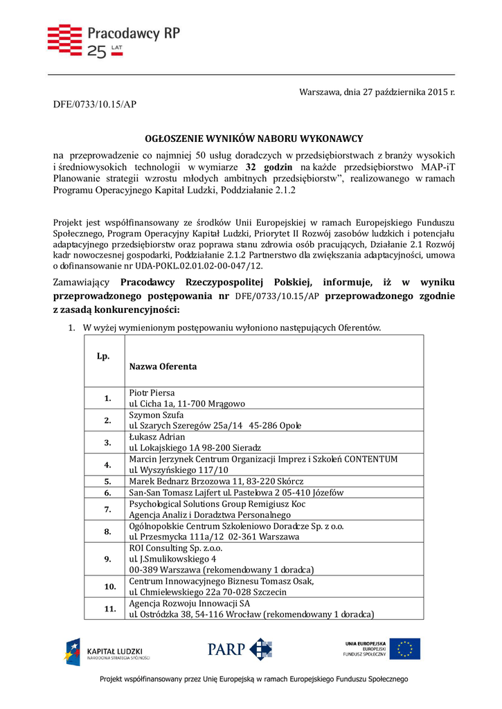 DFE/0733/10.15/AP OGŁOSZENIE WYNIKÓW NABORU