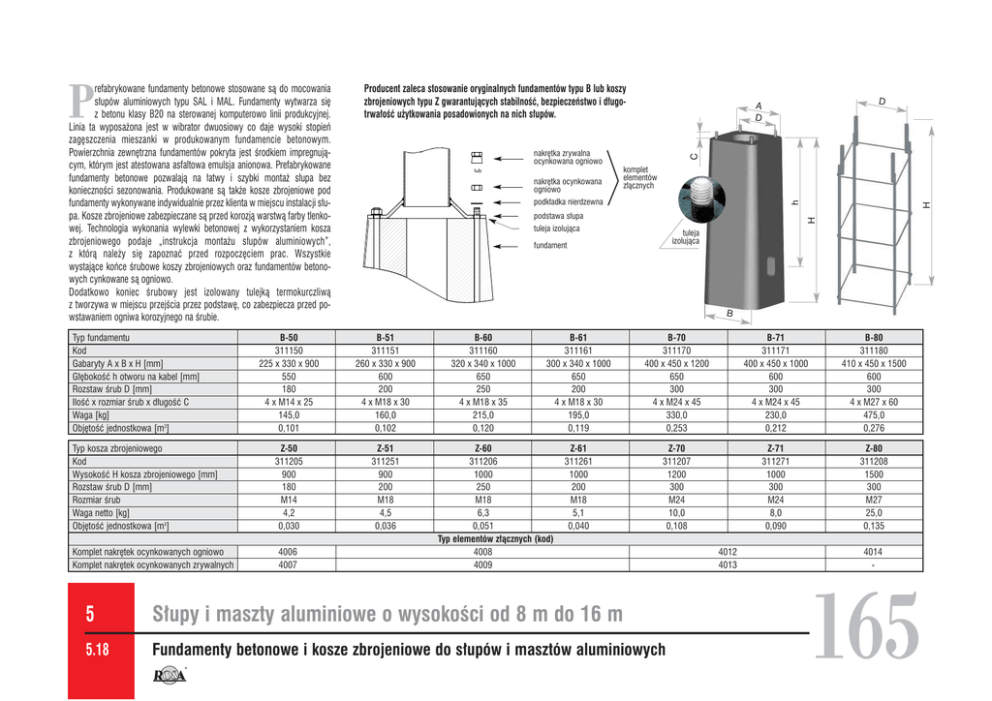 Typ fundamentu Kod Gabaryty A x B x H [mm] G∏´bokoÊç h otworu na kabel [mm] Rozstaw Êrub D [mm] IloÊç x rozmiar Êrub x d∏ugoÊç C Waga [kg] Obj´toÊç jednostkowa [m3] Typ kosza zbrojeniowego Kod WysokoÊç H kosza zbrojeniowego [mm] Rozstaw Êrub D [mm] Rozmiar Êrub Waga netto [kg] Obj´toÊç jednostkowa [m3] Komplet nakr´tek ocynkowanych ogniowo Komplet nakr´tek ocynkowanych zrywalnych nakr´tka zrywalna ocynkowana ogniowo nakr´tka ocynkowana ogniowo h podk∏adka nierdzewna podstawa s∏upa tuleja izolujàca tuleja izolujàca fundament B B-50 311150 225 x 330 x 900 550 180 4 x M14 x 25 145,0 0,101 B-51 311151 260 x 330 x 900 600 200 4 x M18 x 30 160,0 0,102 Z-50 311205 900 180 M14 4,2 0,030 Z-51 311251 900 200 M18 4,5 0,036 4006 4007 komplet elementów z∏àcznych H lub D A D H P Producent zaleca stosowanie oryginalnych fundamentów typu B lub koszy zbrojeniowych typu Z gwarantujàcych stabilnoÊç, bezpieczeƒstwo i d∏ugotrwa∏oÊç u˝ytkowania posadowionych na nich s∏upów. C refabrykowane fundamenty betonowe stosowane sà do mocowania s∏upów aluminiowych typu SAL i MAL. Fundamenty wytwarza si´ z betonu klasy B20 na sterowanej komputerowo linii produkcyjnej. Linia ta wyposa˝ona jest w wibrator dwuosiowy co daje wysoki stopieƒ zag´szczenia mieszanki w produkowanym fundamencie betonowym. Powierzchnia zewn´trzna fundamentów pokryta jest Êrodkiem impregnujàcym, którym jest atestowana asfaltowa emulsja anionowa. Prefabrykowane fundamenty betonowe pozwalajà na ∏atwy i szybki monta˝ s∏upa bez koniecznoÊci sezonowania. Produkowane sà tak˝e kosze zbrojeniowe pod fundamenty wykonywane indywidualnie przez klienta w miejscu instalacji s∏upa. Kosze zbrojeniowe zabezpieczane sà przed korozjà warstwà farby tlenkowej. Technologia wykonania wylewki betonowej z wykorzystaniem kosza zbrojeniowego podaje „instrukcja monta˝u s∏upów aluminiowych”, z którà nale˝y si´ zapoznaç przed rozpocz´ciem prac. Wszystkie wystajàce koƒce Êrubowe koszy zbrojeniowych oraz fundamentów betonowych cynkowane sà ogniowo. Dodatkowo koniec Êrubowy jest izolowany tulejkà ter mokurczliwà z tworzywa w miejscu przejÊcia przez podstaw´, co zabezpiecza przed powstawaniem ogniwa korozyjnego na Êrubie. B-60 311160 320 x 340 x 1000 650 250 4 x M18 x 35 215,0 0,120 B-61 311161 300 x 340 x 1000 650 200 4 x M18 x 30 195,0 0,119 Z-60 311206 1000 250 M18 6,3 0,051 Typ elementów z∏àcznych (kod) 4008 4009 Z-61 311261 1000 200 M18 5,1 0,040 B-70 311170 400 x 450 x 1200 650 300 4 x M24 x 45 330,0 0,253 B-71 311171 400 x 450 x 1000 600 300 4 x M24 x 45 230,0 0,212 B-80 311180 410 x 450 x 1500 600 300 4 x M27 x 60 475,0 0,276 Z-70 311207 1200 300 M24 10,0 0,108 Z-71 311271 1000 300 M24 8,0 0,090 Z-80 311208 1500 300 M27 25,0 0,135 5 S∏upy i maszty aluminiowe o wysokoÊci od 8 m do 16 m 5.18 Fundamenty betonowe i kosze zbrojeniowe do s∏upów i masztów aluminiowych 4012 4013 4014 - 165