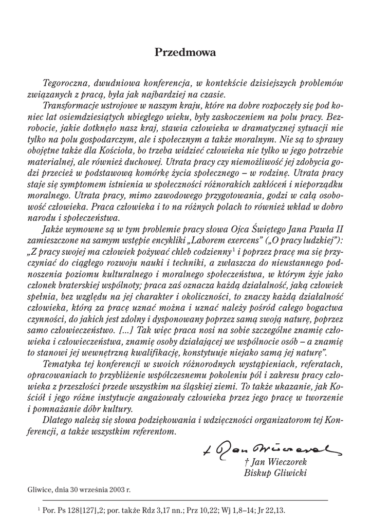 Przedmowa Tegoroczna, dwudniowa konferencja, w kontekście dzisiejszych problemów związanych z pracą, była jak najbardziej na czasie. Transformacje ustrojowe w naszym kraju, które na dobre rozpoczęły się pod koniec lat osiemdziesiątych ubiegłego wieku, były zaskoczeniem na polu pracy. Bezrobocie, jakie dotknęło nasz kraj, stawia człowieka w dramatycznej sytuacji nie tylko na polu gospodarczym, ale i społecznym a także moralnym. Nie są to sprawy obojętne także dla Kościoła, bo trzeba widzieć człowieka nie tylko w jego potrzebie materialnej, ale również duchowej. Utrata pracy czy niemożliwość jej zdobycia godzi przecież w podstawową komórkę życia społecznego – w rodzinę. Utrata pracy staje się symptomem istnienia w społeczności różnorakich zakłóceń i nieporządku moralnego. Utrata pracy, mimo zawodowego przygotowania, godzi w całą osobowość człowieka. Praca człowieka i to na różnych polach to również wkład w dobro narodu i społeczeństwa. Jakże wymowne są w tym problemie pracy słowa Ojca Świętego Jana Pawła II zamieszczone na samym wstępie encykliki „Laborem exercens” („O pracy ludzkiej”): „Z pracy swojej ma człowiek pożywać chleb codzienny 1 i poprzez pracę ma się przyczyniać do ciągłego rozwoju nauki i techniki, a zwłaszcza do nieustannego podnoszenia poziomu kulturalnego i moralnego społeczeństwa, w którym żyje jako członek braterskiej wspólnoty; praca zaś oznacza każdą działalność, jaką człowiek spełnia, bez względu na jej charakter i okoliczności, to znaczy każdą działalność człowieka, którą za pracę uznać można i uznać należy pośród całego bogactwa czynności, do jakich jest zdolny i dysponowany poprzez samą swoją naturę, poprzez samo człowieczeństwo. [...] Tak więc praca nosi na sobie szczególne znamię człowieka i człowieczeństwa, znamię osoby działającej we wspólnocie osób – a znamię to stanowi jej wewnętrzną kwalifikację, konstytuuje niejako samą jej naturę”. Tematyka tej konferencji w swoich różnorodnych wystąpieniach, referatach, opracowaniach to przybliżenie współczesnemu pokoleniu pól i zakresu pracy człowieka z przeszłości przede wszystkim na śląskiej ziemi. To także ukazanie, jak Kościół i jego różne instytucje angażowały człowieka przez jego pracę w tworzenie i pomnażanie dóbr kultury. Dlatego należą się słowa podziękowania i wdzięczności organizatorom tej Konferencji, a także wszystkim referentom. † Jan Wieczorek Biskup Gliwicki Gliwice, dnia 30 września 2003 r. 1 Por. Ps 128[127],2; por. także Rdz 3,17 nn.; Prz 10,22; Wj 1,8–14; Jr 22,13.