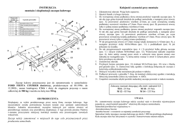 INSTRUKCJA montaŜu i eksploatacji zaczepu kulowego Oznaczenie zacisku wg ISO PN 1 L 2 + 3 31 4 R 5 58R 6 54 7 58L Łączenie przewodów Kolejność czynności przy montaŜu 1. 2. 3. 8 4 Kierunkowskazy lewe Tylne światła przeciwmgłowe Masa Kierunkowskazy prawe Światła pozycyjne prawe Światła hamowania Światła pozycyjne lewe 9 8 6 A 11 12 5 9 B 1 11 12 10 12 A 13 12 8 B 7 3 2 Zaczep kulowy przeznaczony jest do zamontowania w samochodzie: FORD FIESTA COURIER dostawczy, produkowanym od 08.1996r. do 12.2002r., numer katalogowy C24A i słuŜy do ciągnięcia przyczep o masie całkowitej do 900 kg i nacisku na kulę max 50 kg. OD PRODUCENTA Dziękujemy za wybór produkowanego przez naszą firmę zaczepu kulowego. Jego niezawodność została potwierdzona licznymi testami oraz opiniami zadowolonych klientów. JednakŜe niezawodność zaczepów kulowych jest zaleŜna równieŜ od prawidłowego montaŜu oraz prawidłowej eksploatacji. Z tego powodu prosimy Państwa o staranne przeczytanie niniejszej instrukcji montaŜu oraz przestrzeganie zawartych wskazówek. Zaczep naleŜy zamontować w miejscach do tego celu przeznaczonych przez producenta samochodu. Zdemontować zderzak. Wyjąć koło zapasowe. Opuścić tłumik z tylnego zawiesia. Do wewnętrznej strony podłuŜnicy (lewa strona) przyłoŜyć wspornik zaczepu (poz. 5) tak aby jego górna krawędź dotykała do podłogi samochodu, a następnie przez otwory (poz. A) przewiercić przelotowo wiertłem ø11mm, po czym zewnętrzną ściankę podłuŜnicy rozwiercić wiertłem ø17,5mm. Przez otwory (poz. B) przewiercić otwory tylko w jednej ściance podłuŜnicy wiertłem ø11mm. 4. Do wewnętrznej strony podłuŜnicy (prawa strona) przyłoŜyć wspornik zaczepu (poz. 4) tak aby jego górna krawędź dotykała do podłogi samochodu, a następnie przez otwory zaczepu (poz. A) przewiercić przelotowo wiertłem ø11mm, po czym przewiercić zewnętrzną ściankę podłuŜnicy wiertłem ø17,5mm. Przez otwory (poz. B) przewiercić otwory tylko w jednej ściance podłuŜnicy. 5. W tak przygotowane otwory ø17,5mm wsunąć tulejki dystansowe L=63mm (poz. 8), a następnie przyłoŜyć śruby M10x100mm (poz. 11) z podkładkami (poz. 9) jak pokazano na rysunku. 6. Do tak przygotowanych wsporników (poz. 4 i 5) przyłoŜyć belkę główną zaczepu (poz. 1) i skręcić śrubami M10x40mm (poz. 12). Wykorzystać nakrętki zespolone (poz. 6), które naleŜy wsunąć przez otwór w uchwycie ramy (prawa strona) oraz nakrętkę na wysięgniku (poz. 7), którą naleŜy wsunąć w otwór w tylnym płacie, przez który przykręca się zderzak. 7. Zamontować zderzak. 8. Przykręcić korpus automatu (poz. 13) śrubami M12x25mm (poz. 10) wraz z blachą pod gniazdo (poz. 3). Zamocować kulę zgodnie z instrukcją dołączaną do zaczepu z końcówką szybkodemontowalną. 9. Dokręcić wszystkie śruby momentem jak podano w tabelce. 10. Podłączyć przewody z gniazdka 7- bieg. do instalacji elektrycznej zgodnie z instrukcją fabryczną samochodu (zaleca się wykonanie w ASO). 11. Uzupełnić ewentualne ubytki powłoki malarskiej zaczepu powstałe w trakcie montaŜu. Zalecany moment skręcający dla śrub i nakrętek 8,8: M 8 - 25 Nm M 10 - 55 Nm M 12 - 85 Nm M 14 - 135 Nm UWAGA Po zamontowaniu zaczepu kulowego naleŜy uzyskać wpis w dowodzie rejestracyjnym pojazdu na „stacji kontroli pojazdów” właściwej dla miejsca zamieszkania. Samochód powinien być wyposaŜony w : -kierunkowskazy boczne -lusterka boczne o rozstawie co najmniej szerokości przyczepy Sprawdzać śruby mocujące zaczepu kulowego po około 1 000 km przebiegu eksploatacji. Kula zaczepu musi być utrzymana w czystości i konserwowana smarem stałym. PPUH AUTO-HAK S.J. WyposaŜenie zaczepu: Produkcja Haków Holowniczych Henryk & Zbigniew Nejman 76-200 SŁUPSK ul. Słoneczna 16K tel/fax (059) 8-414-414; 8-414-413 E-mail: [email protected] www. autohak.com.pl Zaczep kulowy bez wyposaŜenia elektrycznego C24A Klasa: A50-X Nr kat. Przeznaczony do zamontowania w samochodzie: Producent: FORD Model: FIESTA COURIER Typ: dostawczy produkowanego od 08.1996r. do 12.2002r. Dane techniczne: Wartość siły D : 5,79 kN maksymalna masa przyczepy: 900 kg maksymalny nacisk na kulę: 50 kg Numer homologacji zgodnie z dyrektywą 94/20/WE: e20*94/20*0480*00 KARTA GWARANCYJNA Producent udziela gwarancji niniejszą kartą gwarancyjną na okres 24 miesięcy licząc od dnia zakupu zaczepu kulowego do samochodu: FORD FIESTA COURIER dostawczy produkowanego od 08.1996r. do 12.2002r. Data produkcji .............................. Data zakupu............................................. Zakres gwarancji obejmuje wyłącznie wady jakościowe wynikające z winy producenta. Gwarancja nie obejmuje natomiast uszkodzeń zawinionych przez nabywcę, wynikających z niewłaściwego montaŜu, uŜytkowania lub konserwacji, uszkodzeń mechanicznych, normalnego zuŜycia podczas eksploatacji itp. Gwarancja udzielona na zakupiony towar nie wyłącza, nie ogranicza ani nie zawiesza uprawnień kupującego wynikających z niezgodności towaru z umową. Reklamacje naleŜy zgłaszać w punkcie sprzedaŜy, składając jednocześnie kartę gwarancyjną. Usunięcie "wady" następuje po stwierdzeniu przez punkt sprzedaŜy wspólnie z producentem słuszności złoŜonej reklamacji. Reklamacja powinna być załatwiona w ciągu 14 dni od dnia uznania reklamacji. Karta gwarancyjna jest niewaŜna jeŜeli nie jest wypełniona i podpisana. Data zgłoszenia reklamacji: ................................................................... INFORMACJA WSTĘPNA Zaczep kulowy jest skonstruowany zgodnie z zasadami bezpieczeństwa ruchu drogowego. Zaczep kulowy jest elementem wpływającym na bezpieczeństwo jazdy i moŜe zostać zainstalowany wyłącznie przez personel wyspecjalizowany. Niedopuszczalne jest dokonywanie jakichkolwiek zmian w konstrukcji zaczepu. Powoduje to wygaśniecie dopuszczenia do stosowania. W przypadku obecności masy izolacyjnej lub 