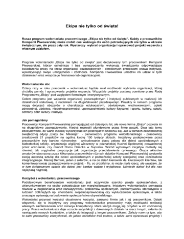 Ekipa nie tylko od święta! Rusza program wolontariatu pracowniczego „Ekipa nie tylko od święta”. Każdy z pracowników Kompanii Piwowarskiej może zrobić coś ważnego dla osób potrzebujących nie tylko w okresie świątecznym, ale przez cały rok. Wystarczy wybrać organizację i opracować projekt wsparcia z własnym udziałem. Program wolontariacki „Ekipa nie tylko od święta” jest dedykowany tym pracownikom Kompanii Piwowarskiej, którzy ochotniczo i bez wynagrodzenia wykonują świadczenia odpowiadające świadczeniu pracy na rzecz organizacji pozarządowych i określonych przepisami prawa instytucji, wykorzystując swoje umiejętności i zdolności. Kompania Piwowarska umożliwi im udział w tych działaniach oraz wesprze je finansowo lub organizacyjnie. Wolontariackie abc Cztery razy w roku pracownik – wolontariusz będzie miał możliwość wybrania organizacji, której chciałby pomóc i opracowania projektu wsparcia. Wszystkie projekty zostaną ocenione przez Radę Programową „Ekipy” pod względem formalnym i merytorycznym. Celem programu jest wsparcie organizacji pozarządowych i instytucji publicznych w realizacji ich działalności statutowej, z naciskiem na długofalowość przedsięwzięć. Projekty w ramach programu mogą dotyczyć obszarów o charakterze edukacyjnym, oświatowym, wychowawczym, opieki zdrowotnej, ubóstwa, niepełnosprawności, upowszechniania kultury fizycznej i sportu, kultury, sztuki, ochrony dóbr kultury i tradycji. Jak pomagaliśmy Pracownicy Kompanii Piwowarskiej pomagają już od dziesięciu lat, ale nowa forma „Ekipy” pozwala im na długofalowe zaangażowanie. Kiedyś roznosili ufundowane przez firmę paczki. Dwa lata temu zdecydowano, że warto inaczej wykorzystać ich potencjał w dzieleniu się. Już w ramach zeszłorocznej świątecznej edycji „Ekipy św. Mikołaja” - pierwowzoru programu wolontariackiego - pracownicy zrealizowali 21 projektów na ogólną kwotę 150 tysięcy złotych. Inicjatywy podejmowane przez pracowników były bardzo różnorodne: wybudowanie placu zabaw dla dzieci upośledzonych z białostockiej szkoły, organizacja wigilijnej wieczerzy w poznańskiej Kuchni Społecznej prowadzonej przez urszulanki, czy remont Domu Dziecka w Supraślu. Wśród wybranych inicjatyw znalazły się również tak oryginalne propozycje jak organizacja przedstawienia cyrkowego. Grupa aktorówamatorów stworzona przez kilkunastu pracowników różnych działów Kompanii Piwowarskiej wystawiła swoją autorską sztukę dla dzieci upośledzonych z poznańskiej szkoły specjalnej oraz przedszkola integracyjnego. Maciej Demski, jeden z aktorów, a na co dzień kierownik ds. kluczowych klientów, tak komentował swoje zaangażowanie w projekt: - To, co zrobiliśmy, to może mała rzecz, ale uważam, że w tym świątecznym czasie dla dzieci jest bardzo ważna i wyjątkowa. Uśmiech dzieci był dla nas najlepszą nagrodą. Korzyści z wolontariatu pracowniczego Podstawowym beneficjentem wolontariatu jest oczywiście szeroko pojęte społeczeństwo, z ukierunkowaniem na osoby potrzebujące czy marginalizowane. Inicjatywy wolontariackie pomagają również w nagłaśnianiu oraz rozwiązywaniu problemów społecznych, przełamywaniu stereotypów o ludziach dotkniętych np. chorobami, niepełnosprawnością czy wykluczeniem społecznym, a także znacząco wpływają na budowanie społeczeństwa obywatelskiego. Wolontariat przynosi korzyści obustronne korzyści, zarówno firmie jak i jej pracownikom. Dzięki włączeniu się w inicjatywy czy programy wolontariackie pracownicy mają możliwość realizacji własnych zainteresowań oraz rozwoju kompetencji, które kiedyś mogą się przydać w ich codziennej pracy. Praca wolontariusza daje uczucie satysfakcji z dokonanych działań na rzecz innych, skłania do nawiązania nowych kontaktów, a także do integracji z innymi pracownikami. Zależy nam na tym, aby to sami pracownicy zdecydowali, do jakich ośrodków trafi pomoc, a także sami opracowali projekty i wzięli udział w ich realizacji. Taki wolontariat pracowniczy polegający na dawaniu z siebie jak najwięcej, podzieleniu się swoim zaangażowaniem, czasem i ciekawymi pomysłami jest zdecydowanie najlepszą formułą - tłumaczy Wojtek Mrugalski, kierownik ds. komunikacji wewnętrznej. Wolontariat pracowniczy umożliwia firmie budowanie partnerstwa z lokalną społecznością, w szczególności z organizacjami pozarządowymi oraz instytucjami publicznymi i społecznymi, które są określane mianem beneficjentów pośrednich. Zaspokajanie potrzeb lokalnej społeczności może więc być realizowane nie tylko przez rozmaite programy społeczne czy działania filantropijne, ale i bezpośrednie angażowanie pracowników. Dodatkowych informacji udziela: Małgorzata Walędzińska CSR Manager Kompania Piwowarska SA Tel.: (32) 327 84 15, 601 590 618 [email protected]
