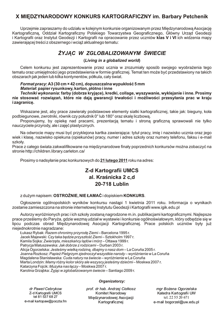 X MIÊDZYNARODOWY KONKURS KARTOGRAFICZNY im. Barbary Petchenik Uprzejmie zapraszamy do udzia³u w kolejnym konkursie organizowanym przez Miêdzynarodow¹ Asocjacjê Kartograficzn¹, Oddzia³ Kartograficzny Polskiego Towarzystwa Geograficznego, G³ówny Urz¹d Geodezji i Kartografii oraz Instytut Geodezji i Kartografii na opracowanie przez uczniów klas V i VI ich widzenia mapy zawieraj¹cej treœci z obszernego i wci¹¿ aktualnego tematu: ¯YJ¥C W ZGLOBALIZOWANYM ŒWIECIE (Living in a globalized world) Celem konkursu jest zaprezentowanie przez ucznia w zrozumia³y sposób swojego wyobra¿enia tego tematu oraz umiejêtnoœci jego przedstawienia w formie graficznej. Temat ten mo¿e byæ przedstawiony na takich obszarach jak jeden lub kilka kontynentów, pó³kula, ca³y œwiat. Format pracy: A3 (30 cm × 42 cm), dopuszczalna wypuk³oœæ 5 mm Materia³: papier rysunkowy, karton, p³ótno i inne Techniki wykonania: farby (dobrze kryj¹ce), kredki, collage, wyszywanie, wyklejanie i inne. Prosimy nie stosowaæ rozwi¹zañ, które nie daj¹ gwarancji trwa³oœci i mo¿liwoœci przesy³ania prac w kraju i zagranicê. Wskazane jest, aby prace zawiera³y podstawowe elementy siatki kartograficznej, takie jak: bieguny, ko³a podbiegunowe, zwrotniki, równik czy po³udnik 0° lub 180° oraz skalê liczbow¹. Proponujemy, by opiekê nad pracami, prezentacj¹ tematu i stron¹ graficzn¹ sprawowali nie tylko nauczyciele przyrody, ale i zajêæ plastycznych. Na odwrocie mapy musi byæ przyklejona kartka zawieraj¹ca: tytu³ pracy, imiê i nazwisko ucznia oraz jego wiek i klasê, nazwisko opiekuna (opiekunów) pracy, numer i adres szko³y oraz numery telefonu, faksu i e-mail szko³y. Prace z ca³ego œwiata zakwalifikowane na miêdzynarodowe fina³y poprzednich konkursów mo¿na zobaczyæ na stronie http://children.library.carleton.ca/ Prosimy o nadsy³anie prac konkursowych do 21 lutego 2011 roku na adres: Z-d Kartografii UMCS al. Kraœnicka 2 c,d 20-718 Lublin z du¿ym napisem: OSTRO¯NIE, NIE £AMAÆ i dopiskiem KONKURS. Og³oszenie ogólnopolskich wyników konkursu nast¹pi 1 kwietnia 2011 roku. Informacja o wynikach zostanie zamieszczona na stronie internetowej Instytutu Geodezji i Kartografii www.igik.edu.pl Autorzy wyró¿nionych prac i ich szko³y zostan¹ nagrodzone m.in. publikacjami kartograficznymi. Najlepsze prace przeœlemy do Pary¿a, gdzie wezm¹ udzia³ w wystawie i konkursie ogólnoœwiatowym, który odbêdzie siê w lipcu podczas obrad Miêdzynarodowej Asocjacji Kartograficznej. Prace polskich uczniów by³y ju¿ niejednokrotnie nagradzane: £ukasz Rybak: Razem chronimy przyrodê Ziemi – Barcelona 1995 r. Jacek Majewski: Czy taka bêdzie przysz³oœæ Ziemi – Sztokholm 1997 r. Kamila Sojka: Zwierzêta, mieszkañcy l¹dów i mórz – Ottawa 1999 r. Patrycja Matuszewska: Jak dobrze z rodzicami – Durban 2003 r. Alicja Ogorzelska: Jesteœmy wielk¹ rodzin¹, dbajmy o nasz dom – La Coruña 2005 r. Joanna Rozkosz: Papie¿ Pielgrzym zjednoczy³ wszystkie narody – wyró¿nienie w La Coruña Magdalena Stanis³awska: Cuda natury na œwiecie – wyró¿nienie w La Coruña Marta Londzin: Mamy ró¿ny kolor skóry ale wszyscy jesteœmy dzieæmi – Moskwa 2007 r. Katarzyna Fojcik: Muzyka nas ³¹czy – Moskwa 2007 r. Karolina Grz¹bka: ¯yj¹c w zglobalizowanym œwiecie – Santiago 2009 r. Organizatorzy: dr Pawe³ Cebrykow Z-d Kartografii UMCS tel 81 537 68 27 e-mail [email protected] prof. dr hab. Andrzej Cio³kosz Komitet Narodowy Miêdzynarodowej Asocjacji Kartograficznej mgr Bo¿ena Ogorzelska Katedra Kartografii UW tel. 22 55 20 671 e-mail [email protected]