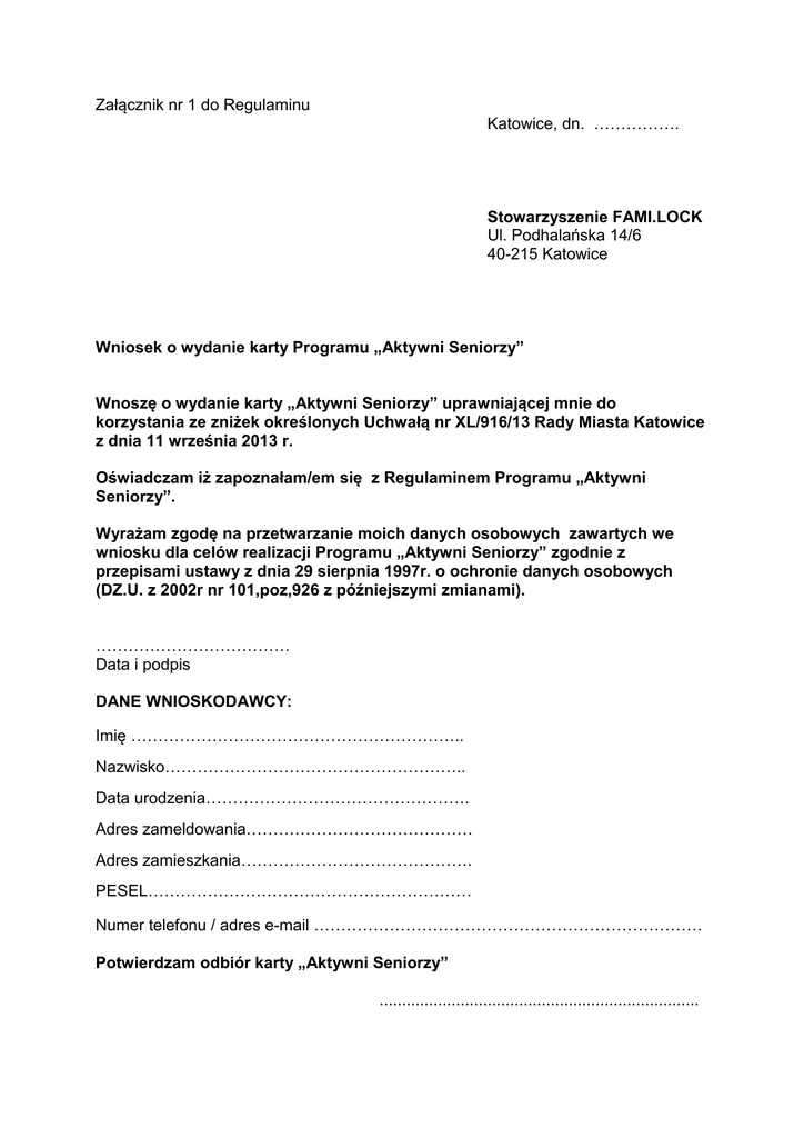 Załącznik nr 1 do Regulaminu Katowice, dn. ……………. Stowarzyszenie FAMI.LOCK Ul. Podhalańska 14/6 40-215 Katowice Wniosek o wydanie karty Programu „Aktywni Seniorzy” Wnoszę o wydanie karty „Aktywni Seniorzy” uprawniającej mnie do korzystania ze zniżek określonych Uchwałą nr XL/916/13 Rady Miasta Katowice z dnia 11 września 2013 r. Oświadczam iż zapoznałam/em się z Regulaminem Programu „Aktywni Seniorzy”. Wyrażam zgodę na przetwarzanie moich danych osobowych zawartych we wniosku dla celów realizacji Programu „Aktywni Seniorzy” zgodnie z przepisami ustawy z dnia 29 sierpnia 1997r. o ochronie danych osobowych (DZ.U. z 2002r nr 101,poz,926 z późniejszymi zmianami). ……………………………… Data i podpis DANE WNIOSKODAWCY: Imię …………………………………………………….. Nazwisko……………………………………………….. Data urodzenia…………………………………………. Adres zameldowania…………………………………… Adres zamieszkania……………………………………. PESEL…………………………………………………… Numer telefonu / adres e-mail ……………………………………………………………… Potwierdzam odbiór karty „Aktywni Seniorzy” .......................................................................