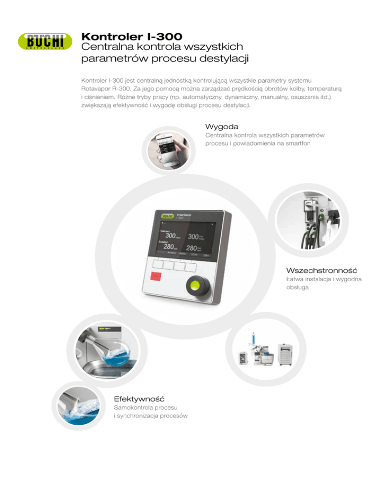 Kontroler I-300 Centralna kontrola wszystkich parametrów procesu destylacji Kontroler I-300 jest centralną jednostką kontrolującą wszystkie parametry systemu Rotavapor R-300. Za jego pomocą można zarządzać prędkością obrotów kolby, temperaturą i ciśnieniem. Różne tryby pracy (np. automatyczny, dynamiczny, manualny, osuszania itd.) zwiększają efektywność i wygodę obsługi procesu destylacji. Wygoda Centralna kontrola wszystkich parametrów procesu i powiadomienia na smartfon Wszechstronność Łatwa instalacja i wygodna obsługa Efektywność Samokontrola procesu i synchronizacja procesów Kontroler I-300 Właściwości i zalety Skonfiguruj system dostosowany do indywidualnych potrzeb: www.buchi.com/rotavapor End Start Heat-up Traditional ∆t End Dynamic t t0 Łatwa obsługa Zdalny monitoring Destylacja dynamiczna Wygodne i łatwe w obsłudze pokrętło sterujące, cztery przyciski szybkiego dostępu do głównych funkcji, awaryjny przycisk STOP zapewniają prostą i łatwą obsługę urządzenia. Dzięki współpracy wyparki Rotavapor R-300 z systemami iOS, Android oraz Windows 8 zapewniona jest możliwość bieżącego kontrolowania trwającego procesu za pomocą smartfona. Proces destylacji rozpoczyna się zaraz po wyborze rozpuszczalnika z biblioteki. W czasie kiedy chiller i łaźnia osiągają zadaną temperaturę, próżnia jest regulowana w sposób dynamiczny. Szybki dostęp do danych Tryb szybkiego suszenia Bezpieczeństwo pracy Szybki dostęp do danych procesu, takich jak preferowane rozpuszczalniki, test szczelności oraz inne funkcje mogą zostać zapisane w pamięci urządzenia i szybko przywołane do zapoczątkowania destylacji. W trybie szybkiego suszenia kolba naprzemiennie zmienia kierunek obrotów wg sekwencji czasowych ustawionych przez operatora. Zintegrowany test sprawdza szczelność systemu i wyświetla wynik, zapewniając najwyższy poziom zabezpieczenia przed rozszczelnieniem systemu, ulatnianiem szkodliwych substancji czy nawet wybuchem. Automatyczna destylacja Czujnik AutoDest automatycznie reguluje podciśnienie w zależności od różnicy temperatury na wlocie i wylocie płynu chłodzącego. Dzięki temu algorytmowi możliwe jest prowadzenie automatycznej destylacji bez nadzoru. W przypadku próbek z tendencją do pienienia się, czujnik piany automatycznie czasowo zapowietrza układ. Temp. Koniec destylacji ∆T Tout Tin Czas t I-300: Najważniejsze korzyści Wygoda ∙ Łatwa integracja z systemem Rotavapor® R-300 ∙ Centralna kontrola i regulacja wszystkich parametrów procesu takich jak prędkość obrotów kolby, temperatura i ciśnienie ∙ System powiadomień na smartfon zapewnia zdalny monitoring, stały podgląd parametrów trwającego procesu wraz z wykresami oraz samokontrolę przebiegu procesu destylacji Uniwersalność ∙ Możliwość zamontowania kontrolera i jego wygodnej obsługi w wielu miejscach: ∙ na uchwycie wyparki Rotavapor ∙ na pompie próżniowej ∙ poza wyciągiem lub na ścianie laboratorium Efektywność ∙ Precyzyjne zsynchronizowane procesy dzięki centralnej kontroli pracy wyparki, łaźni, pompy próżniowej i chillera ∙ Dodatkowe funkcje umożliwiające pracę bez nadzoru: ∙ automatyczna destylacja dzięki sensorowi AutoDest ∙ czujnik piany Rotavapor® R-300 Pompa próżniowa V-300 Chiller recyrkulacyjny F-305 / F-308 / F-314 Kontroler I-300 / I-300 PRO Wygodne i efektywne odparowywanie Ekonomiczne i ciche żródło próźni Efektywny i oszczędzajacy wodę sposób chłodzenia Wygodna kontrola monitoring i regulacja procesów monitoring www.buchi.com/laboratory-evaporation Jakość w Twoich rękach 11595134 11595134 en 1508 en A 1508 / Technical A / Technical data aredata subject are to subject change to without change notice without notice / Quality/ Systems Quality Systems ISO 9001 ISO The 9001 English The version English is version the original is the language original language version and version serves andas serves basisas forbasis all translations for all translations into other into languages. other languages. Czy masz już wszystko do pracy?