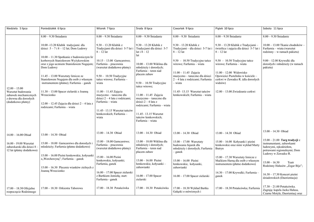 Niedziela 5 lipca Poniedziałek 6 lipca Wtorek 7 lipca Środa 8 lipca Czwartek 9 lipca Piątek 10 lipca Sobota 11 lipca 8.00 – 9.30 Śniadanie 8.00 – 9.30 Śniadanie 8.00 – 9.30 Śniadanie 8.00 – 9.30 Śniadanie 8.00 – 9.30 Śniadanie 8.00 – 9.30 Śniadanie 10.00 -13.20 Klubik tradycjami: dla dzieci 5 – 7 i 8 – 12 lat; Dom Ludowy 9.30 – 13.20 Klubik z 9.30 – 13.20 Klubik z Tradycjami dla dzieci 5-7 lat i Tradycjami dla dzieci 5-7 8 – 12 lat lat i 8 – 12 lat……………….. 9.30 – 13.20 Klubik z Tradycjami – dla dzieci 5-7 lat i 8 – 12 lat 9.30 – 13.20 Klubik z Tradycjami – świetlica i zajęcia dla dzieci 5-7 lat i 8 – 12 lat 10.00 – 13.00 Tkanie chodników – Farfurnia – wiata (warsztat rodzinny – w ramach pakietu) 10.15 – 13.00 Garncarstwo; Farfurnia – pracownia (warsztat dodatkowo płatny) 9.50 – 10.50 Tradycyjne tańce wirowe; Farfurnia – wiata 9.50 – 10.50 Tradycyjne tańce wirowe; Farfurnia – wiata 9.00 – 12.00 Krywulki dla dorosłych i młodzieży (w ramach pakietu). 11.00 – 11.45 Zajęcia muzyczno – taneczne dla dzieci 2 – 4 lata z rodzicami; Farfurnia – wiata 11.00 – 12.00 Widowisko Opowieści Pustelnika w kościele – cerkwi w Zawadce R. (dla dorosłych widzów) 10.00 – 11.30 Spotkanie z budowniczym lir korbowych Stanisławem Wyżykowskim oraz z jego uczniem Stanisławem Nogajem; Dom Ludowy. 12.00 – 15.00 Warsztat budowania zabawek mechanicznych z drewna dla dorosłych (dodatkowo płatny) …………………………. 11.45 – 13.00 Warsztaty lirnicze ze Stanisławem Nogajem dla osób z własnym .instrumentem (płatne); Farfurnia – ganek 9.50 – 10.50 Tradycyjne tańce wirowe; Farfurnia – wiata 11.30 – 13.00 Spacer zielarski z Joanną Wrzecionko 11.00 – 11.45 Zajęcia muzyczno – taneczne dla dzieci 2 – 4 lata z rodzicami; Farfurnia – wiata 12.00 – 12.45 Zajęcia dla dzieci 2 – 4 lata z rodzicami; Farfurnia – wiata 11.45– 13.15 Warsztat tańców łemkowskich; Farfurnia – wiata 14.00 – 16.00 Obiad 13.00 – 14.30 Obiad 15.00 – 18.00 Garncarstwo dla dorosłych i 16.00 - 19.00 Warsztat zabawkarski dla dzieci 8 – mlodzieży; Farfurnia (płatne dodatkowo) 12 lat (płatny dodatkowo) 17.00 – 18.30 Orkiestra Taborowa 9.50 – 10.50 Tradycyjne tańce wirowe; 11.45– 13.15 Warsztat tańców 11.00 – 11.45 Zajęcia łemkowskich; Farfurnia – wiata muzyczno – taneczne dla dzieci 2 – 4 lata z rodzicami; Farfurnia – wiata 12.00 – 13.00 Zwiedzanie cerkwi ……………………….. 11.45– 13.15 Warsztat tańców łemkowskich; Farfurnia – wiata 13.00 – 14.30 Obiad 13.00 – 14.30 Obiad 13.00 – 14.30 Obiad 13.00 – 14.30 Obiad 15.00 – 18.00 Garncarstwo; Farfurnia – pracownia (warsztat dodatkowo płatny) 15.00 – 18.00 Wiklina dla młodzieży i dorosłych; Farfurnia – teren nad placem zabaw 15.00 – 17.00 Warsztaty budowania fujarek dla młodzieży i dorosłych; Farfurnia – ganek 15.00 – 16.00 Kołysanki i pieśni łemkowskie oraz mini wykład Marty Butryn 15.00 – 16.00 Pieśni łemkowskie, kołysanki – zabawianki 15.00 – 16.00 Pieśni łemkowskie, kołysanki, zabawianki 16.00 – 17.00 Spacer zielarski 16.00 – 17.00 Spacer zielarski 17.00 – 18.30 Potańcówka 17.00 – 18.30 Wykład Bartka Gałązki o mówionych i 15.00 – 16.00 Pieśni łemkowskie, kołysanki 15.00 – 16.00 Pieśni z„Werchowyną”;.Farfurnia – ganek łemkowskie, kołysanki; Farfurnia, ganek 15.00 – 16.30 Plecenie wianków zielnych z Joanną Wrzecionko 16.00 – 17.00 Spacer zielarski z Bartkiem Jemiołą; start: Farfurnia - ganek 17.00 – 18.30 Oficjalne rozpoczęcie Rodzinnego 10.00 – 13.00 Wiklina dla młodzieży i dorosłych; Farfurnia – teren nad placem zabaw 17.00 – 18.30 Potańcówka 15.00 – 17.30 Warsztaty lirnicze z Maćkiem Harną dla osób z własnym instrumentem (płatne dodatkowo) 14.30 – 17.00 Krywulki; Farfurnia – ganek 17.00 – 18.30 Potańcówka; Farfurnia 13.00 – 14.30 Obiad 15.00 – 21.00 Targ tradycji z instrumentami, zabawkami ludowymi, rękodziełem, potrawami regionalnymi; Dom Ludowy w.Zawadce R. 15.00 – 16.30 Teatr Rodzinny Hałasów „Zegar Bije”; 16.30 – 17.30 Koncert pieśni dziadowskich (Daorientacja) 17.30 – 21.00 Potańcówka. Zagrają: kapela Jacka Hałasa, Czarne Motyle, Daorientacj oraz łemkowska łemkowska śpiewanych „modlitewkach” z Podkarpacia i Łemkowszczyzny w jego zbiorach, Farfurnia – wiata – wiata 18.30 – 19.00 Bajka 18.30 – 19.00 18.30 – 19.00 Bajka 18.30– 19.00 Bajka dla dzieci 18.30– 19.00 Bajka dla dzieci 19.00 – 20.00 Kolacja 19.00 – 20.00 Kolacja 19.00 – 20.00 Kolacja 19.00 – 20.00 Kolacja 19.00 – 20.00 Kolacja Taboru; inauguracyjna potańcówka .przy kapeli Stachy; Farfurnia – wiata 19.00 - 20.00 Kolacja przy ognisku; Farfurnia Szczegółowe informacje: www.rodzinnytabor.pl Polub nas na FB: Rodzinny Tabor w Zawadce Rymanowskiej [email protected] tel.: 501 655 632 Zamawianie posiłków / Farfurnia: tel. 13 433 01 83 Organizator: Stowarzyszenie Karpatka (logo!) Koncepcja programowa oraz koordynacja: Agata Krawczyk Zespół organizacyjny: Anna Jakowska, Janeczka Kacprzyk, Monika Jędrzejewska Projekt graficzny plakatu, logo, folderu i ulotek – Maria Kondrad Projekt dofinansowano ze środków Ministra Kultury i Dziedzictwa Narodowego (logo!) Projekt dofinansowano ze środków Gminy Dukla inni muzykanci 19.00 - 20.00 kolacja