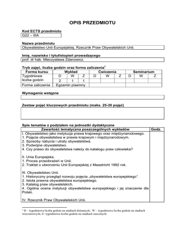 OPIS PRZEDMIOTU Kod ECTS przedmiotu G22 – IIIA Nazwa przedmiotu Obywatelstwo Unii Europejskiej. Rzecznik Praw Obywatelskich Unii. Imię, nazwisko i tytuł/stopień prowadzącego prof. dr hab. Mieczysława Zdanowicz. Tryb zajęć, liczba godzin oraz forma zaliczenia1 Forma kursu Wykład Ćwiczenia Tygodniowa D W Z D W Z liczba godzin 2 1 1 Forma zaliczenia Egzamin pisemny D Seminarium W Z Wymagania wstępne Zestaw pojęć kluczowych przedmiotu (maks. 25-30 pojęć) Spis tematów z podziałem na jednostki dydaktyczne Zawartość tematyczna poszczególnych wykładów I. Obywatelstwo jako instytucja prawa krajowego oraz międzynarodowego. 1. Pojęcie obywatelstwa w prawie krajowym i międzynarodowym. 2. Sposoby nabycia i utraty obywatelstwa. 3. Podwójne obywatelstwo. 4. Czy prawo do obywatelstwa należy do katalogu praw człowieka? II. Unia Europejska. 1. Proces przeobrażeń w Unii. 2. Traktat o utworzeniu Unii Europejskiej z Maastricht 1992 rok. III. Obywatelstwo Unii. 1. Historyczny przegląd rozwoju pojęcia „obywatelstwa europejskiego”. 2. Istota prawna obywatelstwa europejskiego. 3. Katalog praw obywatelskich. 4. Ogólna ocena instytucji obywatelstwa europejskiego i jej znaczenie dla Polski. IV. Rzecznik Praw Obywatelskich Unii. 1 D – tygodniowa liczba godzin na studiach dziennych; W – tygodniowa liczba godzin na studiach wieczorowych; Z- tygodniowa liczba godzin na studiach zaocznych. Godz. 1. Podstawy prawne działania. 2. Struktura organizacyjna Biura Rzecznika. 3. Zakres podmiotowy jego kompetencji. 4. Zakres przedmiotowy jego kompetencji. 5. Dopuszczalność skargi. 6. Procedura rozpatrywania skarg. 7. Ocena działalności Rzecznika. V. Rzecznik Praw Obywatelskich Unii a Rzecznik Praw Człowieka w państwach członkowskich Unii. VI. Rzecznik Praw Obywatelskich w Traktacie Nicejskim. VII. Prace Konwentu – instytucja obywatelstwa Unii i Rzecznika Praw Obywatelskich w przyszłej Konstytucji Unii. VIII. Skarga do Rzecznika a inne przestrzegania prawa wspólnotowego. sposoby pozasądowej Razem godzin2 kontroli 30/16 Literatura obowiązkowa Źródła: 1. Traktat o Unii Europejskiej z 1002 roku. 2. Regulamin działalności Rzecznika Praw Obywatelskich Unii. 3. Wybrane decyzje Rzecznika Praw Obywatelskich. Monografie i artykułu: 1. Podręczniki akademickie z zakresu prawa wspólnotowego w części dotyczącej obywatelstwa Unii i Rzecznika Praw Obywatelskich. 2. A. Łazowski; Ochrona praw jednostek w prawie wspólnot europejskich; Kraków 2002. 3. C. Mik; Obywatelstwo europejskie w świetle prawa wspólnotowego i międzynarodowego; Toruński Rocznik Praw Człowieka i Pokoju 1993, z. 2, str. 63 i nast. 4. U.K. Preuss; Wstępne uwagi o koncepcji obywatelstwa europejskiego (w:) Obywatelstwo w Europie Środkowo-Wschodniej. Materiały z konferencji, Warszawa 1996, str. 15 i nast. Literatura dodatkowa Warunki zaliczenia3 2 30/16 – ogólna liczba godzin zajęć dydaktycznych z danego przedmiotu w układzie „studia dzienne / studia wieczorowe i zaoczne”. 3 Procentowe minimum zaliczeniowe określone tabelą ECTS. ocena dostateczna (3) ocena dobra (4) ocena bardzo dobra (5)