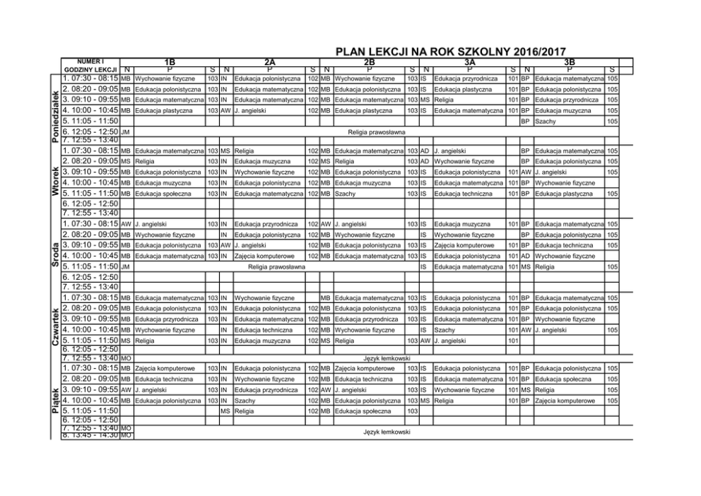 PLAN LEKCJI NA ROK SZKOLNY 2016/2017 Piątek Czwartek Środa Wtorek Poniedziałek NUMER I GODZINY LEKCJI 1. 07:30 - 08:15 2. 08:20 - 09:05 3. 09:10 - 09:55 4. 10:00 - 10:45 5. 11:05 - 11:50 6. 12:05 - 12:50 7. 12:55 - 13:40 1. 07:30 - 08:15 2. 08:20 - 09:05 3. 09:10 - 09:55 4. 10:00 - 10:45 5. 11:05 - 11:50 6. 12:05 - 12:50 7. 12:55 - 13:40 1. 07:30 - 08:15 2. 08:20 - 09:05 3. 09:10 - 09:55 4. 10:00 - 10:45 5. 11:05 - 11:50 6. 12:05 - 12:50 7. 12:55 - 13:40 1. 07:30 - 08:15 2. 08:20 - 09:05 3. 09:10 - 09:55 4. 10:00 - 10:45 5. 11:05 - 11:50 6. 12:05 - 12:50 7. 12:55 - 13:40 1. 07:30 - 08:15 2. 08:20 - 09:05 3. 09:10 - 09:55 4. 10:00 - 10:45 5. 11:05 - 11:50 6. 12:05 - 12:50 7. 12:55 - 13:40 8. 13:45 - 14:30 N 1B P S 2A N P S 2B N P MB Wychowanie fizyczne 103 IN Edukacja polonistyczna MB Edukacja polonistyczna 103 IN Edukacja matematyczna 102 MB Edukacja polonistyczna MB Edukacja matematyczna 103 IN MB Edukacja plastyczna 102 MB Wychowanie fizyczne S 3A N P 102 MB Edukacja plastyczna N 3B P S 103 IS Edukacja przyrodnicza 101 BP Edukacja matematyczna 105 103 IS Edukacja plastyczna 101 BP Edukacja polonistyczna 105 Edukacja matematyczna 102 MB Edukacja matematyczna 103 MS Religia 103 AW J. angielski S 103 IS 101 BP Edukacja przyrodnicza Edukacja matematyczna 101 BP Edukacja muzyczna BP Szachy 105 105 105 Religia prawosławna JM MB Edukacja matematyczna 103 MS Religia 102 MB Edukacja matematyczna 103 AD J. angielski MS Religia 103 IN Edukacja muzyczna 102 MS Religia 103 AD Wychowanie fizyczne MB Edukacja polonistyczna 103 IN Wychowanie fizyczne 102 MB Edukacja polonistyczna 103 IS Edukacja polonistyczna MB Edukacja muzyczna 103 IN Edukacja polonistyczna 102 MB Edukacja muzyczna 103 IS Edukacja matematyczna 101 BP Wychowanie fizyczne MB Edukacja społeczna 103 IN Edukacja matematyczna 102 MB Szachy 103 IS Edukacja techniczna 101 BP Edukacja plastyczna AW J. angielski 103 IN Edukacja przyrodnicza 102 AW J. angielski 103 IS Edukacja muzyczna 101 BP Edukacja matematyczna 105 Edukacja polonistyczna 102 MB Wychowanie fizyczne MB Wychowanie fizyczne MB Edukacja polonistyczna IN 103 AW J. angielski MB Edukacja matematyczna 103 IN Zajęcia komputerowe 102 MB Edukacja polonistyczna Wychowanie fizyczne Zajęcia komputerowe 101 BP Edukacja techniczna Edukacja polonistyczna 101 AD Wychowanie fizyczne IS Wychowanie fizyczne MB Edukacja polonistyczna 103 IN Edukacja polonistyczna MB Edukacja przyrodnicza 103 IN Edukacja matematyczna 102 MB Edukacja przyrodnicza MB Wychowanie fizyczne IS 102 MB Edukacja matematyczna 103 IS MB Edukacja matematyczna 103 IN 105 105 BP Edukacja polonistyczna 105 Edukacja matematyczna 101 MS Religia 105 105 Edukacja polonistyczna 101 BP Edukacja matematyczna 105 103 IS Edukacja polonistyczna 101 BP Edukacja polonistyczna 105 103 IS Edukacja matematyczna 101 BP Wychowanie fizyczne Edukacja techniczna 102 MB Wychowanie fizyczne 103 IN Edukacja muzyczna 102 MS Religia MB Zajęcia komputerowe 103 IN Edukacja polonistyczna 102 MB Zajęcia komputerowe 103 IS Edukacja polonistyczna MB Edukacja techniczna 103 IN Wychowanie fizyczne 102 MB Edukacja techniczna 103 IS Edukacja matematyczna 101 BP Edukacja społeczna 105 AW J. angielski 103 IN Edukacja przyrodnicza 102 AW J. angielski 103 IS Wychowanie fizyczne 101 MS Religia 105 MB Edukacja polonistyczna 103 IN Szachy 102 MB Edukacja polonistyczna 103 MS Religia 101 BP Zajęcia komputerowe 105 102 MB Edukacja społeczna 103 MS Religia IN MB Edukacja matematyczna 103 IS 102 MB Edukacja polonistyczna BP Edukacja polonistyczna 105 101 AW J. angielski 103 IS Religia prawosławna JM BP Edukacja matematyczna 105 Szachy 101 AW J. angielski 105 101 Język łemkowski MO MS Religia MO MO IS 103 AW J. angielski Język łemkowski 101 BP Edukacja polonistyczna 105 PLAN LEKCJI NA ROK SZKOLNY 2016/2017 3A N. Ind. Piątek Czwartek Środa Wtorek Poniedziałek N 1 2 3 4 5 6 7 1 2 3 4 5 6 7 1 2 3 4 5 6 7 1 2 3 4 5 6 1 2 3 4 5 6 P IS Ed. pol. IS Ed. mat. S 4A N P S 5A N P AW J. angielski 17 IW 13 AW J. angielski Przyroda S IW 1 RG Matematyka AS J. polski 1 MS Religia 2 RG Matematyka 4 MM J. polski 4 AS Historia i społecz. 1 AD Wychowanie fizyczne MS Religia 13 RG Matematyka S N 6B P S 1 RG Matematyka 4 4 MS Religia 2 17 AD Wychowanie fizyczne 17 RO Przyroda MM J. polski 13 17 Religia prawosławna Przyroda IW Godzina z wychow. AS Historia i społecz. LS Zajęcia komputerowe WF/ZK 1 IW Przyroda 13 AS J. polski 2 RG Matematyka 17 DB Godzina z wychow. 106 WF/ZK 13 RG Matematyka 106 RG Matematyka 17 MM J. polski 2 MM J. polski 17 RG Matematyka 4 4 AS J. polski 1 RO Przyroda 13 AW J. angielski 17 2 AS Godzina z wychow. 1 RO Godzina z wychow. 13 RG Godzina z wychow. 106 2 AS J. polski RG Matematyka 4 IW AS J. polski 1 RG Matematyka 4 AW J. angielski AS J. polski 1 AW J. angielski 17 RG Matematyka MS RelDZ 1 IW WF/ZK AW J. angielski Przyroda Przyroda 13 AS J. polski 13 MS RelDZ Zajęcia komputerowe 106 PW Zajęcia techniczne 13 RG Matematyka 1 MM J. polski 17 RO Przyroda 4 AD Wychowanie fizyczne 13 AW J. angielski 17 AS J. polski 1 RG Matematyka 4 MM J. polski IW 13 RG Matematyka 4 AW J. angielski 2 PW Muzyka 17 AS Historia i społecz. 1 IW RG Matematyka AD WFDZ AD WFDZ 4 PW Muzyka PW Z. tech PW Plastyk Język łemkowski Przyroda 17 AS J. polski 17 PW Z.tech 17 PW Plasty RG Matematyka 4 AW J. angielski 17 AS J. polski 1 IW 13 PW Muzyka PW Zajęcia techniczne AW J. angielski Przyroda 17 AS J. polski 2 RG Matematyka PW ZTDZ PW PLDZ Język łemkowski 13 AD WF 1 IW Przyroda 17 RG Matematyka 17 MS Religia 17 RG Matematyka 4 MM J. polski 4 17 17 AD Wychowanie fizyczne 13 MS Religia RO Przyrod 17 AS Historia i społecz. 2 13 1 2 AW J. angielski 17 MM J. polski RG Matematyka 13 1 4 13 AD WF 4 IW Przyroda 13 RG Zajęcia komputerowe PW Muzyka 13 106 17 PW Plastyka 13 MM J. polski 1 17 RG Matematyka 4 MM J. polski 2 1 RG Matematyka 4 MM J. polski 4 AS J. polski 1 AD Wychowanie fizyczne 13 AD WFCH 13 AD WFCH 4 106 PW Muzyka PW Plastyka 2 106 Religia prawosławna JM Przyroda 1 4