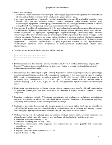 Opis przedmiotu zamówienia 1. Zakres prac obejmuje: a/ usuwanie z jezdni elementów wypadkowych stanowiących zagrożenie dla bezpieczeństwa ruchu takich jak np.: rozlany beton, rozsypany żwir, asfalt, szkło, gałęzie drzew i inne, b/ sprzątanie powypadkowe – usuwanie z miejsc powypadkowych wszelkich odpadów zalegających na drogach takich jak np.: elementy odzieży, kawałki zderzaków, szkła, plastiku, rozlane płyny eksploatacyjne z pojazdów i inne odpady, których usuwanie nie jest objęte rozporządzeniem w sprawie szczegołowych zasad organizacji krajowego systemu ratowniczo-gaśniczego 2. Oczyszczenie dróg objętych załącznikiem Nr 1 do umowy będzie pisemnie zlecane przez Zamawiającego i przekazywane Wykonawcy pisemnie (lub faxem), w którym zostanie określony zakres prac, miejsce i termin wykonania. W sytuacjach wymagających natychmiastowego (interwencyjnego) działania Zamawiający zleci prace telefonicznie, co zostanie potwierdzone pisemnie (lub faxem) w ciągu 1 doby od dnia zgłoszenia. Wykonawca powinien podjąć działania w miejscu ustalenia lokalizacji zdarzenia zgodnie ze złożoną ofertą - maksymalnie w ciągu 2 godz. od przekazania informacji. Wykonawca musi dysponować 3 numerami telefonicznymi z opcją nagrywania rozmów w celu wyeliminowania ewentualnych spornych spraw związanych z przekazywaniem telefonicznych zleceń przez Zamawiającego. 3. Osobami upoważnionymi do zlecania prac telefonicznie są: 1. ……………………………………. 2. ……………………………………. 3. ……………………………………. 4. ……………………………………. 4. Termin realizacji: od dnia zawarcia umowy do dnia 31.12.2016 r. w każdy dzień roboczy od godz. 1500 do godz. 700 dnia następnego i całodobowo w dni wolne i święta w sytuacji zaistnienia konieczności wykonania prac określonych pkt 1. 5. Przy realizacji prac określonych w pkt 1 umowy Wykonawca zobowiązuje się wykonywać prace objęte przedmiotem zamówienia, zgodnie z obowiązującymi przepisami, w tym m.in.: ustawą z dn. 13 września 1996 r. o utrzymaniu czystości i porządku w gminach (Dz. U. z 2013 r., poz. 1399 ze zm.), ustawą z dn. 14 grudnia 2012 r. o odpadach (Dz. U. z 2013 r., poz. 21, ze zm.), ustawą z dn. 16 kwietnia 2004 r. o ochronie przyrody (Dz. U. z 2013 r., poz. 627 ze zm.) oraz przepisami wykonawczymi do wymienionych ustaw. 6. Wykonawca zobowiązany jest przekazać zebrane odpady z oczyszczania terenów objętych zamówieniem do jednostki posiadającej stosowne zezwolenia na transport i odbiór odpadów zgodnie z ustawą o odpadach. 7. Pozostałe wymienione odpady Wykonawca zobowiązany jest przekazywać podmiotom posiadającym stosowne zezwolenie na odzysk lub unieszkodliwienie odpadów. Wykonawca każdorazowo przedłoży dokumenty potwierdzające przekazanie odpadów do utylizacji. 8. Wykonawca powinien dysponować taką ilością sprzętu i osób, która będzie niezbędna do prawidłowej realizacji zadań objętych umową, uwzględniając wymagania dotyczące wykonawstwa i wymogi czasowe. Prace mogą być wykonywane zarówno mechanicznie jak i z ręcznym doczyszczeniem. 9. Wykonawca zapewni do realizacji prac na terenach objętych zamówieniem własnym staraniem i na własny koszt wszelkie materiały, transport oraz niezbędną minimalną ilość i rodzaj nw. sprzętu: 1. samochód towarowo-osobowy – 1 szt., 2. samochód ciężarowy min. 10 Mg – 1 szt., 3.zamiatarka mechaniczna mała ciągniona lub zabudowana na ramie pojazdu lub samojezdna kompaktowa – 1 szt., 4. ładowarka – 1 szt., 5. zmywarka mechaniczna lub polewaczka – 1 szt., 6. piasek 0-2 mm – 1 Mg. 1 7. sorbent 10. Pojazdy muszą być oznakowane nazwą firmy na własny koszt i we własnym zakresie Wykonawcy. 11. Sprzęt powinien być przygotowany w takim stopniu, aby spełniał wymogi właściwego wykonania prac i mógł być użyty w okresie realizacji przedmiotu umowy. 12. Wykonawca celem zapewnienia stałego kontaktu z Zamawiającym musi posiadać czynny całodobowo adres email, 3 numery telefoniczne oraz musi być dyspozycyjny w dni wolne od pracy, niedziele i święta w sytuacjach wymagających pilnego działania oraz w każdy dzień roboczy od godz. 1500 do godz. 700 dnia następnego. 13. Wykonawca zobowiązany jest do dysponowania co najmniej 3 osobami, które będą uczestniczyć w wykonywaniu zamówienia. 14. Wykonawca zapewnia właściwe oznakowanie miejsca robót. 15. Płatność obejmuje:* 1) stałą gotowość do wykonania prac – dyżur, od godz. 1500 do godz. 700 każdego dnia roboczego i 24 godziny w dni wolne od pracy i święta za 1 godz. gotowości – dyżuru 2) usunięcie z jedni elementów zagrażających bezpieczeństwu ruchu drogowego: a/ za 1 m-g pracy samochodu transportowo-osobowego b/ za 1 m-g pracy samochodu ciężarowego min. 10 Mg c/ za 1 m-g pracy ładowarki d/ za 1 m-g pracy zamiatarki e/ za 1 r-g pracy pracownika 2) sprzątanie powypadkowe i wywóz odpadów nie objętych rozporządzeniem w sprawie szczegółowych zasad o.k.s.r-g: a/ za 1 m-g pracy samochodu transportowo-osobowego, b/ za 1 m-g pracy samochodu ciężarowego min. 10 Mg c/ za 1 m-g pracy ładowarki d/ za 1 m-g pracy zamiatarki e/ za 1 r-g pracy pracownika f/ za 1 Mg piasku 0-2 mm g/ za 1 Mg sorbentu 4) utylizację 1 Mg odpadów wg faktury podmiotu upoważnionego do utylizacji odpadów, zwrot poniesionych kosztów na utylizację odpadów udokumentowany fakturą. *m-g i r-g liczymy od zgłoszenia dojazdu na miejsce zdarzenia i rozpoczęcia robót do ich zakończenia 2