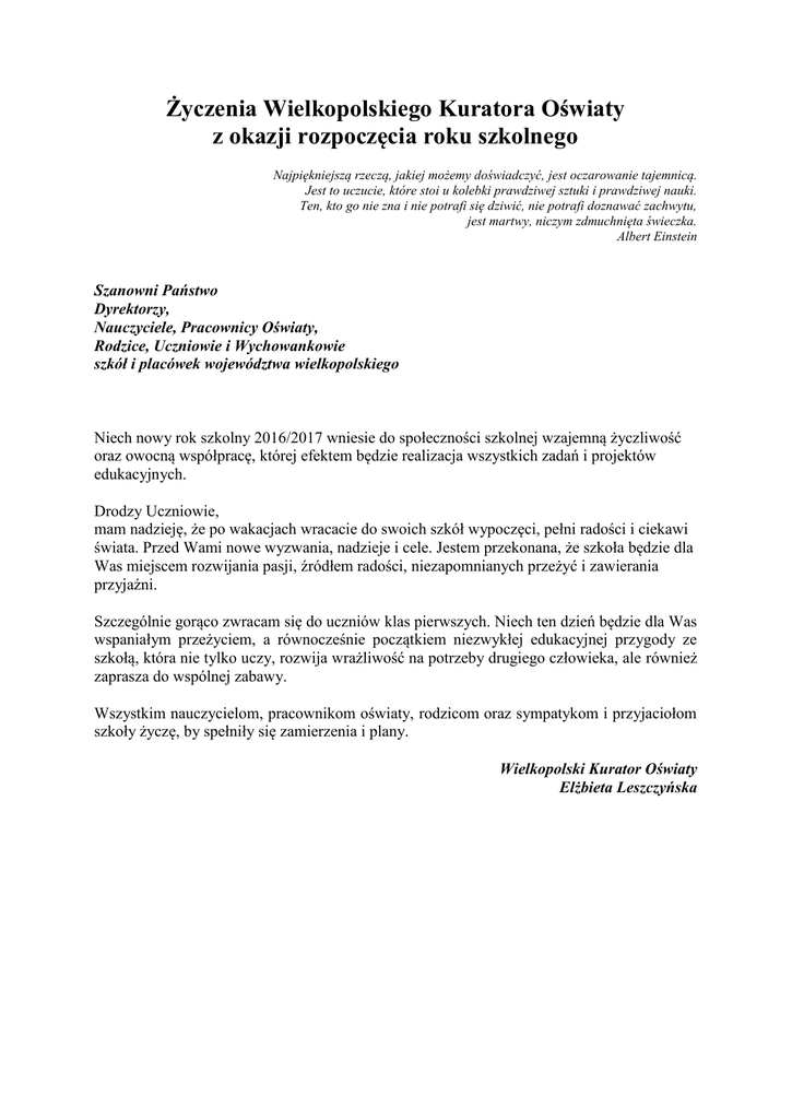 Życzenia Wielkopolskiego Kuratora Oświaty z okazji rozpoczęcia roku szkolnego Najpiękniejszą rzeczą, jakiej możemy doświadczyć, jest oczarowanie tajemnicą. Jest to uczucie, które stoi u kolebki prawdziwej sztuki i prawdziwej nauki. Ten, kto go nie zna i nie potrafi się dziwić, nie potrafi doznawać zachwytu, jest martwy, niczym zdmuchnięta świeczka. Albert Einstein Szanowni Państwo Dyrektorzy, Nauczyciele, Pracownicy Oświaty, Rodzice, Uczniowie i Wychowankowie szkół i placówek województwa wielkopolskiego Niech nowy rok szkolny 2016/2017 wniesie do społeczności szkolnej wzajemną życzliwość oraz owocną współpracę, której efektem będzie realizacja wszystkich zadań i projektów edukacyjnych. Drodzy Uczniowie, mam nadzieję, że po wakacjach wracacie do swoich szkół wypoczęci, pełni radości i ciekawi świata. Przed Wami nowe wyzwania, nadzieje i cele. Jestem przekonana, że szkoła będzie dla Was miejscem rozwijania pasji, źródłem radości, niezapomnianych przeżyć i zawierania przyjaźni. Szczególnie gorąco zwracam się do uczniów klas pierwszych. Niech ten dzień będzie dla Was wspaniałym przeżyciem, a równocześnie początkiem niezwykłej edukacyjnej przygody ze szkołą, która nie tylko uczy, rozwija wrażliwość na potrzeby drugiego człowieka, ale również zaprasza do wspólnej zabawy. Wszystkim nauczycielom, pracownikom oświaty, rodzicom oraz sympatykom i przyjaciołom szkoły życzę, by spełniły się zamierzenia i plany. Wielkopolski Kurator Oświaty Elżbieta Leszczyńska