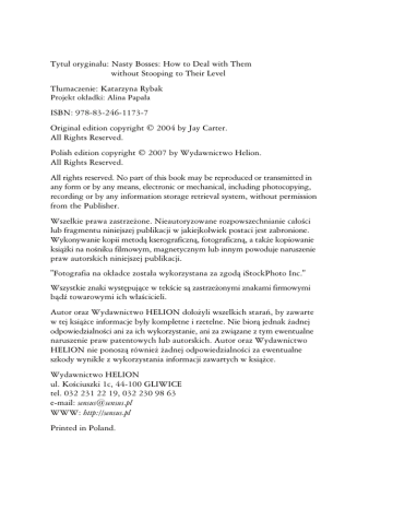 Tytuł oryginału: Nasty Bosses: How to Deal with Them without Stooping to Their Level Tłumaczenie: Katarzyna Rybak Projekt okładki: Alina Papała ISBN: 978-83-246-1173-7 Original edition copyright © 2004 by Jay Carter. All Rights Reserved. Polish edition copyright © 2007 by Wydawnictwo Helion. All Rights Reserved. All rights reserved. No part of this book may be reproduced or transmitted in any form or by any means, electronic or mechanical, including photocopying, recording or by any information storage retrieval system, without permission from the Publisher. Wszelkie prawa zastrzeżone. Nieautoryzowane rozpowszechnianie całości lub fragmentu niniejszej publikacji w jakiejkolwiek postaci jest zabronione. Wykonywanie kopii metodą kserograficzną, fotograficzną, a także kopiowanie książki na nośniku filmowym, magnetycznym lub innym powoduje naruszenie praw autorskich niniejszej publikacji. "Fotografia na okładce została wykorzystana za zgodą iStockPhoto Inc." Wszystkie znaki występujące w tekście są zastrzeżonymi znakami firmowymi bądź towarowymi ich właścicieli. Autor oraz Wydawnictwo HELION dołożyli wszelkich starań, by zawarte w tej książce informacje były kompletne i rzetelne. Nie biorą jednak żadnej odpowiedzialności ani za ich wykorzystanie, ani za związane z tym ewentualne naruszenie praw patentowych lub autorskich. Autor oraz Wydawnictwo HELION nie ponoszą również żadnej odpowiedzialności za ewentualne szkody wynikłe z wykorzystania informacji zawartych w książce. Wydawnictwo HELION ul. Kościuszki 1c, 44-100 GLIWICE tel. 032 231 22 19, 032 230 98 63 e-mail: [email protected] WWW: http://sensus.pl Printed in Poland. 1 DOBRY SZEF W celu stworzenia definicji wstrętnego szefa musimy porównać go z dobrym szefem. Na początku spójrzmy na listę okropnych cech i kontrastujących z nimi cech dobrych. Pamiętaj jednak o tym, że prawdziwe życie nie jest równie czarno-białe. Są to modele całkowicie skrajne. Wstrętny szef Dobry szef Dominuje Zachęca Obwinia innych Bierze na siebie część odpowiedzialności Izoluje się Jest otwarty Waha się Okazuje zainteresowanie Zastrasza Ludzie czują się dobrze w jego towarzystwie Terroryzuje Buduje w ludziach poczucie pewności siebie Mówi, nie słucha Słucha Grozi Chroni 29 30 Wstrętni szefowie Jest egoistyczny Ma „zdrowe” poczucie własnej wartości Jest arogancki Okazuje skromność Ma poczucie władzy Ma poczucie celu Wzbudza strach Wzbudza szacunek Może być inteligentny, ale nie mądry Jest mądry Dostrzega jedynie własne potrzeby Dostrzega całościowy obraz sytuacji Zaszczepia w ludziach brak wiary w siebie Wydobywa z ludzi to, co w nich najlepsze Nie okazuje szacunku Okazuje szacunek CHARYZMA Dobrzy szefowie mają zdolność nawiązywania kontaktu z ludźmi, szanują innych jako ludzi oraz podziwiają ich. Te trzy cechy stanowią sekret charyzmy. Nawiązywanie kontaktu z ludźmi polega po prostu na dotykaniu ich, podawaniu ręki, uśmiechaniu się, patrzeniu prosto w oczy. Szanowanie innych jako ludzi oznacza okazywanie im szczerego zainteresowania, uświadamianie sobie tego, co czują, oraz wykazywanie zrozumienia. Nie musisz się zgadzać z opiniami innych — ważne, aby zrozumieć drugą osobę. W sposób pełen empatii dajesz znać, że rozumiesz ich uczucia. Podziwianie ludzi polega na odszukaniu i określeniu ich pozytywnych cech. Ludzie pragną wiedzieć, że je dostrzegasz. Zauważ, że szklanka jest w połowie pełna, a nie w połowie pusta. Dobry szef Dobrzy szefowie okazują innym szacunek nie ze względu na to, kim są ci inni, ale ze względu na to, kim są oni sami. Tym samym nie tolerują oni braku szacunku ze strony innych ludzi. Dobrzy szefowie nie są współzależni i nie dążą do tego, aby wszyscy darzyli ich sympatią (chociaż większość osób i tak ma do nich taki stosunek). Dobrzy szefowie potrafią powiedzieć Ci, żebyś poszedł do diabła, w taki sposób, że będziesz szczęśliwy z powodu zbliżającej się podróży (choć prawdopodobnie i tak nie zachowają się w podobny sposób). Teraz przyjrzyjmy się uważnie wielu typom wstrętnych szefów. 31