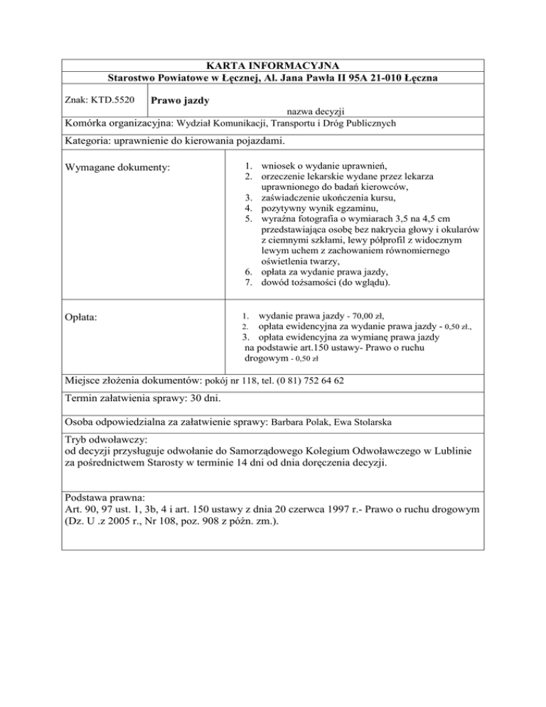 KARTA INFORMACYJNA Starostwo Powiatowe w Łęcznej, Al. Jana Pawła II 95A 21-010 Łęczna Znak: KTD.5520 Prawo jazdy nazwa decyzji Komórka organizacyjna: Wydział Komunikacji, Transportu i Dróg Publicznych Kategoria: uprawnienie do kierowania pojazdami. Wymagane dokumenty: Opłata: 1. wniosek o wydanie uprawnień, 2. orzeczenie lekarskie wydane przez lekarza uprawnionego do badań kierowców, 3. zaświadczenie ukończenia kursu, 4. pozytywny wynik egzaminu, 5. wyraźna fotografia o wymiarach 3,5 na 4,5 cm przedstawiająca osobę bez nakrycia głowy i okularów z ciemnymi szkłami, lewy półprofil z widocznym lewym uchem z zachowaniem równomiernego oświetlenia twarzy, 6. opłata za wydanie prawa jazdy, 7. dowód toŜsamości (do wglądu). wydanie prawa jazdy - 70,00 zł, 2. opłata ewidencyjna za wydanie prawa jazdy - 0,50 zł., 3. opłata ewidencyjna za wymianę prawa jazdy na podstawie art.150 ustawy- Prawo o ruchu drogowym - 0,50 zł 1. Miejsce złoŜenia dokumentów: pokój nr 118, tel. (0 81) 752 64 62 Termin załatwienia sprawy: 30 dni. Osoba odpowiedzialna za załatwienie sprawy: Barbara Polak, Ewa Stolarska Tryb odwoławczy: od decyzji przysługuje odwołanie do Samorządowego Kolegium Odwoławczego w Lublinie za pośrednictwem Starosty w terminie 14 dni od dnia doręczenia decyzji. Podstawa prawna: Art. 90, 97 ust. 1, 3b, 4 i art. 150 ustawy z dnia 20 czerwca 1997 r.- Prawo o ruchu drogowym (Dz. U .z 2005 r., Nr 108, poz. 908 z późn. zm.).