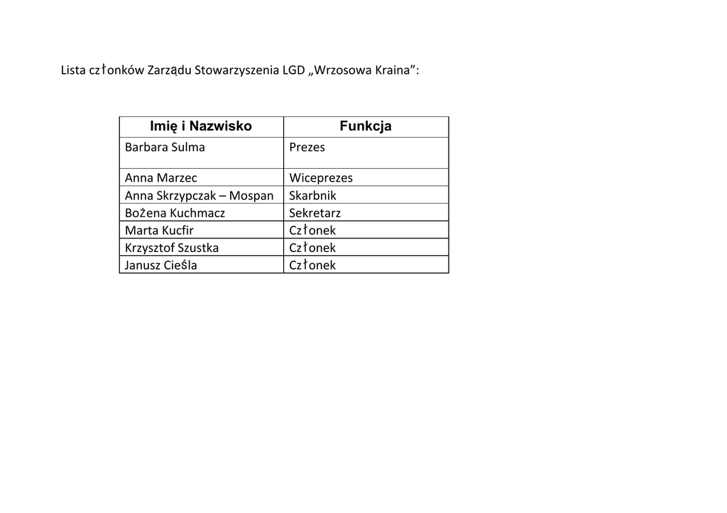 Lista członków Zarządu Stowarzyszenia LGD „Wrzosowa Kraina”: Imię i Nazwisko Barbara Sulma Funkcja Prezes Anna Marzec Anna Skrzypczak – Mospan Bożena Kuchmacz Marta Kucfir Krzysztof Szustka Janusz Cieśla Wiceprezes Skarbnik Sekretarz Członek Członek Członek Lista Członków Walnego Zebrania: L IMIĘ I NAZWISKO ORGANIZACJA ADRES P. 1. Andrzej Dutkowski Urząd Gminy Bolesławiec Wójt 2. Franciszek Skibicki 59-700 Bolesławiec Urząd Miasta i Gminy Chocianów Burmistrz 3. Leszek Frąckowiak Tadeusz Kielan Urząd Miejski w Przemkowie Zdzisław Tersa Urząd Gminy Lubin Dawid Stachura Ul. Wł. Łokietka 6 59-300 Lubin Urząd Gminy Kunice Wójt 6. Ul. Plac Wolności 25 59-170 Przemków Wójt 5. Ul. Ratuszowa 10 59-140 Chocianów Sekretarz 4. Ul. Teatralna 1a Ul. Gwarna 1 59-216 Kunice Urząd Gminy Miłkowice Wójt Ul. II Armii Wojska Polskiego 71 59-222 Miłkowice 7. Andrzej Pyrz Urząd Gminy Chojnów Ul. Fabryczna 1 Wójt 8. Dariusz Pawliszczy 59-225 Chojnów Urząd Gminy Gromadka Wójt 9. Jan Serkies Ul. Gen. Wł. Sikorskiego 9 59- 706 Gromadka Urząd Miasta Chojnów Wójt Ul. Pl. Zamkowy 1 59- 225 Chojnów Brygida Mytkowska pełnomocnictwo 10 Bogumiła Naruszewicz Gospodarstwo Agroturystyczne „Gajówka Głuszec” 59-707 Gromadka . 11 . 12 Teresa Urbaniak Wiceprezes Anna Małecka Wiceprezes Bogusław Więcek Bank Spółdzielczy w Przemkowie Spółka Rybacka „NIEDŹWIEDZICE” Sp. z o.o. . Goliszów nr 92A 59-225 Chojnów Janusz Prymak Gospodarstwo Rybackie Ul. Rybacka 3A 59-222 Miłkowice . 14 Ul. Głogowska 12A 59-170 Przemków . 13 Borówki 25 Elżbieta Kwaśnik Przedsiębiorstwo Produkcji, Handlu i Usług Gospodarstwo Rybackie Spółka z o.o. Raszowa Mała 59-323 Miłoradzice 15 Beata Orłowska - Mielniczuk Biuro Tłumaczeń 59-216 Kunice . 16 Krzysztof Karaim Wanda Kuzyszyn Wioletta Panasowiec Tadeusz Gładysz . Ul. II Armii Wojska 59-222 Miłkowice Dariusz Dudziak Kraśnik Dolny 61A 59-700 Bolesławiec . 21 Szczytnik nad Kaczawą 64 Polskiego 26 . 20 Ul. Osiedle Głogowskie 57 59-216 Kunice . 19 Chościszowice 10A 59-170 Przemków . 18 Gospodarstwo Rybackie 59-700 Bolesławiec . 17 Ul. Okrzei 1 Krystyna Cybiniak Borówki 15 59-706 Gromadka 22 Rafał Zguda Niedźwiedzice 23 59-225 Chojnów . 23 Krzysztof Ryglowski Trzebnice 130 59-140 Chocianów . 24 Eugeniusz Cudziło Niemstów 98 59-323 Miłoradzice . 25 . 26 Anna Paliszkiewicz Fundacja „Gramineae” prezes Anetta Kamińska prezes Ul. Kolejowa 59-140 Chocianów Fundacja „Pro Futuris” Ul. Chopina 15/12 59-700 Bolesławiec . 27 . 28 . Ewa Halbryt Stowarzyszenie „Nowe Kazamaty” prezes Barbara Kulewicz Krzysztof Zakrzewski Motyle 8 59-706 Gromadka Stowarzyszenie Na Rzecz Wsi Pątnów Legnicki Pątnów Legnicki 11a 59-216 Kunice 29 . 30 Wanda Dobrzyńska Stowarzyszenie na rzecz rozwoju wsi Gogołowice Sylwia Łebek Tadeusz Gładysz 59-323 Miłoradzice Ochotnicza Straż Pożarna w Miłkowicach 59-222 Miłkowice Magdalena Masternak Stowarzyszenie Miłośników Przyrody „Amazonka” . 33 Piotr Dąbrowa Ochotnicza Straż Pożarna Rokitki prezes Irena Sałajczyk Gospodarstwo Agroturystyka „Zacisze” . Osła 82 59-706 Gromadka Czesław Pietrewicz Spalona ul. Młyńska 9 59-216 Kunice . 35 Rokitki 26 59-225 Chojnów . 34 Ostaszów 2 59-170 Przemków . 32 Ul. II Armii Wojska Polskiego 69 . 31 Gogołowice 21 Krzysztof Szustka Fundacja Ekologiczna „Zielona Akcja” Ul. Wrocławska 41 59-220 Legnica 36 Olga Urda Modła 52 59-706 Gromadka Jacek Biniarz Ostaszów 23A . 37 59-170 Przemków . 38 . 40 . 41 Anna Kołodziejska Ewa Smutyło prezes . Fundacja „Edusilesia” Ul. Świętej Jadwigi 2a Lubiąż 56-100 Wołów Regina Kijewska Chróstnik 28A 59-311 Chróstnik Franciszek Kijewski Chróstnik 28A 59-311 Chróstnik . 43 Ul. Armii Krajowej prezes . 42 Fundacja „Atena Noctua” Bożena Michalik - Kroczek Ul. Pawia 35/5 59-300 Lubin 44 Stanisław Dołżański Węgielin 1 59-170 Przemków . 45 . 46 . 47 . 48 . 49 Wojciech Drozd prezes Barbara Sulma Anna Skrzypczak – Mospan Prezes Marek Cieślak Wiceprezes Rafał Paliszkiewicz . Chocianowiec 154 59-140 Chocianowiec Fundacja „Wrzosowa Kraina” prezes Ul. Kościuszki 25 59-140 Chocianów Stowarzyszenie Ochrony Krajobrazu w Borach Ul. Kościuszki 25 Dolnośląskich 59-140 Chocianów Fundacja „Sport- szansą dla wszystkich” Ul. Kolejowa 30 Prezes 59-140 Chocianów Karol Szkutnik Obora ul. Lubińska 36 59-335 Lubin . 50 Stowarzyszenie Zespół Folklorystyczny „Echo” Adrian Szkutnik Obora ul. Lubińska 36 59-335 Lubin 51 Leokadia Szkutnik Obora ul. Lubińska 36 59-335 Lubin . 52 Karol Junior Szkutnik Obora ul. Lubińska 36 59-335 Lubin . 53 Sebastian Puzio Brunów 17 59-170 Chocianów . 54 Barbara Puzio Brunów 17 59-170 Chocianów . 55 Daniel Puzio Brunów 17 59-170 Chocianów . 56 . 57 . Ewa Jezierska – Gogulska Prezes Józef Giedrojć Stowarzyszenie Przyjaciół Gimnazjum w Spalonej Spalona, ul. Legnicka 52 „GIMSPALONA” 59-216 Kunice Ochotnicza Straż Pożarna w Kunicach Ul. Legnicka 13 59-216 Kunice 58 Stanisław Chodak Nowy Dwór 7A 59-160 Radwanice . 59 Anna Skrzypczak - Mospan Biuro Rachunkowe 59-140 Chocianów . 60 Jerzy Gucma Ostaszów 2 59-170 Przemków . 61 Jacek Cieślak Ul. Lipowa 22 59-170 Przemków . 62 Leszek Cieślak Ul. Rybna 10c/21 59-170 Przemków . 63 Ul. Żeromskiego 1 Janusz Latoch Okręg Polskiego Związku Wędkarskiego w Jeleniej Górze Ul. Wańkowicza 13 58-500 Jelenia Góra Polski Związek Wędkarski Okręg w Legnicy Ul. Żwirki i Wigury 5 . 64 . Iwona Kijora 59-220 Legnica 65 Czesław Dębicki Ul. Żwirki i Wigury 5/3 59-220 Legnica . 66 Katarzyna Jaworska Ul. Kościuszki 25A 59-140 Chocianów . 67 Waldemar Kudła Związek Pszczelarzy Ziemi Legnickiej 59-220 Legnica . 68 Magdalena Włodarska . 70 . 71 . Przedsiębiorstwo Rolno -Usługowo – Handlowe „HODROL” Sp. z o.o. . 69 Ul. Okrzei 12 Łukasz Puźniecki Agencja Rozwoju Regionalnego ARLEG S.A prezes Maria Borkowska 59-140 Chocianów Ul. Rataja 26 59-220 Legnica Bank Spó
