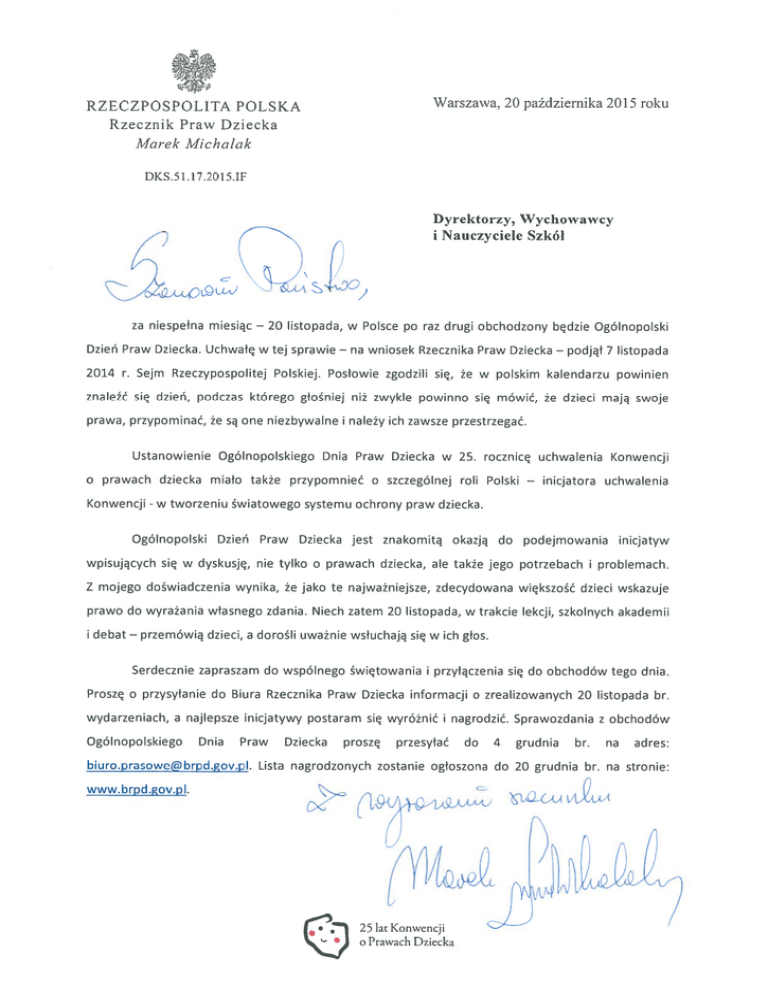 Warszawa, 20 października 2015 roku RZECZPOSPOLITA POLSKA Rzecznik Praw Dziecka Marek Michalak DKS.51.17.2015.IF Dyrektorzy, Wychowawcy i Nauczyciele Szkól za niespełna miesiąc — 20 listopada, w Polsce po raz drugi obchodzony będzie Ogólnopolski Dzień Praw Dziecka. Uchwałę w tej sprawie — na wniosek Rzecznika Praw Dziecka — podjął 7 listopada 2014 r. Sejm Rzeczypospolitej Polskiej. Posłowie zgodzili się, że w polskim kalendarzu powinien znaleźć się dzień, podczas którego głośniej niż zwykle powinno się mówić, że dzieci mają swoje prawa, przypominać, że są one niezbywalne i należy ich zawsze przestrzegać. Ustanowienie Ogólnopolskiego Dnia Praw Dziecka w 25. rocznicę uchwalenia Konwencji o prawach dziecka miało także przypomnieć o szczególnej roli Polski — inicjatora uchwalenia Konwencji w tworzeniu światowego systemu ochrony praw dziecka. - Ogólnopolski Dzień Praw Dziecka jest znakomitą okazją do podejmowania inicjatyw wpisujących się w dyskusję, nie tylko o prawach dziecka, ale także jego potrzebach i problemach. Z mojego doświadczenia wynika, że jako te najważniejsze, zdecydowana większość dzieci wskazuje prawo do wyrażania własnego zdania. Niech zatem 20 listopada, w trakcie lekcji, szkolnych akademii i debat — przemówią dzieci, a dorośli uważnie wsłuchają się w ich głos. Serdecznie zapraszam do wspólnego świętowania i przyłączenia się do obchodów tego dnia. Proszę o przysyłanie do Biura Rzecznika Praw Dziecka informacji o zrealizowanych 20 listopada br. wydarzeniach, a najlepsze inicjatywy postaram się wyróżnić i nagrodzić. Sprawozdania z obchodów Ogólnopolskiego Dnia Praw Dziecka proszę przesyłać do 4 grudnia br. na adres: [email protected]. Lista nagrodzonych zostanie ogłoszona do 20 grudnia br. na stronie: www.brpd.oy.pl. • 25 ta Konwencji o Prawach Dziecka