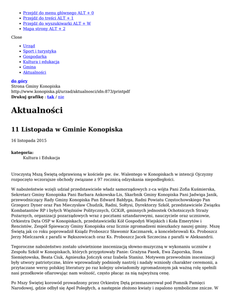 Przejdź do menu głównego ALT + 0 Przejdź do treści ALT + 1 Przejdź do wyszukiwarki ALT + W Mapa strony ALT + 2 Close Urząd Sport i turystyka Gospodarka Kultura i edukacja Gmina Aktualności do góry Strona Gminy Konopiska http://www.konopiska.pl/urzad/aktualnosci/idn:873/printpdf Drukuj grafikę : tak / nie Aktualności 11 Listopada w Gminie Konopiska 16 listopada 2015 kategoria: Kultura i Edukacja Uroczystą Mszą Świętą odprawioną w kościele pw. św. Walentego w Konopiskach w intencji Ojczyzny rozpoczęto wczorajsze obchody związane z 97 rocznicą odzyskania niepodległości. W nabożeństwie wzięli udział przedstawiciele władz samorządowych z-ca wójta Pani Zofia Kuśmierska, Sekretarz Gminy Konopiska Pani Barbara Ankowska-Lis, Skarbnik Gminy Konopiska Pani Jadwiga Janik, przewodniczący Rady Gminy Konopiska Pan Edward Bałdyga, Radni Powiatu Częstochowskiego Pan Grzegorz Dyner oraz Pan Mieczysław Chudzik, Radni, Sołtysi, Dyrektorzy Szkół, przedstawiciele Związku Kombatantów RP i byłych Więźniów Politycznych, GCKiR, gminnych jednostek Ochotniczych Straży Pożarnych, organizacji pozarządowych wraz z pocztami sztandarowymi, nauczyciele oraz uczniowie, Orkiestra Dęta OSP w Konopiskach, przedstawicielki Kół Gospodyń Wiejskich i Koła Emerytów i Rencistów, Zespół Śpiewaczy Gminy Konopiska oraz licznie zgromadzeni mieszkańcy naszej gminy. Mszę Świętą jak co roku poprowadził Ksiądz Proboszcz Sławomir Kaczmarek, a koncelebrowali Ks. Proboszcz Jerzy Mielczarek z parafii w Rększowicach oraz Ks. Proboszcz Jacek Szczecina z parafii w Aleksandrii. Tegoroczne nabożeństwo zostało uświetnione inscenizacją słowno-muzyczną w wykonaniu uczniów z Zespołu Szkół w Konopiskach, których przygotowały Panie: Grażyna Pasek, Ewa Zaporska, Ilona Siemiętowska, Beata Ciuk, Agnieszka Jończyk oraz Izabela Stanisz. Motywem przewodnim inscenizacji były utwory patriotyczne, które wprowadzały podniosły nastrój i nadały wzniosły charakter ceremonii, a przytaczane wersy polskiej literatury po raz kolejny uświadomiły zgromadzonym jak ważną rolę spełnili nasi przodkowie ofiarowując nam wolność, często płacąc za nią najwyższą cenę. Po Mszy Świętej korowód prowadzony przez Orkiestrę Dętą przemaszerował pod Pomnik Pamięci Narodowej, gdzie odbył się Apel Poległych, a następnie złożono kwiaty i zapalono symboliczne znicze. W swoim przemówieniu Z-ca wójta Pani Zofia Kuśmierska podkreśliła wagę polskiego patriotyzmu i uświadomiła nam potrzebę celebrowania Narodowego Święta Niepodległości. „Pamiętajmy i okazujmy wdzięczność i szacunek naszym przodkom, wpajajmy następnym pokoleniom patriotyzm, wiedzę, tradycję i kulturę. Okazujmy należyty szacunek dla naszego godła, hymnu i języka polskiego. Bądźmy dumni z naszej historii i nie pozwólmy, aby pamięć o naszych przodkach zaginęła”. Składamy serdeczne podziękowania Komendantowi Gminnemu OSP w Konopiskach Panu Januszowi Jończykowi za pełnienie honorów i prowadzenie uroczystości pod Pomnikiem Pamięci Narodowej oraz wszystkim tym, którzy mają swój udział, aby przeżyte w podniosłym charakterze Święto Niepodległości w Gminie Konopiska zapadło w pamięć na kolejne lata. I.K/GCKiR powrót do listy aktualności