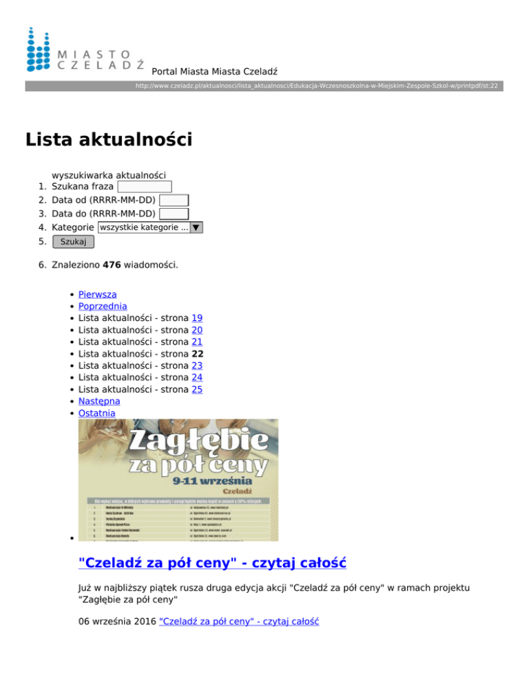 Portal Miasta Miasta Czeladź http://www.czeladz.pl/aktualnosci/lista_aktualnosci/Edukacja-Wczesnoszkolna-w-Miejskim-Zespole-Szkol-w/printpdf/st:22 Lista aktualności wyszukiwarka aktualności 1. Szukana fraza 2. Data od (RRRR-MM-DD) 3. Data do (RRRR-MM-DD) 4. Kategorie wszystkie kategorie ... ▼ 5. Szukaj 6. Znaleziono 476 wiadomości. Pierwsza Poprzednia Lista aktualności - strona 19 Lista aktualności - strona 20 Lista aktualności - strona 21 Lista aktualności - strona 22 Lista aktualności - strona 23 Lista aktualności - strona 24 Lista aktualności - strona 25 Następna Ostatnia "Czeladź za pół ceny" - czytaj całość Już w najbliższy piątek rusza druga edycja akcji "Czeladź za pół ceny" w ramach projektu "Zagłębie za pół ceny" 06 września 2016 "Czeladź za pół ceny" - czytaj całość Prosto z Iranu - czytaj całość MBP Filia nr 2 zaprasza we wrześniu do oglądania kolejnej ekspozycji fotografii podróżniczej. 06 września 2016 Prosto z Iranu - czytaj całość II Nocny Amatorski Turniej Piłki Nożnej - czytaj całość 10 drużyn stanęło do rywalizacji w ramach II Nocnego Turnieju Piłkarskiego o Puchar Burmistrza Miasta Czeladź 06 września 2016 II Nocny Amatorski Turniej Piłki Nożnej - czytaj całość Rodzinny Rajd Rowerowy - czytaj całość W sobotę dnia 03.09.2016 r odbył się V Rodzinny Rajd Rowerowy. W imprezie wzięło udział kilkadziesiąt osób w różnym wieku. 06 września 2016 Rodzinny Rajd Rowerowy - czytaj całość Festyn rodzinny w Parku Jordan - czytaj całość 4 września na placu zabaw w Parku Jordan odbył się festyn z okazji otwarcia nowej strefy aktywności rodzinnej. 05 września 2016 Festyn rodzinny w Parku Jordan - czytaj całość Festyn Zdrowia - czytaj całość Burmistrz Miasta Zbigniew Szaleniec zaprasza na Rynek 7 września w godzinach od 9.30 do 14.00. 05 września 2016 Festyn Zdrowia - czytaj całość Osłonięcie rzeźby "Czeladzkiej Czarownicy" - czytaj całość W sobotę, 3 września odsłonięto rzeźbę Katarzyny Włodyczkowej "Czeladzkiej Czarownicy". 05 września 2016 Osłonięcie rzeźby "Czeladzkiej Czarownicy" - czytaj całość Nowy Rok Szkolny 2016/2017 uroczyście rozpoczęty! czytaj całość Uroczysta inauguracja Nowego Roku Szkolnego w naszym mieście odbyła się w tym roku w Szkole Podstawowej Nr 3 im. Janusza Korczaka. 02 września 2016 Nowy Rok Szkolny 2016/2017 uroczyście rozpoczęty! - czytaj całość Festyn Rodzinny w Parku Jordan - czytaj całość W niedzielę, 4 września na placu zabaw w Parku Jordan odbędzie się Festyn Rodzinny. 02 września 2016 Festyn Rodzinny w Parku Jordan - czytaj całość Rocznica wybuchu II Wojny Światowej - czytaj całość W czwartek, 1 września o godz. 13.00 pod pomnikiem Pamięci Czeladzian – Ofiar Wojny i Poległych w Obozach Koncentracyjnych przy ul. Katowickiej, odbyły się uroczystości z okazji rocznicy wybuchu II Wojny Światowej. 02 września 2016 Rocznica wybuchu II Wojny Światowej - czytaj całość Pierwsza Poprzednia Lista aktualności - strona 19 Lista aktualności - strona 20 Lista aktualności - strona 21 Lista aktualności - strona 22 Lista aktualności - strona 23 Lista aktualności - strona 24 Lista aktualności - strona 25 Następna Ostatnia