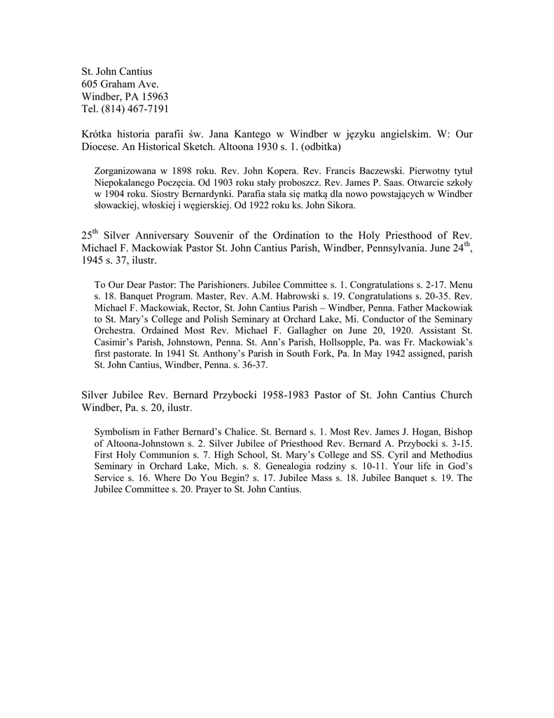 St. John Cantius 605 Graham Ave. Windber, PA 15963 Tel. (814) 467-7191 Krótka historia parafii św. Jana Kantego w Windber w języku angielskim. W: Our Diocese. An Historical Sketch. Altoona 1930 s. 1. (odbitka) Zorganizowana w 1898 roku. Rev. John Kopera. Rev. Francis Baczewski. Pierwotny tytuł Niepokalanego Poczęcia. Od 1903 roku stały proboszcz. Rev. James P. Saas. Otwarcie szkoły w 1904 roku. Siostry Bernardynki. Parafia stała się matką dla nowo powstających w Windber słowackiej, włoskiej i węgierskiej. Od 1922 roku ks. John Sikora. 25th Silver Anniversary Souvenir of the Ordination to the Holy Priesthood of Rev. Michael F. Mackowiak Pastor St. John Cantius Parish, Windber, Pennsylvania. June 24 th, 1945 s. 37, ilustr. To Our Dear Pastor: The Parishioners. Jubilee Committee s. 1. Congratulations s. 2-17. Menu s. 18. Banquet Program. Master, Rev. A.M. Habrowski s. 19. Congratulations s. 20-35. Rev. Michael F. Mackowiak, Rector, St. John Cantius Parish – Windber, Penna. Father Mackowiak to St. Mary’s College and Polish Seminary at Orchard Lake, Mi. Conductor of the Seminary Orchestra. Ordained Most Rev. Michael F. Gallagher on June 20, 1920. Assistant St. Casimir’s Parish, Johnstown, Penna. St. Ann’s Parish, Hollsopple, Pa. was Fr. Mackowiak’s first pastorate. In 1941 St. Anthony’s Parish in South Fork, Pa. In May 1942 assigned, parish St. John Cantius, Windber, Penna. s. 36-37. Silver Jubilee Rev. Bernard Przybocki 1958-1983 Pastor of St. John Cantius Church Windber, Pa. s. 20, ilustr. Symbolism in Father Bernard’s Chalice. St. Bernard s. 1. Most Rev. James J. Hogan, Bishop of Altoona-Johnstown s. 2. Silver Jubilee of Priesthood Rev. Bernard A. Przybocki s. 3-15. First Holy Communion s. 7. High School, St. Mary’s College and SS. Cyril and Methodius Seminary in Orchard Lake, Mich. s. 8. Genealogia rodziny s. 10-11. Your life in God’s Service s. 16. Where Do You Begin? s. 17. Jubilee Mass s. 18. Jubilee Banquet s. 19. The Jubilee Committee s. 20. Prayer to St. John Cantius.