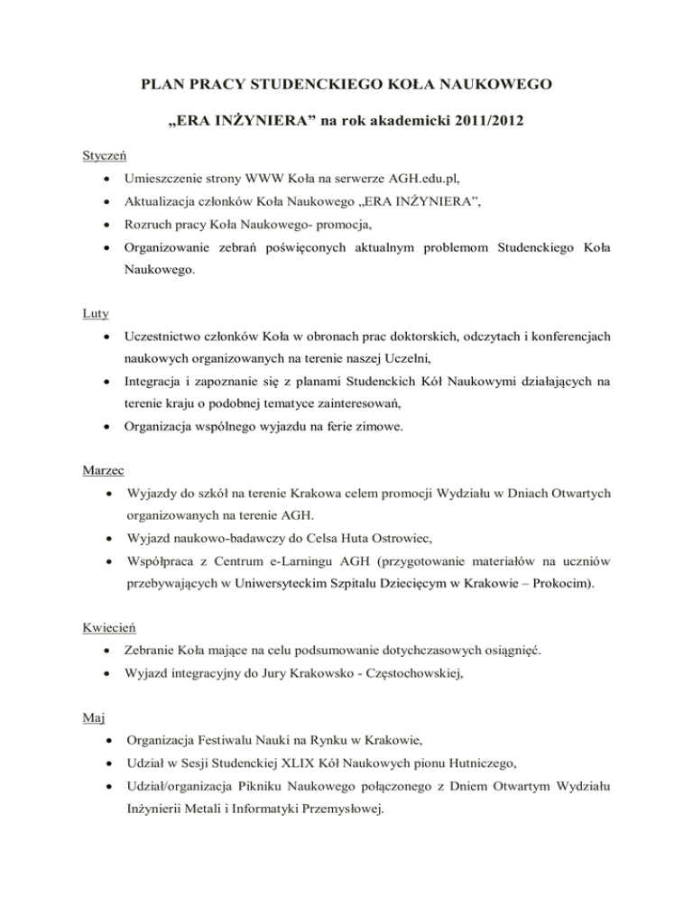 PLAN PRACY STUDENCKIEGO KOŁA NAUKOWEGO „ERA INŻYNIERA” na rok akademicki 2011/2012 Styczeń Umieszczenie strony WWW Koła na serwerze AGH.edu.pl, Aktualizacja członków Koła Naukowego „ERA INŻYNIERA”, Rozruch pracy Koła Naukowego- promocja, Organizowanie zebrań poświęconych aktualnym problemom Studenckiego Koła Naukowego. Luty Uczestnictwo członków Koła w obronach prac doktorskich, odczytach i konferencjach naukowych organizowanych na terenie naszej Uczelni, Integracja i zapoznanie się z planami Studenckich Kół Naukowymi działających na terenie kraju o podobnej tematyce zainteresowań, Organizacja wspólnego wyjazdu na ferie zimowe. Marzec Wyjazdy do szkół na terenie Krakowa celem promocji Wydziału w Dniach Otwartych organizowanych na terenie AGH. Wyjazd naukowo-badawczy do Celsa Huta Ostrowiec, Współpraca z Centrum e-Larningu AGH (przygotowanie materiałów na uczniów przebywających w Uniwersyteckim Szpitalu Dziecięcym w Krakowie – Prokocim). Kwiecień Zebranie Koła mające na celu podsumowanie dotychczasowych osiągnięć. Wyjazd integracyjny do Jury Krakowsko - Częstochowskiej, Maj Organizacja Festiwalu Nauki na Rynku w Krakowie, Udział w Sesji Studenckiej XLIX Kół Naukowych pionu Hutniczego, Udział/organizacja Pikniku Naukowego połączonego z Dniem Otwartym Wydziału Inżynierii Metali i Informatyki Przemysłowej. Czerwiec Nawiązanie współpracy z firmą ITA, Zaplanowanie publikacji naukowych związanych z tematyką prac które zostały wyróżnione na majowej Sesji Studenckiej. Wrzesień Przygotowywanie publikacji. Odbycie praktyk w zaprzyjaźnionych firmach. Październik Prezentacja Studenckiego Koła Naukowego „ERA INŻYNIERA” wśród studentów pierwszego roku, Zebranie Koła mające na celu podsumowanie dotychczasowych osiągnięć i wykonanie planów na następne miesiące nowego roku akademickiego. Uczestnictwo członków Koła w odczytach, seminariach i konferencjach naukowych organizowanych na terenie Uczelni. Listopad Nabór nowych członków Studenckiego Koła Naukowego „ERA INŻYNIERA” i zapoznanie ich z programem i planami. Zaplanowanie andrzejkowego spotkania integracyjnego. Grudzień: Organizacja spotkania wigilijnego, Przygotowanie sprawozdania z pracy koła za rok działalności.