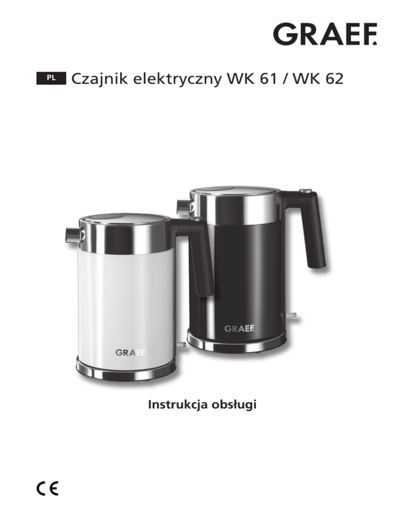 PL Czajnik elektryczny WK 61 / WK 62 Instrukcja obsługi Czajnik elektryczny WK 61 / WK 62 PL Czajnik el. WK 61 Wymiary (dł x szer x wys) Czajnik el. WK 62 220 x 220 x 245 220 x 220 x 245 mm ok. 1.5 ok. 1.5 kg 1.5 1.5 litr 220 - 240 220 - 240 Volt Moc 1850 - 2200 1850 - 2200 Wat Kolor Stal nierdzewna, biały akryl Stal nierdzewna, czarny akryl Waga Pojemność Napięcie zasilania 2 Czajnik elektryczny WK 61 / WK 62 Wstęp Szanowni Państwo. Kupując czajnik elektryczny WK61 / WK62 podjęliście bardzo dobrą decyzję. Produkt ten cieszy się uznaniem klientów z uwagi na wyjątkową jakość. Dziękujemy za dokonanie zakupu i mamy nadzieję, że będziecie mogli Państwo czerpać zadowolenie z użytkowania naszego urządzenia. Przeznaczenie produktu Urządzenie nie jest przeznaczone do zastosowań komercyjnych. Należy go używać wyłącznie do gotowania wody. Nie nadaje się do gotowania zup, mleka czy też innych płynów lub produktów spożywczych w słoikach oraz puszkach. To urządzenie jest przeznaczone do stosowania w gospodarstwach domowych oraz miejscach takich jak: ■■ zaplecza kuchenne (dla personelu sklepów i biur), ■■ gospodarstwa rolne, ■■ przez gości w hotelach, motelach i innych obiektach mieszkalnych. WAŻNE! Należy używać do zastosowań niekomercyjnych! Każde użycie do zastosowań komercyjnych jest niezgodne z przeznaczeniem urządzenia. Uwaga Niewłaściwe użytkowanie może stanowić zagrożenie dla użytkownika. Urządzenie może stwarzać niebezpieczeństwo, jeśli jest użytkowane do celów innych niż przewidziane przez producenta. ■■ Korzystaj z urządzenia tylko zgodnie z przeznaczeniem. ■■ Postępuj zgodnie z procedurami opisanymi w niniejszej instrukcji obsługi. Producent nie ponosi odpowiedzialności za uszkodzenia w związku z niewłaściwym użytkowaniem produktu, a reklamacje z tego tytułu są nieuprawnione. Ryzyko uszkodzenia urządzenia w związku z niezgodnym z przeznaczeniem użytkowaniem sprzętu ponosi wyłącznie użytkownik. PL Ograniczenie odpowiedzialności Wszystkie informacje techniczne, dane i instrukcje dotyczące instalacji, obsługi oraz konserwacji zawarte w niniejszej instrukcji obsługi, są zgodne z najnowszym stanem wiedzy producenta w momencie druku instrukcji. Zostały one przygotowane zgodnie z najlepszą wiedzą, z uwzględnieniem dotychczasowych doświadczeń i spostrzeżeń producenta. Informacje, ilustracje i opisy tej instrukcji nie mogą być podstawą roszczeń w stosunku do producenta. Producent nie ponosi żadnej odpowiedzialności za szkody spowodowane: ■■ niezastosowaniem się do instrukcji, ■■ niewłaściwym użyciem, ■■ nieuprawnioną naprawą, ■■ modyfikacjami technicznymi, ■■ stosowaniem niedozwolonych części zamiennych. Tłumaczenia dokonano z należytą starannością i w dobrej wierze. Nie ponosimy jednak odpowiedzialności za błędy tłumaczenia. Wiążąca pozostaje treść oryginalnego, niemieckiego tekstu instrukcji. Dział obsługi klienta Jeśli urządzenie Graef jest uszkodzone, skontaktuj się ze sprzedawcą, generalnym dystrybutorem lub serwisem producenta. Gebr. Graef GmbH & Co. KG Customer service department Donnerfeld 6, 59757 Arnsberg Tel.: 02932-9703-688 Fax: 02932-9703-90 Email: [email protected] lub Bastra Weindich S.J. 41-503 Chorzów ul. Admieckiego 8 Tel.: 32 770 74 60 Fax: 32 770 79 05 Email: [email protected] 3 Czajnik elektryczny WK 61 / WK 62 Bezpieczeństwo PL Ten rozdział zawiera ważne informacje i instrukcje bezpieczeństwa dotyczące obsługi produktu. Urządzenie to spełnia wymagania przepisów bezpieczeństwa. Niewłaściwe użycie może jednak prowadzić do obrażeń ciała i/lub uszkodzeń mienia. ■■ Przed użyciem powinno się sprawdzić, ■■ Ryzyko porażenia prądem ostrzeżenie Niebezpieczeństwo porażenia przez prąd elektryczny! Dotykanie odkrytych przewodów lub elementów pod napięciem jest śmiertelnie niebezpieczne! Należy przestrzegać zasad wymienionych poniżej, aby uniknąć ryzyka porażenia prądem elektrycznym: ■■ Nie należy używać urządzenia, jeśli przewód lub wtyczka są uszkodzone. ■■ W przypadku uszkodzenia przewodu lub wtyczki, przed przystąpieniem do ponownego użytkowania urządzenia, powinno się usunąć usterkę. Naprawa może być dokonana wyłącznie przez producenta, jego działu obsługi klienta lub wykwalifikowanego specjalistę. ■■ Nigdy nie należy otwierać obudowy urządzenia. Jeśli jest ono pod napięciem, a jego mechaniczne lub elektryczne elementy są dotykane, istnieje niebezpieczeństwo porażenia prądem elektrycznym. ■■ Nigdy nie należy dotykać żadnych części, które są pod napięciem. Kontakt z takimi elementami urządzenia może spowodować porażenie prądem elektrycznym i doprowadzić do śmierci. Instrukcje bezpieczeństwa Celem bezpiecznego użytkowania urządzenia, należy postępować zgodnie z wytycznymi wskazanymi poniżej: ■■ ■■ ■■ ■■ ■■ czy urządzenie posiada zewnętrzne uszkodzenia widoczne na obudowie, kablu lub wtyczce. Nie należy uruchamiać i eksploatować uszkodzonego produktu. W przypadku uszkodzenia przewodu lub wtyczki trzeba usunąć usterkę przed przystąpieniem do ponownego użytkowania urządzenia. Naprawa może być dokonana wyłącznie przez producenta, jego dział obsługi klienta lub wykwalifikowanego specjalistę. Naprawy urządzenia mogą być wykonywane tylko przez uprawniony serwis dystrybutora lub serwis producenta. Naprawy dokonywane przez osoby nieuprawnione mogą stanowić zagrożenie dla bezpieczeństwa użytkownika. Ponadto naprawa produktu przez osobę nieuprawnioną jest jednoznaczna z utratą uprawnień z tytułu gwarancji. Naprawa sprzętu w okresie gwarancji może być dokonana jedynie przez autoryzowany serwis Graef, w przeciwnym razie użytkownik utraci uprawnienia z tytułu gwarancji. W celu naprawy urządzenia wskazane jest stosowanie wyłącznie oryginalnych części zamiennyc