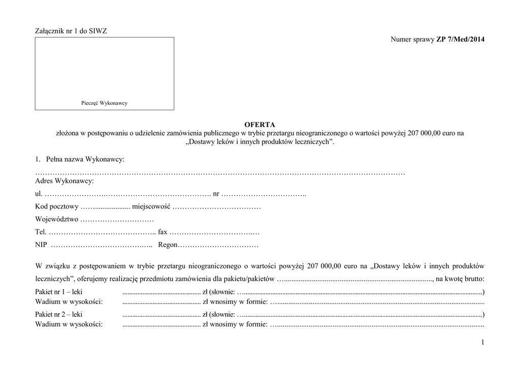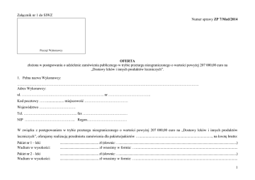Załącznik nr 1 do SIWZ Numer sprawy ZP 7/Med/2014 Pieczęć Wykonawcy OFERTA złożona w postępowaniu o udzielenie zamówienia publicznego w trybie przetargu nieograniczonego o wartości powyżej 207 000,00 euro na „Dostawy leków i innych produktów leczniczych”. 1. Pełna nazwa Wykonawcy: …………………………………………………………………………………………………………………………………… Adres Wykonawcy: ul. …………………….……………………………………. nr …………………………….. Kod pocztowy ……................... miejscowość ……………………………… Województwo ………………………… Tel. …………………………………….. fax …………………………….… NIP ……………………………….….. Regon…………………………… W związku z postępowaniem w trybie przetargu nieograniczonego o wartości powyżej 207 000,00 euro na „Dostawy leków i innych produktów leczniczych”, oferujemy realizację przedmiotu zamówienia dla pakietu/pakietów …................................................................................, na kwotę brutto: Pakiet nr 1 – leki Wadium w wysokości: ............................................... zł (słownie: …...............................................................................................................................................) ............................................... zł wnosimy w formie: …................................................................................................................ Pakiet nr 2 – leki Wadium w wysokości: ............................................... zł (słownie: …...............................................................................................................................................) ............................................... zł wnosimy w formie: …................................................................................................................ 1 Pakiet nr 3 – leki Wadium w wysokości: ............................................... zł (słownie: …...............................................................................................................................................) ............................................... zł wnosimy w formie: …................................................................................................................ Pakiet nr 4 – benzyna medyczna ............................................ zł (słownie: …...............................................................................................................................................) Wadium w wysokości: ............................................... zł wnosimy w formie: …................................................................................................................ Pakiet nr 5 – leki Wadium w wysokości: ............................................... zł (słownie: …...............................................................................................................................................) ............................................... zł wnosimy w formie: …................................................................................................................ Pakiet nr 6 – leki Wadium w wysokości: ............................................... zł (słownie: …...............................................................................................................................................) ............................................... zł wnosimy w formie: …................................................................................................................ Pakiet nr 7 – leki Wadium w wysokości: ............................................... zł (słownie: …...............................................................................................................................................) ............................................... zł wnosimy w formie: …................................................................................................................ Pakiet nr 8 – leki Wadium w wysokości: ............................................... zł (słownie: …...............................................................................................................................................) ............................................... zł wnosimy w formie: …................................................................................................................ Pakiet nr 9 – leki Wadium w wysokości: ............................................... zł (słownie: …...............................................................................................................................................) ............................................... zł wnosimy w formie: …................................................................................................................ Pakiet nr 10 – leki Wadium w wysokości: ............................................... zł (słownie: …...............................................................................................................................................) ............................................... zł wnosimy w formie: …................................................................................................................ Pakiet nr 11 – leki Wadium w wysokości: ............................................... zł (słownie: …...............................................................................................................................................) ............................................... zł wnosimy w formie: …....................................................