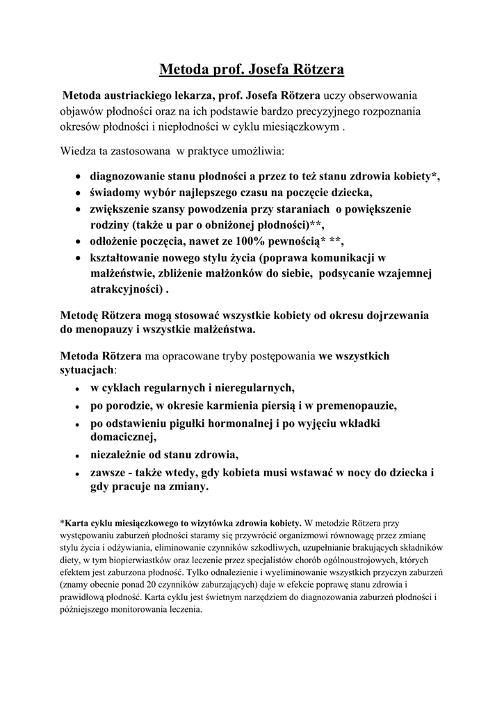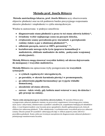 Metoda prof. Josefa Rötzera Metoda austriackiego lekarza, prof. Josefa Rötzera uczy obserwowania objawów płodności oraz na ich podstawie bardzo precyzyjnego rozpoznania okresów płodności i niepłodności w cyklu miesiączkowym . Wiedza ta zastosowana w praktyce umożliwia: diagnozowanie stanu płodności a przez to też stanu zdrowia kobiety*, świadomy wybór najlepszego czasu na poczęcie dziecka, zwiększenie szansy powodzenia przy staraniach o powiększenie rodziny (także u par o obniżonej płodności)**, odłożenie poczęcia, nawet ze 100% pewnością* **, kształtowanie nowego stylu życia (poprawa komunikacji w małżeństwie, zbliżenie małżonków do siebie, podsycanie wzajemnej atrakcyjności) . Metodę Rötzera mogą stosować wszystkie kobiety od okresu dojrzewania do menopauzy i wszystkie małżeństwa. Metoda Rötzera ma opracowane tryby postępowania we wszystkich sytuacjach: w cyklach regularnych i nieregularnych, po porodzie, w okresie karmienia piersią i w premenopauzie, po odstawieniu pigułki hormonalnej i po wyjęciu wkładki domacicznej, niezależnie od stanu zdrowia, zawsze - także wtedy, gdy kobieta musi wstawać w nocy do dziecka i gdy pracuje na zmiany. *Karta cyklu miesiączkowego to wizytówka zdrowia kobiety. W metodzie Rötzera przy występowaniu zaburzeń płodności staramy się przywrócić organizmowi równowagę przez zmianę stylu życia i odżywiania, eliminowanie czynników szkodliwych, uzupełnianie brakujących składników diety, w tym biopierwiastków oraz leczenie przez specjalistów chorób ogólnoustrojowych, których efektem jest zaburzona płodność. Tylko odnalezienie i wyeliminowanie wszystkich przyczyn zaburzeń (znamy obecnie ponad 20 czynników zaburzających) daje w efekcie poprawę stanu zdrowia i prawidłową płodność. Karta cyklu jest świetnym narzędziem do diagnozowania zaburzeń płodności i późniejszego monitorowania leczenia. **W Polsce 15-20% par ma poważne problemy z poczęciem dziecka. Wśród małżeństw stosujących metodę Rotzera ma takie problemy tylko 5% par. Starania o poczęcie w okresie maksymalnej płodności są dużo bardziej efektywne niż działania na chybił-trafił. ***Skuteczności metody Rötzera w odkładaniu poczęcia jest bardzo duża. Skuteczność mierzy się Indeksem Pearla (PI), który tak naprawdę jest współczynnikiem zawodności. PI wyraża liczbowo ilość nieplanowanych poczęć przypadającą na 100 par stosujących dana metodę w ciągu roku lub na 1200 cykli miesiączkowych. Im ten współczynnik niższy, tym metoda pozwala skuteczniej odkładać poczęcie dziecka. Metoda Rötzera jest w odkładaniu poczęcia skuteczniejsza od pigułki. 1) Przy korzystaniu z obu okresów niepłodności: przedowulacyjnej względnej i poowulacyjnej bezwzględnej: PI=0,8 –Badania prof. Rötzera z 1968 i 1978 r. (17 026 cykli); PI=0,9- Badania prof. Rötzera z 1995 r. (30000 cykli). 2) Przy współżyciu wyłącznie w okresie niepłodności poowulacyjnej bezwzględnej przez 50 lat funkcjonowania metody nie zdarzyło się ani jedno poczęcie dziecka ze współżycia w tym okresie, bo jest to fizjologicznie niemożliwe. Takiej pewności nie daje żadna metoda antykoncepcyjna. PI=0- Badania dr A.K. Gosh z 1983 r. Natural family planning (NFP): Evaluation of the Calcutta experience. Paper presented at the 3rd Int Congress of IFFLP, Hongkong 1983; obserwowano 525 par w latach1978-1980 (współżycie wyłącznie w okresie niepłodności poowulacyjnej).
