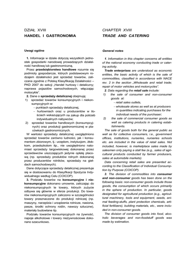 DZIAŁ XVIII CHAPTER XVIII HANDEL I GASTRONOMIA TRADE AND CATERING Uwagi ogólne General notes 1. Informacje w dziale dotyczą wszystkich jednostek gospodarki narodowej prowadzących działalność handlową lub gastronomiczną. Przez przedsiębiorstwa handlowe rozumie się podmioty gospodarcze, których podstawowym rodzajem działalności jest sprzedaż towarów, zaliczana zgodnie z Polską Klasyfikacją Działalności – PKD 2007 do sekcji „Handel hurtowy i detaliczny; naprawa pojazdów samochodowych, włączając motocykle”. 2. Dane o sprzedaży detalicznej obejmują: 1) sprzedaż towarów konsumpcyjnych i niekonsumpcyjnych w: − punktach sprzedaży detalicznej, − hurtowniach oraz u producentów w ilościach wskazujących na zakup dla potrzeb indywidualnych nabywców; 2) sprzedaż towarów handlowych (konsumpcyjnych) oraz produkcji gastronomicznej w placówkach gastronomicznych. W wartości sprzedaży detalicznej uwzględniono sprzedaż towarów zarówno ludności, jak i konsumentom zbiorowym, tj.: urzędom, instytucjom, żłobkom, przedszkolom itp., nie uwzględniono natomiast sprzedaży targowiskowej dokonanej przez sprzedawców uiszczających jedynie opłatę placową (np. sprzedaży produktów rolnych dokonanej przez producentów rolników, sprzedaży na giełdach samochodowych). Dane dotyczące sprzedaży detalicznej prezentuje się w dostosowaniu do Klasyfikacji Spożycia Indywidualnego według Celu (COICOP). 3. Podziału towarów na konsumpcyjne i niekonsumpcyjne dokonano umownie, zaliczając do niekonsumpcyjnych te towary, których zużycie odbywa się głównie w sferze produkcji. Do towarów niekonsumpcyjnych zaliczono w szczególności towary przeznaczone do produkcji rolniczej (np. maszyny, narzędzia i urządzenia rolnicze, nasiona, pasze, środki ochrony roślin, nawozy sztuczne), materiały budowlane itp. Podziału towarów konsumpcyjnych na żywność, napoje alkoholowe i towary nieżywnościowe dokonano szacunkowo. 1. Information in this chapter concerns all entities of the national economy conducting trade or catering activity. Trade enterprises are understood as economic entities, the basic activity of which is the sale of commodities, classified in accordance with NACE rev. 2 in the section „Wholesale and retail trade; repair of motor vehicles and motorcycles”. 2. Data regarding the retail sale include: 1) the sale of consumer and non-consumer goods at: − retail sales outlets, − wholesale stores as well as at producers in quantities indicating purchases for the individual needs of the purchaser; 2) the sale of commercial consumer goods as well as catering products in catering establishments. The sale of goods both for the general public as well as for collective consumers, i.e., government offices, institutions, nurseries, nurseries schools etc. are included in the value of retail sales. Not included, however, is marketplace sales made by salesmen only paying a stall fee (e.g., sales of agricultural products conducted by farmer producers, sales at automobile markets). Data concerning retail sales are presented according to the Classification of Individual Consumption by Purpose (COICOP). 3. The division of commodities into consumer and non-consumer goods has been done on the following basis: non-consumer goods include those goods, the consumption of which occurs primarily in the sphere of production. In particular, goods designated for agricultural production (e.g., agricultural machinery, tools and equipment, seeds, animal feeding-stuffs, plant protection chemicals, artificial fertilizers), building materials, etc., were included in non-consumer goods. The division of consumer goods into food, alcoholic beverages and non-foodstuff goods was made by estimation. TRADE AND CATERING 4. Dane o sprzedaży hurtowej towarów obejmują sprzedaż z magazynów handlowych własnych bądź użytkowanych, w których składowane towary stanowią własność przedsiębiorstwa handlowego. Do wartości sprzedaży hurtowej zalicza się również wartość sprzedaży zrealizowanej na zasadzie bezpośredniej płatności lub kontraktu (agenci, aukcjonerzy), jak również wartość sprzedaży zrealizowanej przez tranzyt rozliczany, polegający na przekazywaniu towarów bezpośrednio od dostawcy do odbiorcy z pominięciem magazynów, które tę dostawę realizują. 5. Sklepy podaje się łącznie z aptekami ogólnodostępnymi. 6. Podziału sklepów według form organizacyjnych dokonano na podstawie wielkości powierzchni sprzedażowej sklepów i rodzaju sprzedawanych w nich towarów. Domy towarowe i handlowe są to sklepy wielodziałowe, prowadzące sprzedaż szerokiego i uniwersalnego asortymentu, głównie towarów nieżywnościowych, o powierzchni sal sprzedażowych: domy towarowe – 2000 m2 i więcej, domy handlowe – od 600 do 1999 m2. Supermarkety są to sklepy o powierzchni sprzedażowej od 400 m2 do 2499 m2 prowadzące sprzedaż głównie w systemie samoobsługowym, oferujące szeroki asortyment artykułów żywnościowych oraz artykuły nieżywnościowe częstego zakupu. Hipermarkety są to sklepy o powierzchni sprzedażowej od 2500 m2 prowadzące sprzedaż głównie w systemie samoobsługowym, oferujące szeroki asortyment artykułów żywnościowych i nieżywnościowych częstego zakupu, zwykle z parkingiem samochodowym. Sklepy powszechne są to sklepy prowadzące sprzedaż głównie towarów żywnościowych codziennego użytku, o powierzchni sal sprzedażowych od 120 do 399 m2. Sklepy wyspecjalizowane są to sklepy prowadzące sprzedaż szerokiego asortymentu artykułów do kompleksowego zaspokojenia określonych potrzeb, np. ubioru, wyposażenia mieszkań, sklepy motoryzacyjne, meblowe, sportowe itp. Do innych sklepów zaliczono sklepy o powierzchni sal sprzedażowych do 119 m2. Podziału sklepów według województw dokonano na podstawie faktycznej lokalizacji sklepu. 7. Do placówek gastronomicznych zaliczono zakłady i punkty gastronomiczne stałe i sezo