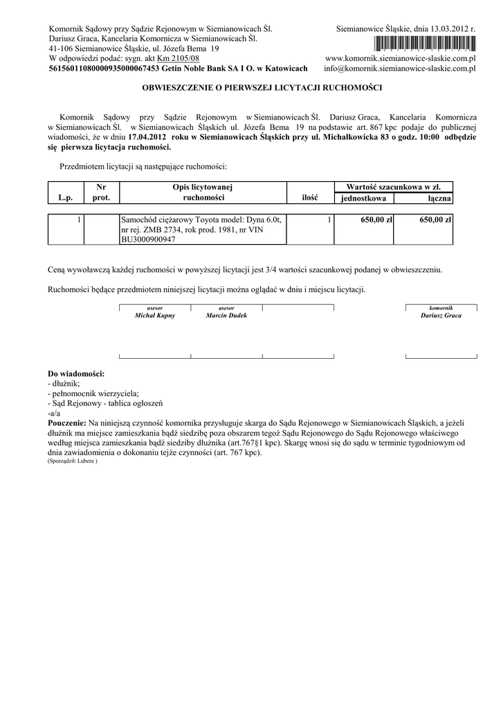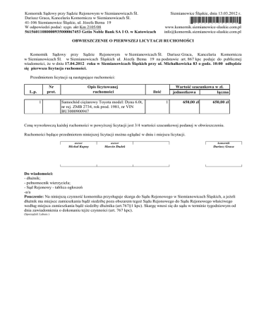 Komornik Sądowy przy Sądzie Rejonowym w Siemianowicach Śl. Dariusz Graca, Kancelaria Komornicza w Siemianowicach Śl. 41-106 Siemianowice Śląskie, ul. Józefa Bema 19 W odpowiedzi podać: sygn. akt Km 2105/08 56156011080000935000067453 Getin Noble Bank SA I O. w Katowicach Siemianowice Śląskie, dnia 13.03.2012 r. *6012031300162* www.komornik.siemianowice-slaskie.com.pl [email protected] OBWIESZCZENIE O PIERWSZEJ LICYTACJI RUCHOMOŚCI Komornik Sądowy przy Sądzie Rejonowym w Siemianowicach Śl. Dariusz Graca, Kancelaria Komornicza w Siemianowicach Śl. w Siemianowicach Śląskich ul. Józefa Bema 19 na podstawie art. 867 kpc podaje do publicznej wiadomości, że w dniu 17.04.2012 roku w Siemianowicach Śląskich przy ul. Michałkowicka 83 o godz. 10:00 odbędzie się pierwsza licytacja ruchomości. Przedmiotem licytacji są następujące ruchomości: Nr prot. L.p. 1 Opis licytowanej ruchomości Samochód ciężarowy Toyota model: Dyna 6.0t, nr rej. ZMB 2734, rok prod. 1981, nr VIN BU3000900947 Wartość szacunkowa w zł. jednostkowa łączna ilość 1 650,00 zł 650,00 zł Ceną wywoławczą każdej ruchomości w powyższej licytacji jest 3/4 wartości szacunkowej podanej w obwieszczeniu. Ruchomości będące przedmiotem niniejszej licytacji można oglądać w dniu i miejscu licytacji. asesor asesor komornik Michał Kupny Marcin Dudek Dariusz Graca Do wiadomości: - dłużnik; - pełnomocnik wierzyciela; - Sąd Rejonowy - tablica ogłoszeń -a/a Pouczenie: Na niniejszą czynność komornika przysługuje skarga do Sądu Rejonowego w Siemianowicach Śląskich, a jeżeli dłużnik ma miejsce zamieszkania bądź siedzibę poza obszarem tegoż Sądu Rejonowego do Sądu Rejonowego właściwego według miejsca zamieszkania bądź siedziby dłużnika (art.767§1 kpc). Skargę wnosi się do sądu w terminie tygodniowym od dnia zawiadomienia o dokonaniu tejże czynności (art. 767 kpc). (Sporządził: Lubera )