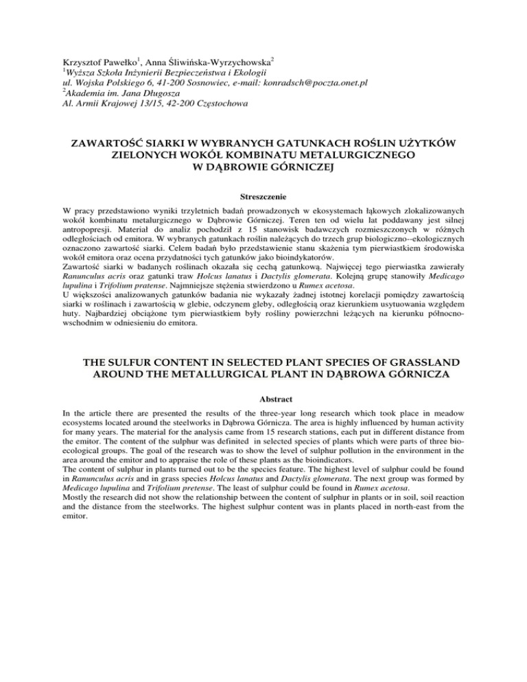 Krzysztof Pawełko1, Anna Śliwińska-Wyrzychowska2 1 Wyższa Szkoła Inżynierii Bezpieczeństwa i Ekologii ul. Wojska Polskiego 6, 41-200 Sosnowiec, e-mail: [email protected] 2 Akademia im. Jana Długosza Al. Armii Krajowej 13/15, 42-200 Częstochowa ZAWARTOŚĆ SIARKI W WYBRANYCH GATUNKACH ROŚLIN UśYTKÓW ZIELONYCH WOKÓŁ KOMBINATU METALURGICZNEGO W DĄBROWIE GÓRNICZEJ Streszczenie W pracy przedstawiono wyniki trzyletnich badań prowadzonych w ekosystemach łąkowych zlokalizowanych wokół kombinatu metalurgicznego w Dąbrowie Górniczej. Teren ten od wielu lat poddawany jest silnej antropopresji. Materiał do analiz pochodził z 15 stanowisk badawczych rozmieszczonych w różnych odległościach od emitora. W wybranych gatunkach roślin należących do trzech grup biologiczno--ekologicznych oznaczono zawartość siarki. Celem badań było przedstawienie stanu skażenia tym pierwiastkiem środowiska wokół emitora oraz ocena przydatności tych gatunków jako bioindykatorów. Zawartość siarki w badanych roślinach okazała się cechą gatunkową. Najwięcej tego pierwiastka zawierały Ranunculus acris oraz gatunki traw Holcus lanatus i Dactylis glomerata. Kolejną grupę stanowiły Medicago lupulina i Trifolium pratense. Najmniejsze stężenia stwierdzono u Rumex acetosa. U większości analizowanych gatunków badania nie wykazały żadnej istotnej korelacji pomiędzy zawartością siarki w roślinach i zawartością w glebie, odczynem gleby, odległością oraz kierunkiem usytuowania względem huty. Najbardziej obciążone tym pierwiastkiem były rośliny powierzchni leżących na kierunku północnowschodnim w odniesieniu do emitora. THE SULFUR CONTENT IN SELECTED PLANT SPECIES OF GRASSLAND AROUND THE METALLURGICAL PLANT IN DĄBROWA GÓRNICZA Abstract In the article there are presented the results of the three-year long research which took place in meadow ecosystems located around the steelworks in Dąbrowa Górnicza. The area is highly influenced by human activity for many years. The material for the analysis came from 15 research stations, each put in different distance from the emitor. The content of the sulphur was definited in selected species of plants which were parts of three bioecological groups. The goal of the research was to show the level of sulphur pollution in the environment in the area around the emitor and to appraise the role of these plants as the bioindicators. The content of sulphur in plants turned out to be the species feature. The highest level of sulphur could be found in Ranunculus acris and in grass species Holcus lanatus and Dactylis glomerata. The next group was formed by Medicago lupulina and Trifolium pretense. The least of sulphur could be found in Rumex acetosa. Mostly the research did not show the relationship between the content of sulphur in plants or in soil, soil reaction and the distance from the steelworks. The highest sulphur content was in plants placed in north-east from the emitor.