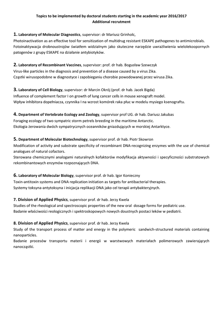 Topics to be implemented by doctoral students starting in the academic year 2016/2017 Additional recrutment 1. Laboratory of Molecular Diagnostics, supervisor: dr Mariusz Grinholc, Photoinactivation as an effective tool for sensitization of multidrug resistant ESKAPE pathogenes to antimicrobials. Fotoinaktywacja drobnoustrojów światłem widzialnym jako skuteczne narzędzie uwrażliwienia wielolekoopornych patogenów z grupy ESKAPE na działanie antybiotyków. 2. Laboratory of Recombinant Vaccines, supervisor: prof. dr hab. Bogusław Szewczyk Virus‐like particles in the diagnosis and prevention of a disease caused by a virus Zika. Cząstki wirusopodobne w diagnostyce i zapobieganiu chorobie powodowanej przez wirusa Zika. 3. Laboratory of Cell Biology, supervisor: dr Marcin Okrój (prof. dr hab. Jacek Bigda) Influence of complement factor I on growth of lung cancer cells in mouse xenograft model. Wpływ inhibitora dopełniacza, czynnika I na wzrost komórek raka płuc w modelu mysiego ksenograftu. 4. Department of Vertebrate Ecology and Zoology, supervisor prof UG. dr hab. Dariusz Jakubas Foraging ecology of two sympatric storm petrels breeding in the maritime Antarctic. Ekologia żerowania dwóch sympatrycznych oceanników gniazdujących w morskiej Antarktyce. 5. Department of Molecular Biotechnology, supervisor prof. dr hab. Piotr Skowron Modification of activity and substrate specificity of recombinant DNA‐recognizing enzymes with the use of chemical analogues of natural cofactors. Sterowana chemicznymi analogami naturalnych kofaktorów modyfikacja aktywności i specyficzności substratowych rekombinantowych enzymów rozpoznających DNA. 6. Laboratory of Molecular Biology, supervisor prof. dr hab. Igor Konieczny Toxin‐antitoxin systems and DNA replication initiation as targets for antibacterial therapies. Systemy toksyna‐antytoksyna i inicjacja replikacji DNA jako cel terapii antybakteryjnych. 7. Division of Applied Physics, supervisor prof. dr hab. Jerzy Kwela Studies of the rheological and spectroscopic properties of the new oral dosage forms for pediatric use. Badanie właściwości reologicznych i spektroskopowych nowych doustnych postaci leków w pediatrii. 8. Division of Applied Physics, supervisor prof. dr hab. Jerzy Kwela Study of the transport process of matter and energy in the polymeric sandwich‐structured materials containing nanoparticles. Badanie procesów transportu materii i energii w warstwowych materiałach polimerowych zawierających nanocząstki.