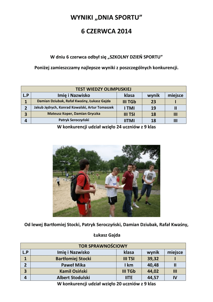 WYNIKI „DNIA SPORTU” 6 CZERWCA 2014 W dniu 6 czerwca odbył się „SZKOLNY DZIEŃ SPORTU” Poniżej zamieszczamy najlepsze wyniki z poszczególnych konkurencji. L.P 1 2 3 4 TEST WIEDZY OLIMPIJSKIEJ Imię i Nazwisko klasa wynik Damian Dziubak, Rafał Kwaśny, Łukasz Gajda III TGb 23 Jakub Jędrych, Konrad Kowalski, Artur Tomaszek I TMI 19 Mateusz Koper, Damian Gryczka III TSI 18 Patryk Seroczyński IITMI 18 W konkurencji udział wzięło 24 uczniów z 9 klas miejsce I II III III Od lewej Bartłomiej Stocki, Patryk Seroczyński, Damian Dziubak, Rafał Kwaśny, Łukasz Gajda L.P 1 2 3 4 TOR SPRAWNOŚCIOWY Imię i Nazwisko klasa wynik Bartłomiej Stocki III TSI 39,32 Paweł Mika I km 40,48 Kamil Osiński III TGb 44,02 Albert Stodulski IITE 44,57 W konkurencji udział wzięło 20 uczniów z 9 klas miejsce I II III IV Od lewej Albert Stodulski, Paweł Mika, Bartłomiej Stocki, Kamil Osiński L.P 1 2 3 4 PLAŻÓWKA DZIEWCZĘTA Imię i Nazwisko klasa wynik Joanna Talarek, Edyta Rodak II TE Angelika Lis, Paulina Zając II TŻ Magdalena Krawczyk, Katarzyna Wójcik II TE Karolina Lipiec, Patrycja Kozduj I TH W konkurencji udział wzięło 22 uczennice z 7 klas Na pierwszym planie Joanna Talarek, Edyta Rodak miejsce I II III IV L.P 1 2 3 4 PLAŻÓWKA CHŁOPCY Imię i Nazwisko klasa wynik Grzegorz Rodak, Maciej Gnyszka I km Dawidek Michał, Sadowski Kamil III TGa Michał Koszara, Szymon Kiliszek III TGb Daniel Owczarczyk, Rafał Grzegrzółka I TMI W konkurencji udział wzięło 24 uczniów z 7 klas miejsce I II III IV Tyłem Maciej Gnyszka, odbija Grzegorz Rodak L.P 1 2 3 4 SKOK W DAL DZIEWCZĘTA Imię i Nazwisko klasa wynik Marta Kruk III TGb 4,03 Małgorzata Bienias I TŻ 3,94 Katarzyna Rybicka I TŻ 3,72 Ewelina Miszkurka II TŻ 3,67 W konkurencji udział wzięło 7 uczennic z 4 klas miejsce I II III IV Marta Kruk otrzymuje dyplom z rąk dyrektora Grzegorza Szymczaka L.P 1 2 3 4 SKOK W DAL CHŁOPCY Imię i Nazwisko klasa wynik Bartłomiej Lipiec III TH 5,76 Bartłomiej Stocki III TSI 5,73 Osiński Kamil III TGb 5,33 Krzysztof Majewski III TGb 5,33 W konkurencji udział wzięło 17 uczniów z 9 klas miejsce I II III IV Na rozbiegu Bartłomiej Lipiec L.P 1 2 3 4 PCHNIĘCIE KULĄ DZIEWCZĘTA Imię i Nazwisko klasa wynik Kalińska Paulina I km 9,13 Katarzyna Czajka II TŻ 7,71 Natalia Matuszewska II TH 7,61 Wioletta Białek I TH 6,31 W konkurencji udział wzięło 8 uczennic z 5 klas miejsce I II III IV Paulina Kalińska dekorowana przez dyrektora Grzegorza Szymczaka L.P 1 2 3 4 PCHNIĘCIE KULĄ CHŁOPCY Imię i Nazwisko klasa wynik Grzegorz Rodak I km 10,25 Łukasz Basek I TMI 10,18 Daniel Witek III TSI 9,91 Mateusz Jawoszek I TG 9,80 W konkurencji udział wzięło 15 uczniów z 9 klas miejsce I II III IV Grzegorz Rodak dekorowany przez dyrektora Grzegorza Szymczaka Razem we wszystkich konkurencjach wystartowało 137 uczniów z 15 klas, kilkoro uczniów wystartowało w więcej niż w jednej konkurencji. Opracował Tomasz Odziemczyk