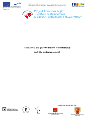 Projekt Comenius Regio Turystyka sentymentalna w edukacji regionalnej i obywatelskiej finansowany jest przez Unię Europejską w ramach program Uczenie się przez całe życie. Projekt Comenius Regio Turystyka sentymentalna w edukacji regionalnej i obywatelskiej Wskazówki dla przewodników-wolontariuszy podróży sentymentalnych PATRONAT HONOROWY: Projekt Comenius Regio Turystyka sentymentalna w edukacji regionalnej i obywatelskiej finansowany jest przez Unię Europejską w ramach program Uczenie się przez całe życie. Projekt Comenius Regio Turystyka sentymentalna w edukacji regionalnej i obywatelskiej Światowa Organizacja Turystyki (UNWTO) definiuje turystykę jako ogół czynności osób, które podróżują i przebywają w celach wypoczynkowych, służbowych lub innych nie dłużej niż rok bez przerwy poza swoim codziennym otoczeniem, z wyłączeniem wyjazdów, w których głównym celem jest aktywność zarobkowa wynagradzana w odwiedzanej miejscowości. Jednym z typów turystyki jest Turystyka Poznawcza a jej gałęzią Turystyka Sentymentalna. Ten ostatni termin oznacza podróże do miejsc urodzenia i pochodzenia, które przybywający do tych miejsc musieli opuścić ze względów osobistych, politycznych lub ekonomicznych. Szkoła, dom kultury, świetlica zajęć pozaszkolnych są doskonałymi miejscami, gdzie nauczyciel lub moderator zajęć edukacyjnych poprzez wdrażanie treści z zakresu edukacji regionalnej może uwrażliwić uczącego się na zjawisko Turystyki Sentymentalnej. Do głównych celów edukacji regionalnej należy według założeń programowych MEN „kształtowanie poczucia własnej tożsamości nie jako postawy separacji, ale jako fundamentu tworzenia postaw otwartych, liberalnych, nastawionych na pluralizm różnych ludzkich kultur i ich zrozumienie”. Istotę edukacji regionalnej, jej znaczenie i główny cel objaśnia nurt, którego przedstawicielem jest Jerzy Nikitorowicz prowadzący badania na Uniwersytecie w Białymstoku. Według jego opinii, edukacji regionalnej przypisuje się jako główny cel „przeciwstawienie się źle pojętej globalizacji, uniformizmowi i dezorganizacji życia społecznego, wyrażając wszak stanowisko, iż przeciwstawienie się tych dwóch tendencji jest szkodliwe dla procesów integracji i demokratyzacji życia”. Wdrażając w procesie edukacyjnym zagadnienie Turystyki Sentymentalnej należy zwrócić uwagę na to, że każdy człowiek ma swoje indywidulane miejsca sentymentalne, które określone są przez osobiste wspomnienia i emocje. Najczęściej miejscami turystyki sentymentalnej są: dom rodzinny, miejsce nauki, uprawiania sportu i wypoczynku a także miejsca ważnych spotkań konkretnego turysty sentymentalnego. PATRONAT HONOROWY: Projekt Comenius Regio Turystyka sentymentalna w edukacji regionalnej i obywatelskiej finansowany jest przez Unię Europejską w ramach program Uczenie się przez całe życie. Projekt Comenius Regio Turystyka sentymentalna w edukacji regionalnej i obywatelskiej Ponadto, w Łodzi, będącej niegdyś miastem wielokulturowym i wielowyznaniowym, za miejsca turystyki sentymentalnej uważane często są te, które są niemymi świadkami bytności wielokulturowej społeczności łodzian w XIX wieku i okresie międzywojennym a także w czasie II wojny światowej. Do najważniejszych należą: Trójwyznaniowy Cmentarz Stary przy ul. Ogrodowej Cmentarz Żydowski przy ul. Brackiej Kościół Ewangelicko-Augsburski św. Mateusza Synagoga przy ul. Rewolucji 1905 r. Archikatedra Rzymsko-Katolicka św. Stanisława Kostki Cerkiew Katedralna św. Aleksandra Newskiego Park Źródliska Park Helenów Osiedle robotnicze Księży Młyn Opracowanie: Anna Rogala Piotr Machlański PATRONAT HONOROWY: