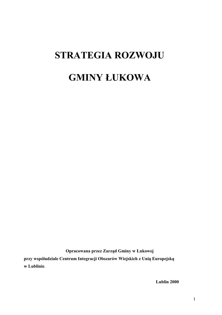 STRATEGIA ROZWOJU GMINY ŁUKOWA Opracowana przez Zarząd Gminy w Łukowej przy współudziale Centrum Integracji Obszarów Wiejskich z Unią Europejską w Lublinie. Lublin 2000 1 SPIS TREŚCI I. WPROWADZENIE____________________________________________________________________ 3 II. DIAGNOZA GMINY __________________________________________________________________ 4 1. Ogólna charakterystyka gminy Łukowa _________________________________________________ 4 2. Historia gminy Łukowa ______________________________________________________________ 5 3. Środowisko naturalne gminy __________________________________________________________ 6 4. Ludność __________________________________________________________________________ 8 5. Infrastruktura techniczna ____________________________________________________________ 15 5.1 Układ drogowo-komunikacyjny___________________________________________________ 15 5.2 Gazyfikacja, energetyka, telekomunikacja___________________________________________ 18 5.3 Gospodarka wodno-ściekowa i zagospodarowanie odpadów ____________________________ 19 6. Rynek pracy______________________________________________________________________ 21 6.1 Pozarolniczy rynek pracy________________________________________________________ 21 6.2 Bezrobocie ___________________________________________________________________ 24 6.3 Rolniczy rynek pracy ___________________________________________________________ 27 7. Sektor rolny ______________________________________________________________________ 28 7.1 Struktura obszarowa gospodarstw rolnych __________________________________________ 31 7.2 Struktura własnościowa gruntów __________________________________________________ 33 7.3 Struktura jakościowa gruntów ____________________________________________________ 34 7.4 Struktura gospodarstw wg celu produkcji ___________________________________________ 35 7.5 Struktura produkcji rolniczej _____________________________________________________ 36 8. Infrastruktura społeczna_____________________________________________________________ 43 8.1 Szkolnictwo i oświata __________________________________________________________ 43 8.2 Opieka zdrowotna i pomoc społeczna ______________________________________________ 49 8.3 Kultura, ochrona zabytków oraz sport ______________________________________________ 51 8.4 Ochrona przeciwpoŜarowa_______________________________________________________ 53 9. III. ANALIZA SWOT ____________________________________________________________________ 55 1. IV. BudŜet gminy Łukowa na rok 2000 ____________________________________________________ 54 Arkusz zbiorczy ___________________________________________________________________ 55 STRATEGIA ROZWOJU GMINY ŁUKOWA ____________________________________________ 59 1. Wprowadzenie ____________________________________________________________________ 59 2. Cele strategiczne __________________________________________________________________ 60 2.1 Rozbudowa infrastruktury technicznej ____________________________________________ 60 2.2 Rozwój rolnictwa ____________________________________________________________ 60 2.3 Rozwój przedsiębiorczości lokalnej i tworzenie nowych miejsc pracy____________________ 61 2.4 Ograniczanie bezrobocia, przystosowanie kwalifikacji siły roboczej do potrzeb gospodarki rynkowej _________________________________________________ 61 2.5 Poprawa stanu zdrowotnego i systemu opieki społecznej______________________________ 62 2.6 Rozwój turystyki i agroturystyki_________________________________________________ 62 2.7 Informacja, Marketing i Promocja gminy __________________________________________ 63 2.8 Systemy finansowego wsparcia strategii rozwoju____________________________________ 63 2.9 Zakończenie ________________________________________________________________ 68 2 I. WPROWADZENIE. Samorząd gminy w Łukowej jako wspólnota samorządowa, jest podstawową formą organizacji Ŝycia społeczno – gospodarczego gminy. Na władzach samorządowych oraz jej organach wykonawczych spoczywa obowiązek sprawnego kierowania i organizowania lokalnego Ŝycia publicznego. Stoją one wobec wielu tradycyjnych i całkiem nowych istotnych problemów, wymagających ich skutecznego rozwiązywania. Stopniowe włączanie Polski do struktur Unii Europejskiej oraz rozwiązywanie stojących przed samorządem problemów i zadań, wymaga od decydentów gminy umiejętności zarządzania strategicznego, bowiem jest to jeden z podstawowych warunków sprawnego funkcjonowania gminy, decydujący o jej prawidłowym rozwoju oraz dający gwarancje osiągnięcia sukcesu w warunkach gospodarki rynkowej. Zarządzanie strategiczne sprowadza się najogólniej rzecz biorąc do opracowania całościowej, kompleksowej koncepcji rozwoju gminy, obejmującej określone długoletnie cele i zamierzenia rozwojowe gminy oraz wynikające z nich konkretne spójne działania, które mogą ulegać modyfikacji, rozszerzeniu i uzupełnieniu w trakcie ich realizacji, ale zawsze w dłuŜszej perspektywie czasowej zmierzają do realizacji wytyczonych celów strategicznych. Ustawa o samorządzie terytorialnym z dnia 08 marca 1990 roku stanowi między innymi o tym, Ŝe do zadań rady gminy naleŜy „ uchwalanie lokalnych programów rozwoju„. Zapis ustawowy o „programach rozwoju” naleŜy, więc traktować jako inspirację do przygotowania czytelnej strategii rozwoju lokalnego, w którym określonoby wyraźnie cele strategicznego rozwoju, ze wskazaniem najwaŜniejszych dróg słuŜących do osiągnięcia sformułowanych celów i zapisem instrumentów, które słuŜą ich realizacji. Przy tworzeniu strategii rozwoju gminy Łukowa, starano się znaleźć odpowiedź na następujące pytania: • W jaki sposób skutecznie wykorzystać szanse i przeciwdziałać zagroŜeniom rozwojowym, • W jaki sposób stymulować procesy rozwoju lokalnej gospodarki, aby stworzyć dogodne warunki dla rozwoju lokalnej przedsiębiorczości oraz loka
