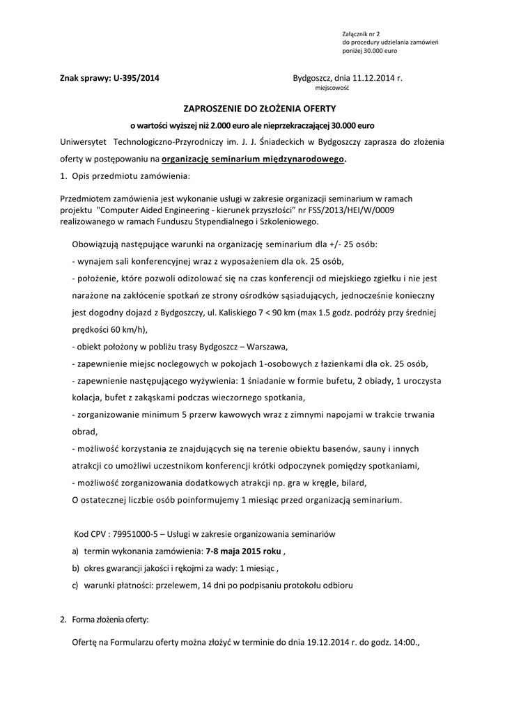 Załącznik nr 2 do procedury udzielania zamówień poniżej 30.000 euro Znak sprawy: U-395/2014 Bydgoszcz, dnia 11.12.2014 r. miejscowość ZAPROSZENIE DO ZŁOŻENIA OFERTY o wartości wyższej niż 2.000 euro ale nieprzekraczającej 30.000 euro Uniwersytet Technologiczno-Przyrodniczy im. J. J. Śniadeckich w Bydgoszczy zaprasza do złożenia oferty w postępowaniu na organizację seminarium międzynarodowego. 1. Opis przedmiotu zamówienia: Przedmiotem zamówienia jest wykonanie usługi w zakresie organizacji seminarium w ramach projektu "Computer Aided Engineering - kierunek przyszłości” nr FSS/2013/HEI/W/0009 realizowanego w ramach Funduszu Stypendialnego i Szkoleniowego. Obowiązują następujące warunki na organizację seminarium dla +/- 25 osób: - wynajem sali konferencyjnej wraz z wyposażeniem dla ok. 25 osób, - położenie, które pozwoli odizolować się na czas konferencji od miejskiego zgiełku i nie jest narażone na zakłócenie spotkań ze strony ośrodków sąsiadujących, jednocześnie konieczny jest dogodny dojazd z Bydgoszczy, ul. Kaliskiego 7 < 90 km (max 1.5 godz. podróży przy średniej prędkości 60 km/h), - obiekt położony w pobliżu trasy Bydgoszcz – Warszawa, - zapewnienie miejsc noclegowych w pokojach 1-osobowych z łazienkami dla ok. 25 osób, - zapewnienie następującego wyżywienia: 1 śniadanie w formie bufetu, 2 obiady, 1 uroczysta kolacja, bufet z zakąskami podczas wieczornego spotkania, - zorganizowanie minimum 5 przerw kawowych wraz z zimnymi napojami w trakcie trwania obrad, - możliwość korzystania ze znajdujących się na terenie obiektu basenów, sauny i innych atrakcji co umożliwi uczestnikom konferencji krótki odpoczynek pomiędzy spotkaniami, - możliwość zorganizowania dodatkowych atrakcji np. gra w kręgle, bilard, O ostatecznej liczbie osób poinformujemy 1 miesiąc przed organizacją seminarium. Kod CPV : 79951000-5 – Usługi w zakresie organizowania seminariów a) termin wykonania zamówienia: 7-8 maja 2015 roku , b) okres gwarancji jakości i rękojmi za wady: 1 miesiąc , c) warunki płatności: przelewem, 14 dni po podpisaniu protokołu odbioru 2. Forma złożenia oferty: Ofertę na Formularzu oferty można złożyć w terminie do dnia 19.12.2014 r. do godz. 14:00., Załącznik nr 2 do procedury udzielania zamówień poniżej 30.000 euro a) w miejscu ul. Kaliskiego 7,Bydgoszcz, budynek RCI, Dział Współpracy Międzynarodowej, pokój 118B Koperta winna być opisana: postępowanie na seminarium CAE b) lub przesłać faksem na nr 52 374 93 99. c) lub przesłać zeskanowaną ofertę na adres email : [email protected] 3. Ocena ofert: przy wyborze oferty decydować będą kryteria: Cena- 50% Lokalizacja – 30% Możliwość spełnienia jak największej liczby wymagań w jednym obiekcie - 20 %. Oferta z najwyższą liczbą punktów zostanie uznana za najkorzystniejszą. W trakcie realizacji zamówienia dopuszcza się wzrost wartości zamówienia do wysokości max. 20% wartości zamówienia określonej w umowie z wykonawcą 4. W załączeniu : a) opis przedmiotu zamówienia b) wzór formularza oferty c) wzór umowy ........................................................ podpis kierownika jednostki organizacyjnej