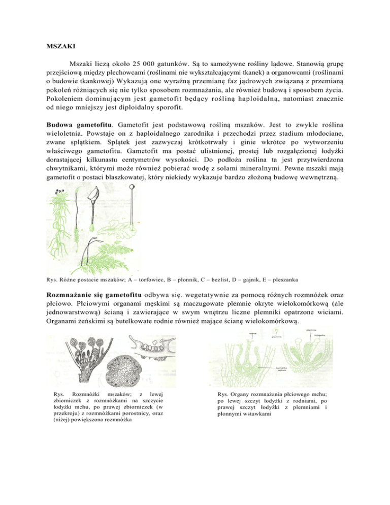 MSZAKI Mszaki liczą około 25 000 gatunków. Są to samożywne rośliny lądowe. Stanowią grupę przejściową między plechowcami (roślinami nie wykształcającymi tkanek) a organowcami (roślinami o budowie tkankowej) Wykazują one wyraźną przemianę faz jądrowych związaną z przemianą pokoleń różniących się nie tylko sposobem rozmnażania, ale również budową i sposobem życia. Pokoleniem dominującym jest gametofit będący rośliną haploidalną, natomiast znacznie od niego mniejszy jest diploidalny sporofit. Budowa gametofitu. Gametofit jest podstawową rośliną mszaków. Jest to zwykle roślina wieloletnia. Powstaje on z haploidalnego zarodnika i przechodzi przez stadium młodociane, zwane splątkiem. Splątek jest zazwyczaj krótkotrwały i ginie wkrótce po wytworzeniu właściwego gametofitu. Gametofit ma postać ulistnionej, prostej lub rozgałęzionej łodyżki dorastającej kilkunastu centymetrów wysokości. Do podłoża roślina ta jest przytwierdzona chwytnikami, którymi może również pobierać wodę z solami mineralnymi. Pewne mszaki mają gametofit o postaci blaszkowatej, który niekiedy wykazuje bardzo złożoną budowę wewnętrzną. Rys. Różne postacie mszaków; A – torfowiec, B – płonnik, C – bezlist, D – gajnik, E – pleszanka Rozmnażanie się gametofitu odbywa się. wegetatywnie za pomocą różnych rozmnóżek oraz płciowo. Płciowymi organami męskimi są maczugowate plemnie okryte wielokomórkową (ale jednowarstwową) ścianą i zawierające w swym wnętrzu liczne plemniki opatrzone wiciami. Organami żeńskimi są butelkowate rodnie również mające ścianę wielokomórkową. Rys. Rozmnóżki mszaków; z lewej zbiorniczek z rozmnóżkami na szczycie łodyżki mchu, po prawej zbiorniczek (w przekroju) z rozmnóżkami porostnicy, oraz (niżej) powiększona rozmnóżka Rys. Organy rozmnażania płciowego mchu; po lewej szczyt łodyżki z rodniami, po prawej szczyt łodyżki z plemniami i płonnymi wstawkami Tym właśnie różnią się one od lęgni plechowców, które są jednokomórkowe i okryte tylko ścianą komórkową. W dolnej części rodni znajduje się komórka jajowa. U gatunków jednopiennych rodnie i plemnie występują na tych samych osobnikach, u dwupiennych - na różnych. Niekiedy zebrane są one w rodniostany i plemnio stany. Proces płciowy zachodzi tylko w obecności wody (w kropli deszczu lub rosy), gdyż gamety męskie (plemniki) mogą poruszać się tylko w środowisku wodnym, w którym przepływają z plemni do rodni. Plemniki „przywabiane" są przez rodnię za pomocą różnych substancji chemicznych (np. kwasu jabłkowego) wydzielanych w jej górnej części (szyjce). Plemniki wnikają do wnętrza rodni, a jeden z nich zlewa się z komórką jajową i powstaje diploidalna zygota. Budowa i rozmnażanie się sporofitu. Z zygoty powstaje roślina diploidalna będąca sporofitem. Sporofit rozwija się początkowo wewnątrz rodni, wrastając dolną swą częścią (tzw. stopą) w gametofit. Rozrastający się sporofit rozrywa rodnię i wyrasta ponad nią, dźwigając na szczycie zarodnie, w której powstają zarodniki. Są one haploidalne, gdyż podczas ich tworzenia się zachodzi mejoza. U niektórych mszaków (mchów właściwych i pewnych wątrobowców) zarodnia osadzona jest na długim, bezlistnym trzonku. Dojrzała zarodnia otwiera się w różny sposób, a wysypujące się z niej zarodniki padają na podłoże, gdzie kiełkują i tworzą splątki. Przemiana pokoleń mszaków wykazuje wyraźną przewagę gametofitu, który jest dość dużą samożywną rośliną, nad znacznie drobniejszym sporofitem. Sporofit jest trwale przez całe życie połączony z gametofitem i odżywia się jego kosztem. Rys. Cykl rozwojowy mszaków na przykładzie skrętka wilgociomierczego Rząd: Mchy właściwe Splątek mchów właściwych jest nitkowaty, rozgałęziony; może z niego wyrastać klika gametofitów. Dojrzały gametofit ma postać prostej lub rozgałęzionej łodyżki. U niektórych gatunków łodyżka wykazuje znaczne zróżnicowanie anatomiczne Część zewnętrzną tworzy wówczas tkanka okrywająca. Pod nią znajduje się kora pełniąca funkcje tkanki mechanicznej. Dalej, w głębi, umieszczona jest prymitywna wiązka przewodząca, której część wewnętrzną tworzą długie, martwe komórki przewodzące wodę, część zewnętrzną komórki żywe, silnie wydłużone i przewodzące produkty asymilacji. Łodyżki pokryte są listkami wykazującymi nieraz dość złożoną budowę; najczęściej zbudowane są z jednej warstwy komórek. Skupienia rodni i plemni są czasem otoczone zmodyfikowanymi listkami i znajdują się na szczycie łodyżki lub jej odgałęzień. Młody sporofit rozrasta się początkowo w rodni, wskutek czego ściana jej pęka u nasady i cała część szyjkowa wyniesiona zostaje na szczycie rosnącego sporofitu, okrywając (jako tzw. czepek) zarodnię. Zarodnia osadzona jest na szczycie długiego trzonka, zwanego setą. Zarodnia ma zazwyczaj kształt walcowaty. Wewnątrz niej znajduje się płonna kolumienka otoczona komorą z zarodnikami. Zarodnia przykryta jest wieczkiem, które odpada w momencie, gdy zarodniki osiągną dojrzałość. Wysypywanie i wysiewanie się zarodników ułatwiają ząbki znajdujące się na brzegu zarodni i wykonujące ruchy pod wpływem zmian wilgotności powietrza. W ścianie zarodni często występują komórki z chloroplastami, wskutek czego sporofit wykazuje pewien stopień niezależności w procesie odżywiania się. Rys. Płonnik; szczegóły budowy: A - fragment przekroju poprzecznego przez łodyżkę gametofitu, B - fragment przekroju poprzecznego przez listek gametofitu Występowanie. Znaczenie w przyrodzie. Mszaki są roślinami lądowymi; tylko niektóre z nich wtórnie przystosowały się do życia w wodzie. Bezpłciowy sposób rozmnażania się za pomocą zarodników również przystosowany jest do środowiska powietrzno-lądowego. Tylko proces