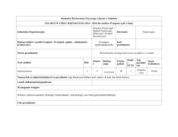 Akademia Wychowania Fizycznego i Sportu w Gdańsku SYLABUS W CYKLU KSZTAŁCENIA 2014 - 2016 dla studiów II stopnia (cykl 2 letni) Katedra Fizjoterapii / Zakład Fizjoterapii Kierunek: Klinicznej i Praktyk Zawodowych Jednostka Organizacyjna: Rodzaj studiów i profil (I stopień / II stopień, ogólno - akademicki / praktyczny): II stopień, ogólnoakademicki Nazwa przedmiotu: Kod przedmiotu: Wszechstonny trening motoryczny na lądzie i w wodzie Tryb studiów Rok niestacjonarne 1 Semest r 2 Rodzaj zajęć ćwiczenia Liczba godzin Punkt y ECTS Typ przedmi otu Język wykładowy 20 2 Fakultat ywny Polski Nauczyciel(-e) odpowiedzialny(-i) za przedmiot: mgr Katarzyna Dulian/ prof. nadzw. dr hab. Jan Jacek Kaczor e-mail: [email protected] Wymagania wstępne: Wiedza z zakresu anatomii, fizjologii, biomechaniki , kinezjologii, oraz kinezygereontoprofilaktyki. Cele przedmiotu: Fizjoterapia Nabycie przez studentów w umiejętności i kompetencji z zakresu motoryczności człowieka na lądzie i wodzie. Zapoznanie się z aspektami rozwojowymi człowieka oraz metodami, formami, środkami wykorzystywanymi w treningu sportowym i zdrowotnym, oraz wskazania braków treningowych powstałych w wyniku prowadzenia niezrównoważonego treningu. Zaprezentowanie i zapoznanie studentów z szerokim wachlarzem ćwiczeń uzupełniających na lądzie i wodzie oraz ich wykorzystaniem w poszczególnych rodzajach treningu. Opis efektów kształcenia dla przedmiotu oraz ich powiązanie z efektami kształcenia dla kierunku: WIEDZA Posiada wiedzę na temat funkcjonowania układów: krążenia, oddechowego oraz aparatu W1 W2 ruchu człowieka i układu nerwowego oraz narządów zmysłów podczas każdego wysiłku K_W06 fizycznego oraz zmian w obrębie funkcjonowania tych układów pod wpływem regularnego treningu motorycznego. Posiada wiedzę w zakresie doboru różnych form aktywności ruchowej adaptacyjnej w rehabilitacji kompleksowej i podtrzymywaniu sprawności osób o różnym stopniu sprawności. Rozumie potrzebę wprowadzania wszechstronnych, uzupełniających ćwiczeń K_W15 fizycznych do podstawowego treningu sportowego i zdrowotnego jako formy prewencji przed kontuzjami oraz wydobycia dodatkowych bodźców treningowych. UMIEJĘTNOŚCI U1 U2 KOMPETENCJE Potrafi tworzyć, weryfikować i modyfikować program usprawniania osób stosownie do ich stanu funkcjonalnego; potrafi wykorzystać różne formy ruchu w celu K_U08, K _U09 kompleksowego rozwoju motorycznego jednostki. Posiada umiejętności organizacji treningu sportowego w różnych formach dla osób o różnym poziomie spawności oraz umiejętności pływackich. Potrafi modyfikować trening K_U24, K_U25 w celu zwiększenia jego wszechstonności. K1 Dostrzega potrzebę oraz kreuje zdrowy styl życia poprzez wprowadzanie wszechstonnego treningu jako holistycznego dbania o rozwój możliwości ruchowych K_K11 człowieka. Kryteria i metody oceny osiągniętych efektów kształcenia: 1. Zaliczenie z ocenę na podstawie przygotowania konspektu zajeć i przeprowadzenia wybranego rodzaju treningu na lądzie i w wodzie. Praca zespołowa (5 osób). 2. Aby uzyskać zaliczenie przedmiotu na ocenę dostateczną student musi osiągnąć wszystkie wymienione przedmiotowe efekty kształcenia. Metody i formy realizacji przedmiotu: Ćwiczenia: zajęcia o charakterze praktycznym. Informacje instruktażowe w toku zajęć. Treści kształcenia: !Ćwiczenia !1. Zapozananie z treściami sylabusa. Zajecia organizacyjne, zapoznanie z tematyką zajęć. Omówienie formy zaliczenia. (1h) 2. Trening wytrzymałościowy na lądzie i w wodzie (2h) 3. Rozgrzewka na lądzie + trening kwasomlekowy w wodzie (2h) 4. Trening oporowy w wodzie (2h) 5. Trening wytrzymałościowo- oporowy w terenie (2h) 6. Trening zdrowotny w formie zabawowej na lądzie i w wodzie (2h) 7. Trening zdrowotny dla osób starszych i niepływających (1h) 8. Trening interwałowy na lądzie + ćwiczenia relaksacyjne i rozluźniające w wodzie. (2h) 9. Zaliczenie przedmiotu na podstawie przygotowanego konspektu i prowadzenia zajęć przez studentów (6h) Forma zaliczenia: Literatura: Zaliczenie z oceną Podstawowa: 1. Brandon Leigh (2010) „Anatomia w treningu szybkości”, Warszawa, wyd. Muza 2. Górna Joanna (2005) „Joga: ruch-oddech-relaks”, Katowice, wyd. Kos 3. Naglak Zbigniew (1979) „Trening sportowy: teoria i praktyka”, Wawszawa, wyd. PWN 4. Osiński Wiesław (1993) „ Motoryczność człowieka- jej struktura, zmienność i uwarunkowania”, Poznań, wyd. AWF Poznań Bilans punktów ECTS (1 pkt ECTS – 25-30 godz. pracy studenta): Aktywność Obciążenie studenta Udział w ćwiczeniach 20 godz. Samodzielne studiowanie tematyki ćwiczeń 10 godz. Konsultacje 4 godz. Praca własna studenta – przygotowanie się do zaliczenia na ocenę –wykonanie projektu praktycznego na ocenę. 16 godz. Całkowite obciążenie pracą studenta Punkty ECTS za przedmiot 50 godz. 2 ECTS