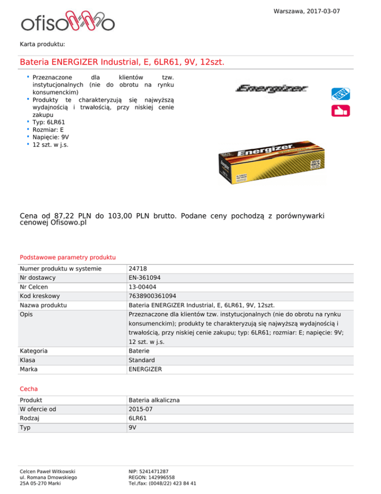 Warszawa, 2017-03-07 Karta produktu: Bateria ENERGIZER Industrial, E, 6LR61, 9V, 12szt. Przeznaczone dla klientów tzw. instytucjonalnych (nie do obrotu na rynku konsumenckim) Produkty te charakteryzują się najwyższą wydajnością i trwałością, przy niskiej cenie zakupu Typ: 6LR61 Rozmiar: E Napięcie: 9V 12 szt. w j.s. Cena od 87,22 PLN do 103,00 PLN brutto. Podane ceny pochodzą z porównywarki cenowej Ofisowo.pl Podstawowe parametry produktu Numer produktu w systemie 24718 Nr dostawcy EN-361094 Nr Celcen 13-00404 Kod kreskowy 7638900361094 Nazwa produktu Bateria ENERGIZER Industrial, E, 6LR61, 9V, 12szt. Opis Przeznaczone dla klientów tzw. instytucjonalnych (nie do obrotu na rynku konsumenckim); produkty te charakteryzują się najwyższą wydajnością i trwałością, przy niskiej cenie zakupu; typ: 6LR61; rozmiar: E; napięcie: 9V; 12 szt. w j.s. Kategoria Baterie Klasa Standard Marka ENERGIZER Cecha Produkt Bateria alkaliczna W ofercie od 2015-07 Rodzaj 6LR61 Typ 9V Celcen Paweł Witkowski ul. Romana Dmowskiego 25A 05-270 Marki NIP: 5241471287 REGON: 142996558 Tel./fax: (0048/22) 423 84 41 Warszawa, 2017-03-07 Karta katalogowa produktu cd. Bateria ENERGIZER Industrial, E, 6LR61, 9V, 12szt. Wymiary Rozmiar E Wymiary (mm) 26,2x13,1 Certyfikaty Hit Hit Nowy produkt w ofercie Standard Wspólny słownik zamówień CPV 31411000-0 Serdecznie zapraszamy do współpracy zespół. Ofisowo.pl Celcen Paweł Witkowski ul. Romana Dmowskiego 25A 05-270 Marki NIP: 5241471287 REGON: 142996558 Tel./fax: (0048/22) 423 84 41