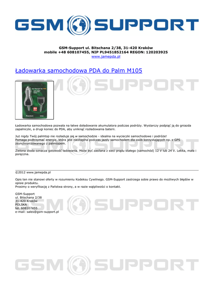 GSM-Support ul. Bitschana 2/38, 31-420 Kraków mobile +48 608107455, NIP PL9451852164 REGON: 120203925 www.jamepda.pl Ładowarka samochodowa PDA do Palm M105 Ładowarka samochodowa pozwala na łatwe doładowanie akumulatora podczas podróży. Wystarczy podpiąć ją do gniazda zapalniczki, a drugi koniec do PDA, aby uniknąć rozładowania baterii. Już nigdy Twój palmtop nie rozładuje się w samochodzie - idealna na wycieczki samochodowe i podróże! Pomaga podtrzymać energię, która jest niezbędna podczas jazdy samochodem dla osób korzystających np. z GPS zsynchronizowanego z palmtopem. Zielona dioda oznacza gotowość ładowania. Może być zasilana z sieci prądu stałego (samochód) 12 V lub 24 V. Lekka, mała i poręczna. ©2012 www.jamepda.pl Opis ten nie stanowi oferty w rozumieniu Kodeksu Cywilnego. GSM-Support zastrzega sobie prawo do możliwych błędów w opisie produktu. Prosimy o weryfikację z Państwa strony, a w razie wątpliwości o kontakt. GSM-Support ul. Bitschana 2/38 31-420 Kraków POLSKA tel. 608107455 e-mail: [email protected] Powered by TCPDF (www.tcpdf.org)