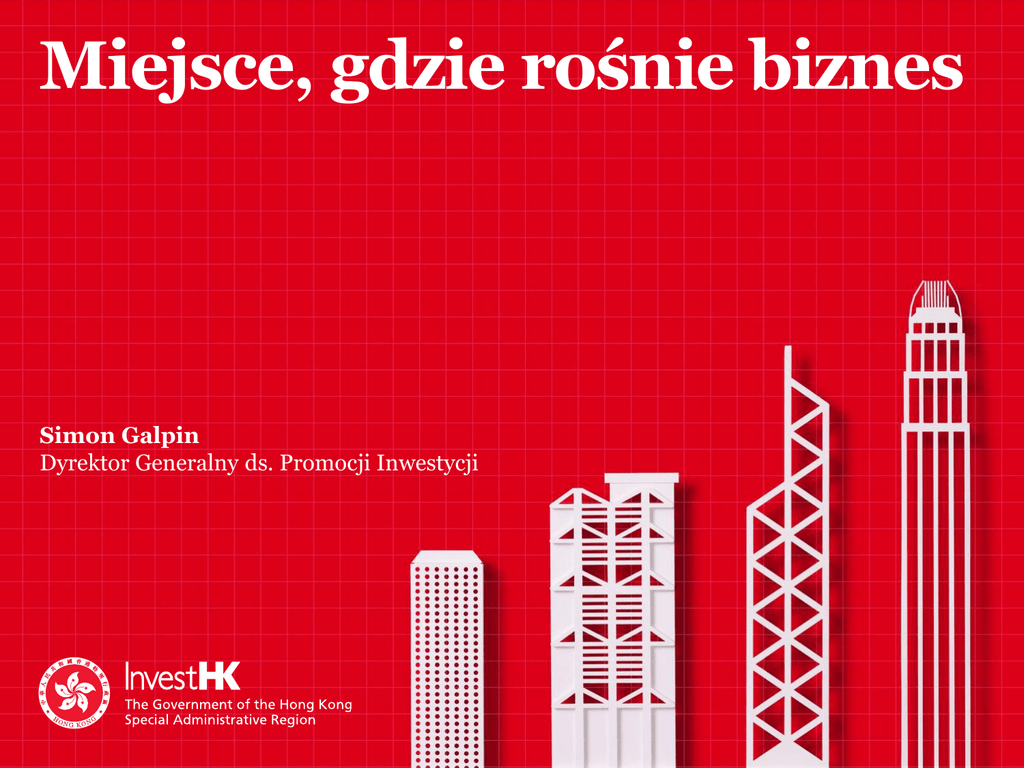 Miejsce, gdzie rośnie biznes Simon Galpin Dyrektor Generalny ds. Promocji Inwestycji 2 Serce Azji 3 4 godziny większość kluczowych 5 godzin rynków w Azji oddalona o cztery godziny lotu samolotem Bliskość Chin od połowy światowej populacji 4 Delta Rzeki Perłowej Populacja 64 mln Eksport PKB Pow. lądowa 527 mld USD 962 mld USD 56 000 km2 > Wielka Brytania, > Wielka Brytania, Włochy, RPA Włochy > Indonezja, Niderlandy, Turcja < Irlandia, Łotwa, Panama, Wirginia Zachodnia (USA) Jeden kraj, dwa systemy 5 6 Niskie podatki i prosty system podatkowy Szanghaj* 25 Singapur 17 20 16.5 15 Hongkong 45 37 16 20 11 17 7 5 5 0 Procent Dochody os. prawn. Dochody os. fiz. Ubezp. społ pracodawcy Ubezp. społ pracownika VAT * Nie istnieją jednolite stawki w Chinach kontynentalnych. Dla przykładu wykorzystano Szanghaj. BRAK • Podatek VAT/od towarów i usług/od sprzedaży • Podatek od dochodów kapitałowych • Podatek u źródła od inwestycji • Podatek spadkowy • Globalne opodatkowanie • Akcyza na wina 7 Światowej klasy infrastruktura ICT 7. na świecie Indeks innowacyjności (INSEAD, 2013) 2. w Azji ICT Development Index (Wskaźnik rozwoju teleinformatycznego) (ITU, październik 2013) 3. w Azji Cloud Readiness Index (Indeks gotowości chmury) (Asia Cloud Computing Association, październik 2012) Najszybszy na świecie dostęp do internetu (Akamai Technologies, 2014) Najbezpieczniejsze miejsce w Azji na założenie centrum danych (Wskaźnik ryzyka centrów danych, Cushman & Wakefield, 2013) Wskaźnik penetracji telefonii komórkowej >237% (OFCA, wrzesień 2013) 8 Kapitał ludzki — wysoka jakość edukacji x2 Dwa uniwersytety w światowym rankingu 100 najlepszych uczelni (Times Higher Education World University Rankings 2013/14) HKUST MBA – 1. w Azji i 8. na świecie (Financial Times Global MBA Ranking 2013) Światowy ranking studiów EMBA 2013: Program Kellogg – HKUST EMBA (Financial Times 2013) x 49 49 międzynarodowych szkół 3. miejsce w Globalnym Indeksie Umiejętności Kognitywnych i Osiągnięć Edukacyjnych (Economic Intelligence Unit 2012) Uczniowie z Hongkongu zajmują pierwsze miejsce na świecie pod względem umiejętności czytania (Progress on International Reading Literacy Study 2011) Relacja biznes-konsument (B2C) Dostęp do 3,7 miliona zamożnych klientów prywatnych (HNWI) w rejonie Azji i Pacyfiku, o majątku wynoszącym w sumie 12 bln USD Najsilniejszy wzrost dobrobytu w rejonie Azji i Pacyfiku wynoszący 12% Hongkong – wzrost HNWI o 36% Przewiduje się, że region Azji i Pacyfiku znajdzie się w czołówce światowego wzrostu majątku HNWI. Oczekiwany wzrost osiągnie 16 bln USD do 2015 roku. Źródło: Capgemini World Wealth Report 2013 • Region Azji i Pacyfiku odpowiada za 50% wzrostu światowego bogactwa od 2010 roku • Szacuje się, że do 2020 roku liczba milionerów w Chinach kontynentalnych i Hongkongu osiągnie 3,7 miliona, a ich majątek wyniesie w sumie 14 bilionów USD Źródło: James Davies, Rodrigo Lluberas i Anthony Shorrocks, Credit Suisse Global Wealth Databook 2011 9 54 miliony odwiedzających w 2013 r. +11,7% Źródło: Hong Kong Tourism Board miliony Liczba odwiedzających osób 60 13.6 13.7 50 13.8 40 30 10.8 11.7 12.7 34.9 11.6 28.1 22.5 20 9.3 10 0 40.7 13.5 7 12.5 13.6 2005 2006 15.5 18.0 8.5 3.8 2000 2003 2007 Chiny kontynentalne 2009 2010 2011 Reszta świata 2012 2013 11 Sprzedaż detaliczna 64 mld USD +11% 84% wiodących światowych marek detalicznych towarów luksusowych i odzieżowych znajduje się w Hongkongu 41% wszystkich międzynarodowych marek detalicznych znajduje się w Hongkongu Liczba sklepów 18 w Hongkongu 13 w Hongkongu 10 w Hongkongu 12 w Londynie 5 w Mediolanie 4 w Mediolanie 12 Relacje B2B 57% 49% 27% 2000 18% 2013 % firm kontynentalnych % kapitalizacji kontynentalnej 797 firm kontynentalnych na giełdzie HKEx; całkowita kapitalizacja giełdowa 1,76 bln USD (dane na grudzień 2013 r.) 2 264 zatwierdzonych nowych projektów inwestycyjnych; kwota inwestycji 43,7 mld USD (dane na 2013 r.) depozyty w RMB w Hongkongu wynoszą 1 053 mld RMB (~173 mld USD) (dane na grudzień 2013 r.) (Źródło: HKEX) (Źródło: MOFCOM) (Źródło: HKMA) 13 Pierwszorzędny kanał inwestycyjny dla BIZ 7 449 firm w 2013 roku, z których 3 835 to siedziby i oddziały regionalne (Źródło: 2013 Annual survey, HKSAR Government’s Census & Statistics Department) Miejsce Napływ BIZ (2012) mld USD Odpływ BIZ (2012) mld USD 1 USA 168 USA 329 2 Chiny 121 Japonia 123 3 Hongkong 75 Chiny 84 4 Brazylia 65 Hongkong 84 5 Bryt. Wyspy Dziewicze 65 Wielka Brytania 71 6 Wielka Brytania 62 Niemcy 67 7 Australia 57 Kanada 54 8 Singapur 57 Rosja 51 9 Rosja 51 Szwajcaria 44 10 Kanada 45 Bryt. Wyspy Dziewicze 42 Źródło: World Investment Report 2013, UNCTAD Operacje globalne w Hongkongu John Rice Wiceprzewodniczący (Operacje globalne) Jeff Urwin Globalny Kierownik Bankowości Inwestycyjnej Jean-Pascal Tricoire Global CEO Christophe Roussel Dyrektor ds. Globalnego Zaopatrzenia Johan de Nysschen Michael Andrew Prezes Globalny (Światowa siedziba główna) przewodniczący Markus Kramer Prezes, Dział środków dyspersyjnych i pigmentów (Światowa siedziba główna) Karen Fifer Globalny Partner Zarządzający, Praktyka Rynków Konsumenckich 14 www.startmeup.hk startmeuphk www.facebook.com/startmeuphk 15 16 Ekosystem start-upów w Hongkongu Około 600-800 start-upów w wieku ok. 30 lat łącznie z firmami w inkubatorach, zlokalizowanych w 80% założycieli start-upów pochodzi z zewnątrz Założenie <2 lata Personel na pełen etat ≤5 Sektory biznesowe • Rozwiązania dla przedsiębiorstw, konsumenckie usługi internetowe, technologie finansowe, energetyka i środowisko, medycyna, edukacja itd. Rozkwitające przestrzenie co-working Liczba przestrzeni co-working w Hongkongu >1 600 przestrzeni 2014 30 startup commune 2010 3 18 Jak możemy pomóc Wydarzenia networkingowe, zapoznanie z usługodawcami Wsparcie PR i marketingowe dla rozpoczęcia/ro