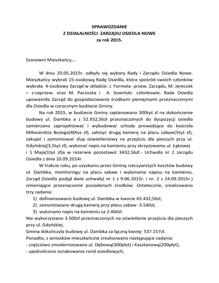 SPRAWOZDANIE Z DZIAŁALNOŚCI ZARZĄDU OSIEDLA NOWE za rok 2015. Szanowni Mieszkaocy,… W dniu 20.05.2015r. odbyły się wybory Rady i Zarządu Osiedla Nowe. Mieszkaocy wybrali 15-osobową Radę Osiedla, która spośród swoich członków wybrała 4-osobowy Zarząd w składzie: J. Formela- przew. Zarządu, M. Jereczek – z-caprzew. oraz M. Paczoska i A. Sowioski- członkowie. Rada Osiedla upoważniła Zarząd do gospodarowania środkami pieniężnymi przeznaczonymi dla Osiedla w corocznym budżecie Gminy. Na rok 2015, w budżecie Gminy zaplanowano 300tyś zł na dokooczenie budowy ul. Dambka a z 52.932,56zł przeznaczonych do dyspozycji osiedla zamierzano zaprojektowad i wybudowad schody prowadzące do kościoła Miłosierdzia Bożego(40tys zł), założyd drugą kamerę na placu zabaw(5tyś zł), zakupid i zamontowad słup oświetleniowy na przejściu dla pieszych przy ul. Gdyoskiej(3,5tyś zł), wykonad napis na kamieniu przy skrzyżowaniu ul. Łąkowej i 1 Maja(1tyś zł)a w rezerwie pozostawid 3432,56zł.- Uchwała nr 2 zarządu Osiedla z dnia 10.09.2014r. W trakcie roku, po uzyskaniu przez Gminę rzeczywistych kosztów budowy ul. Dambka, monitoringu na placu zabaw i wykonania napisu na kamieniu, Zarząd Osiedla podjął dwie uchwały( nr 1 z 9.06.2015r. i nr. 2 z 24.09.2015r.) zmieniające przeznaczenie posiadanych środków. Ostatecznie, zrealizowano trzy zadania: 1) dofinansowano budowę ul. Dambka w kwocie 43.432,56zł, 2) zamontowano drugą kamerę przy placu zabaw -3.540zł, 3) wykonano napis na kamieniu za 2.460zł. Nie wykorzystano 3.500zł przeznaczonych na oświetlenie przejścia dla pieszych przy ul. Gdyoskiej. Gmina dokooczyła budowę ul. Dambka za łączną kwotę 537.157zł. Ponadto, z wniosków mieszkaoców zrealizowano następujące zadania: - częściowo zmodernizowano ul. Dębową(300płyt) i Kasztanową(200płyt), - ujednolicono oznakowanie rond osiedlowych, - odprowadzono do deszczówki wody opadowe z ul. Wierzbowej i Jaśminowej. Dziękujemy Panu Burmistrzowi I Radzie Miejskiej za zrealizowanie powyższych zadao na naszym Osiedlu. Na rok 2016 do dyspozycji Osiedla Gmina przeznaczyła środki w kwocie 57.413,03zł. Zarząd w uchwale nr 3 z 2015r. wskazał następujące zadania: 1) 20.000zł na budowę schodów i chodnika od ul. Dambka w stronę kościoła MB, 2) 35.000zł na kontynuowanie oświetlenia ulic osiedlowych(Cyprysowa3,Leszczynowa-2), 3) 2.431,03zł- do wykorzystania w terminie późniejszym. Zaś Rada Osiedla na zebraniu w dniu 28.09.2015r. podjęła uchwałę składając następujące wnioski do budżetu Gminy na 2016 rok: 1) dofinasowanie budowy: a)schodów i chodnika od ul. Dambka w stronę kościoła MB,- 20.000zł, b)oświetlenia ulic osiedlowych; Dębowej- 2 l., Bukowej-1 l, - 15.000zł, 2) budowę ulicy Jaśminowej w oparciu o dokumentację projektową ulic osiedlowych Jako radny RM złożyłem również wniosek o modernizację ulicy Bukowej płytami YOMB(około 300 płyt). Wg stanu na dzieo 22.04 2016r. budżet na 2016r. uwzględnia tylko zadania ze środków Osiedla. Są w nim także ogólne zadania dotyczące oświetlenia ulic i modernizacji dróg ale bez szczegółowych wskazao. Wobec powyższego występujemy do pana Burmistrza I Rady Miejskiej o podjęcie działao uwzględniających w możliwie najszerszym zakresie wnioski zgłoszone przez Radę i Zarząd Osiedla w zakresie budowy i modernizacji ulic oraz oświetlenia ulic. W szczególności zaś zależy nam na dofinansowaniu zadao zaplanowanych ze środków osiedla. Dziękuję członkom Zarządu i Rady Osiedla za dotychczasową działalnośd na rzecz Osiedla i jego mieszkaoców. Przewodniczący Zarządu Osiedla Jerzy Formela